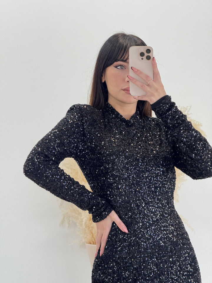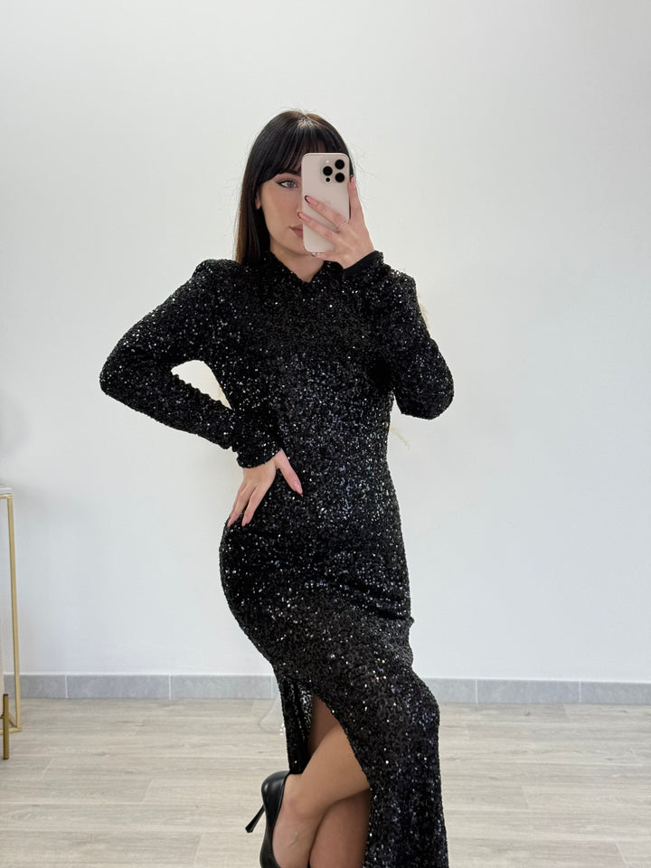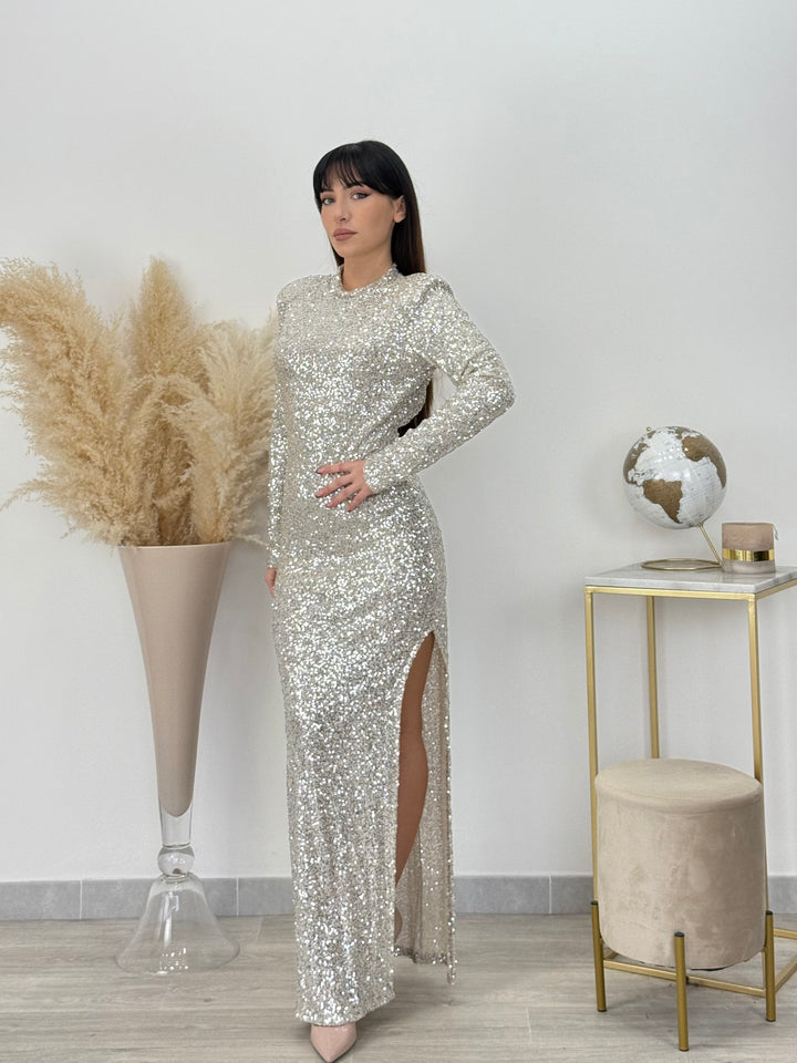 Vieni a scoprire il nostro magnifico abito Diamond. Modello longuette con paillettes ,spacco laterale e scollo sulla schiena. Perfetto per le tue occasioni speciali e non solo . Vestibilità elasticizzata