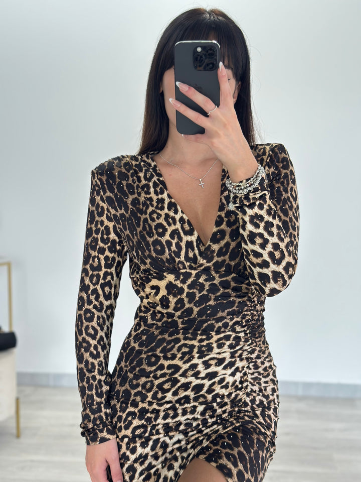 Scopri questo fantastico abito Leopard in lycra fantasia animalier . Modello longuette con spacco e punti luce ovunque .Perfetto per qualsiasi occasione.Vestibiltá elastica.