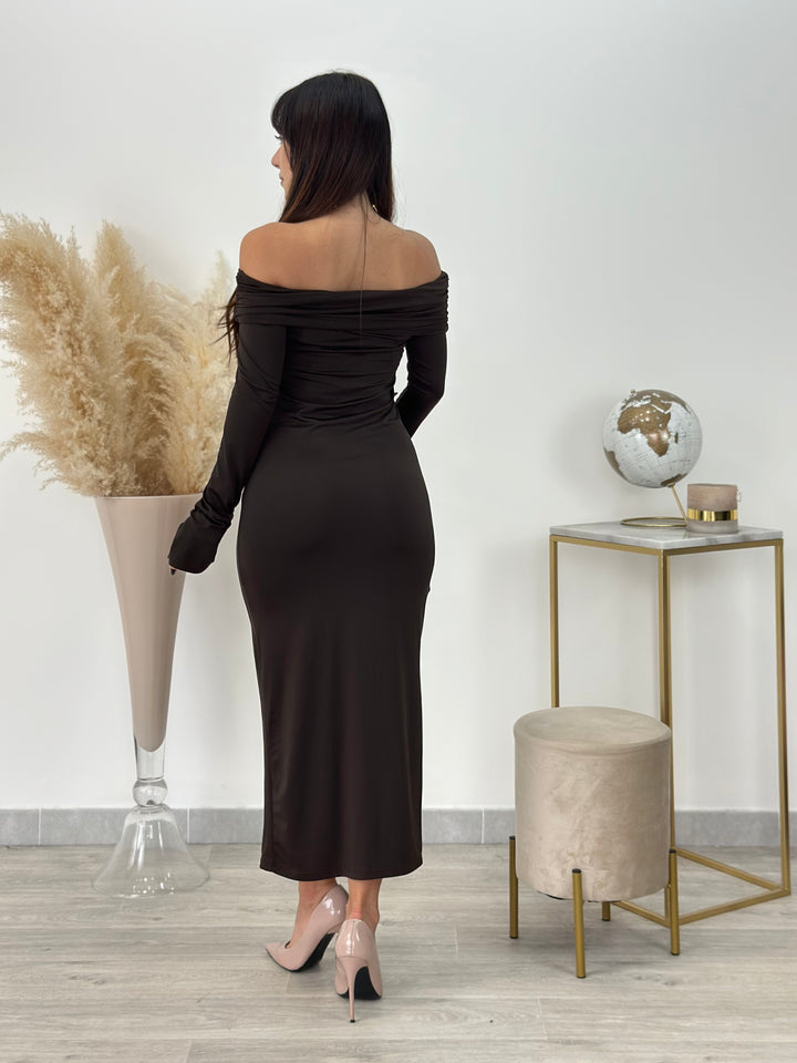 Abito Megan modello a tubino realizzato in lycra di qualità con scollo a barca e spacco sul retro in taglia unica.Perfetto per qualsiasi occasione. Vestibilità elasticizzata.