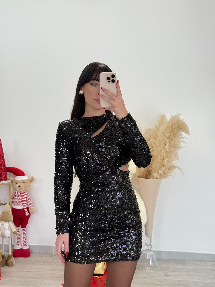 Abito Pailettes cut out è un capo di abbigliamento in paillettes esclusivo e di classe. Abito con maniche lunghe , cut out e scollo nel retro . Vestibiltà elasticizzata.