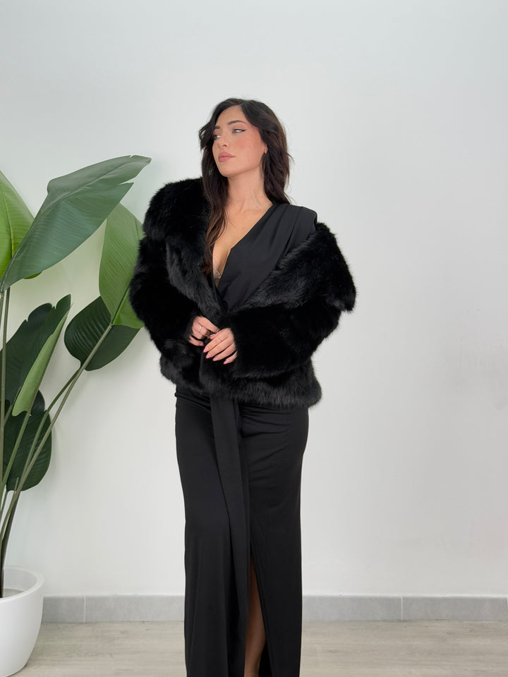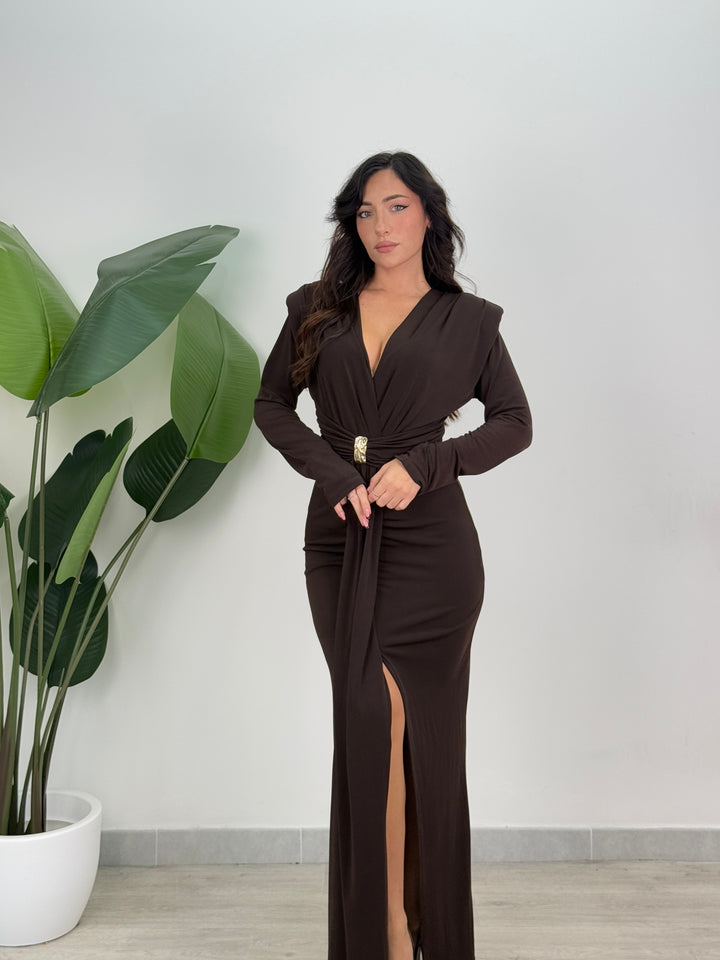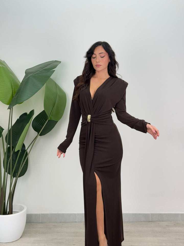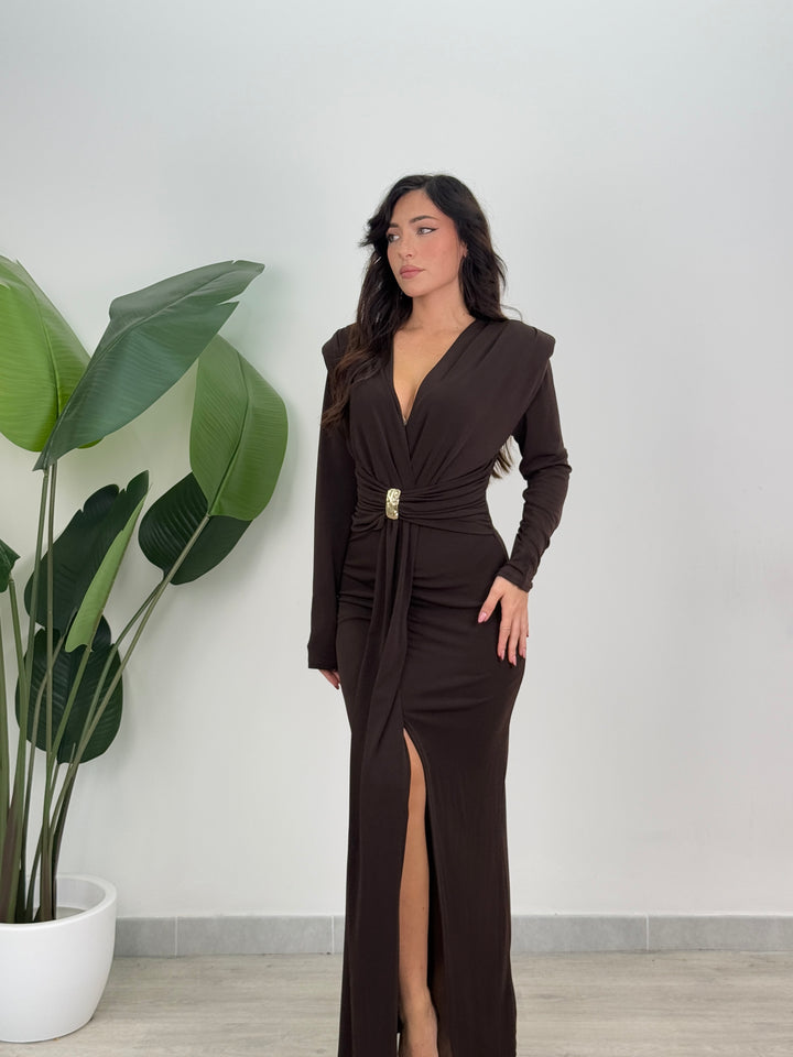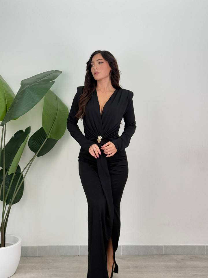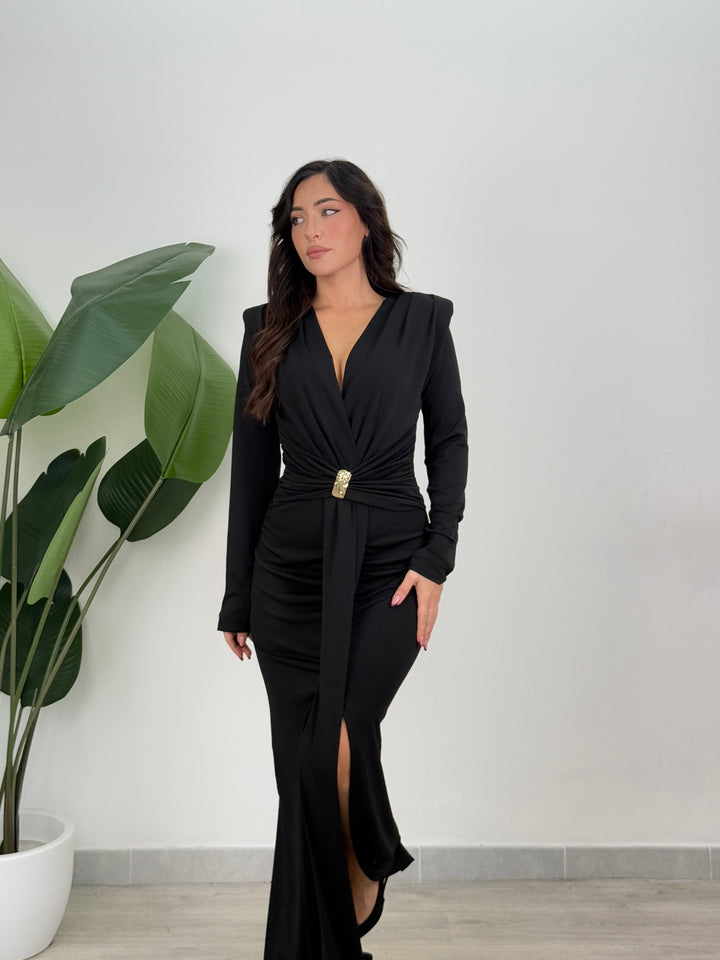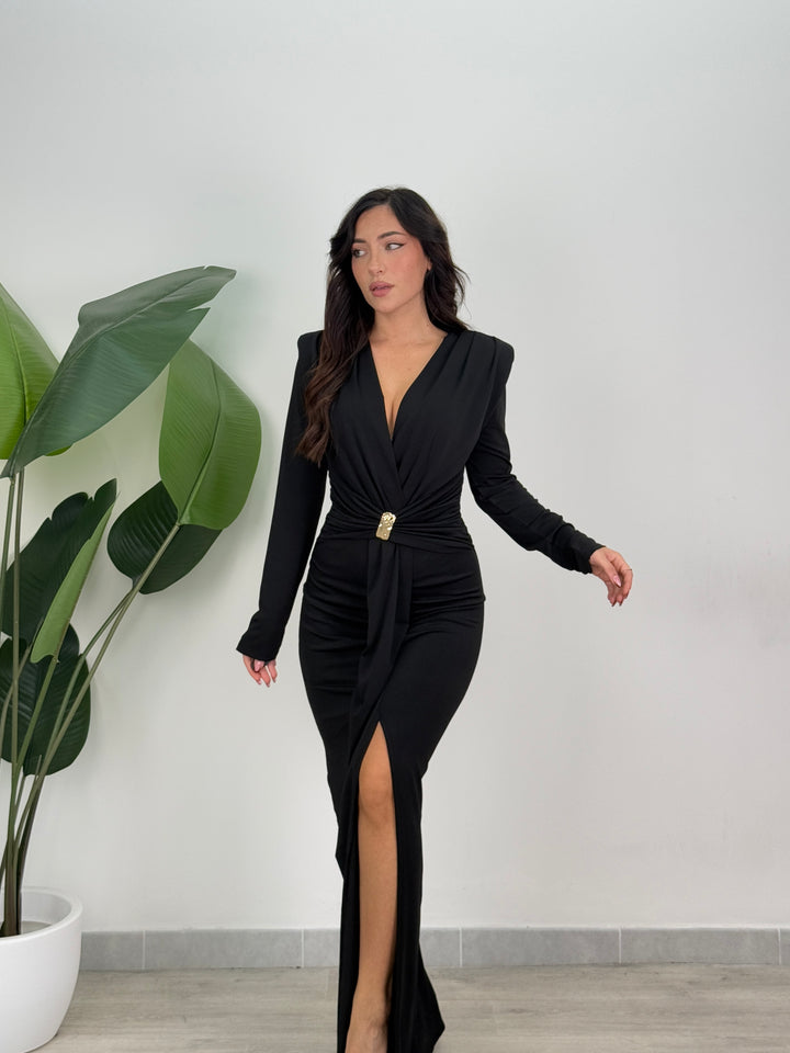 Scopri l’abito Raquel! Abito lungo con scollo a V, maniche lunghe e spacco. Drappeggio in vita con dettaglio gioiello centrale che esalta la silhouette. Perfetto per un look elegante!