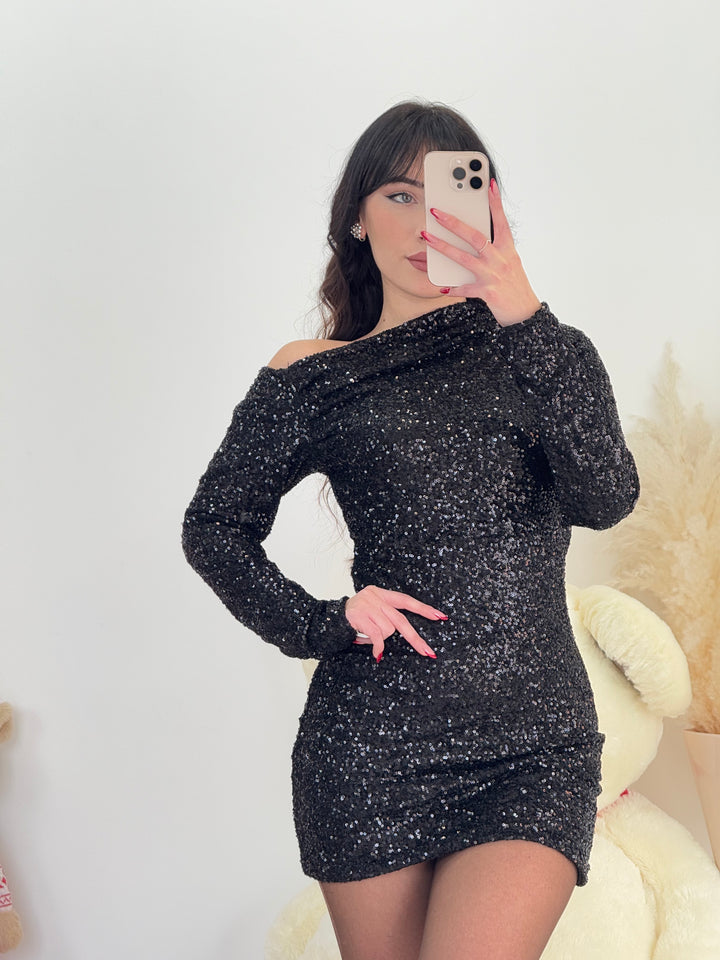 Scopri il nostro abito Roxanne con Pailettes ;un capo fashion Realizzato con paillettes che esaltano la tua femminilità. Modello corto ,scollo asimmetrico e spacco laterale .Perfetto per ogni occasione .Vestibilità elastica.