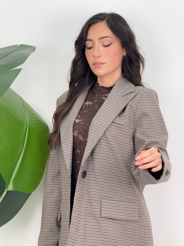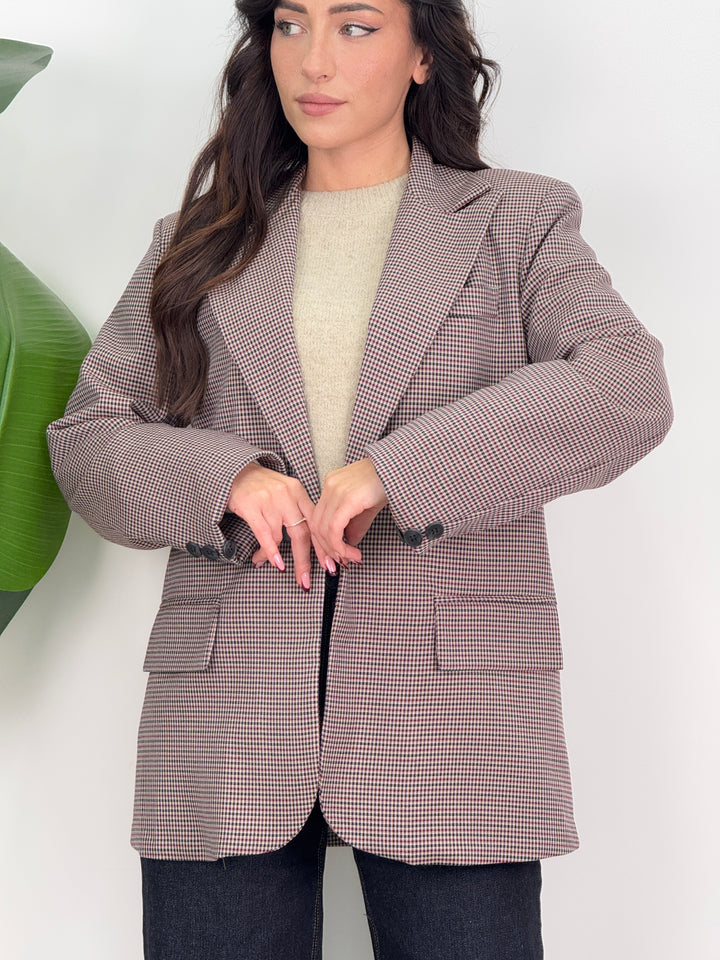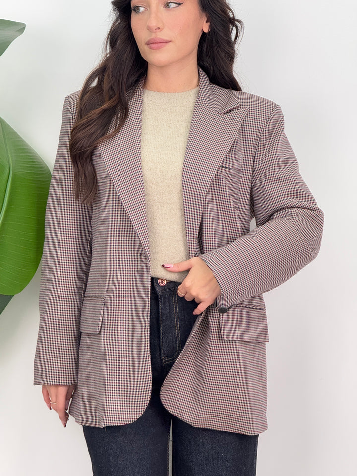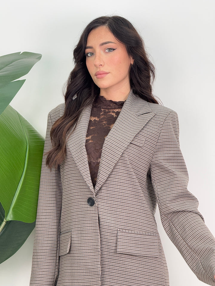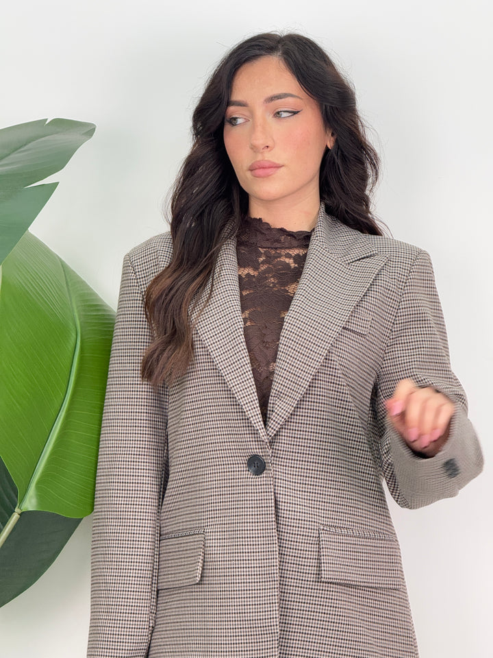 Scopri il blazer Iside! Blazer a microquadretti, con singolo bottone frontale, tasche con pattina e spalle strutturate. Perfetto per qualsiasi outfit!