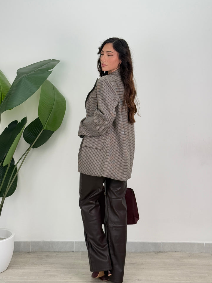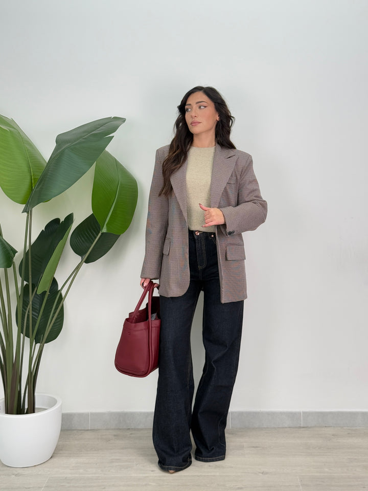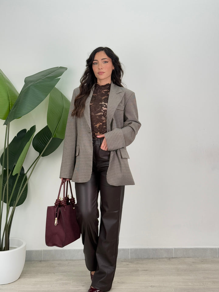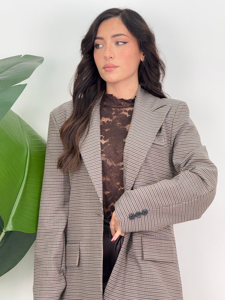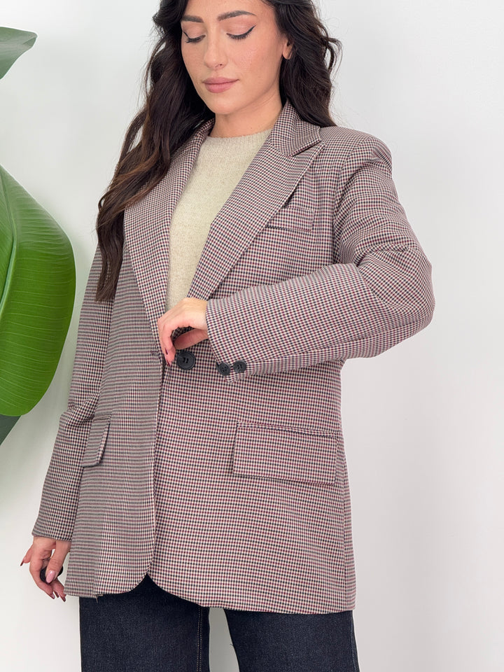 Scopri il blazer Iside! Blazer a microquadretti, con singolo bottone frontale, tasche con pattina e spalle strutturate. Perfetto per qualsiasi outfit!