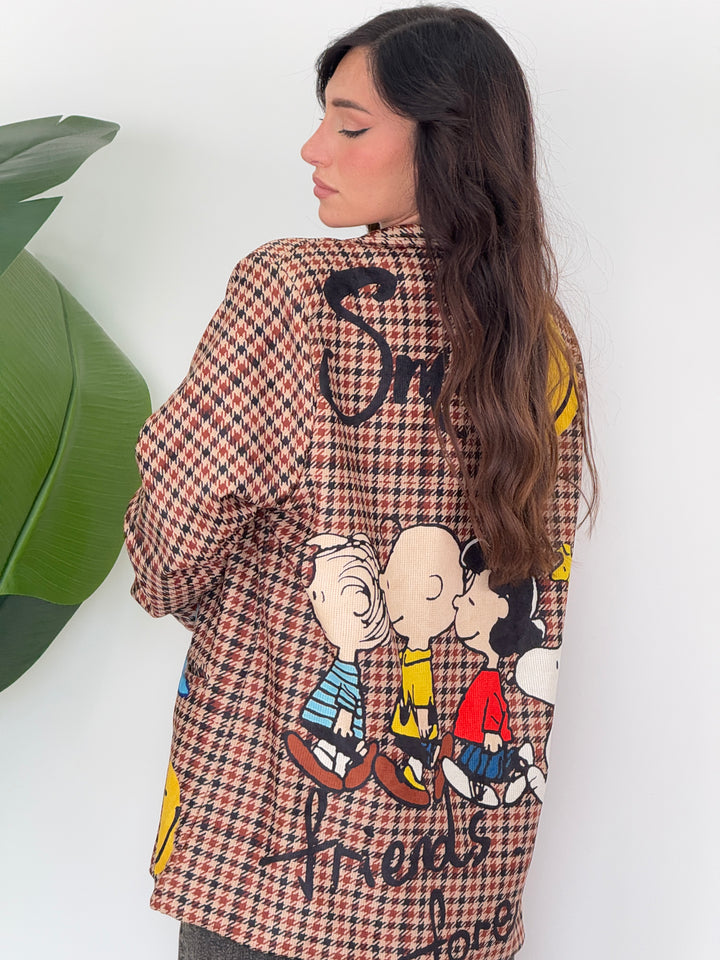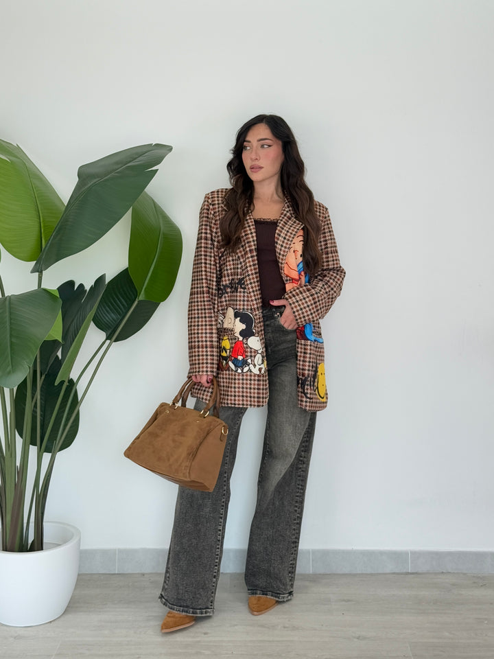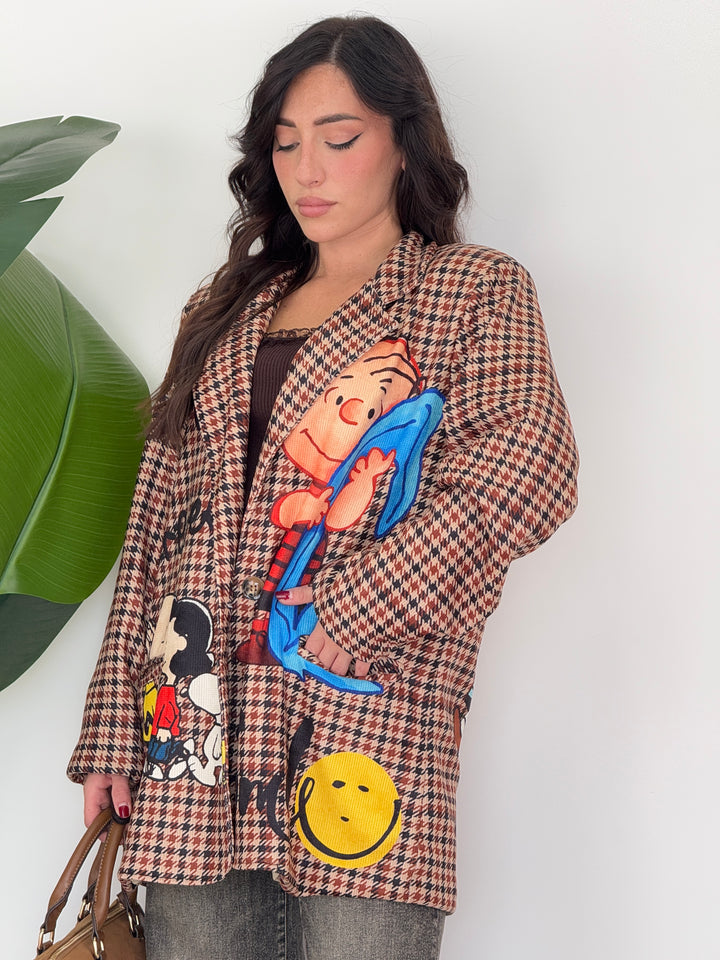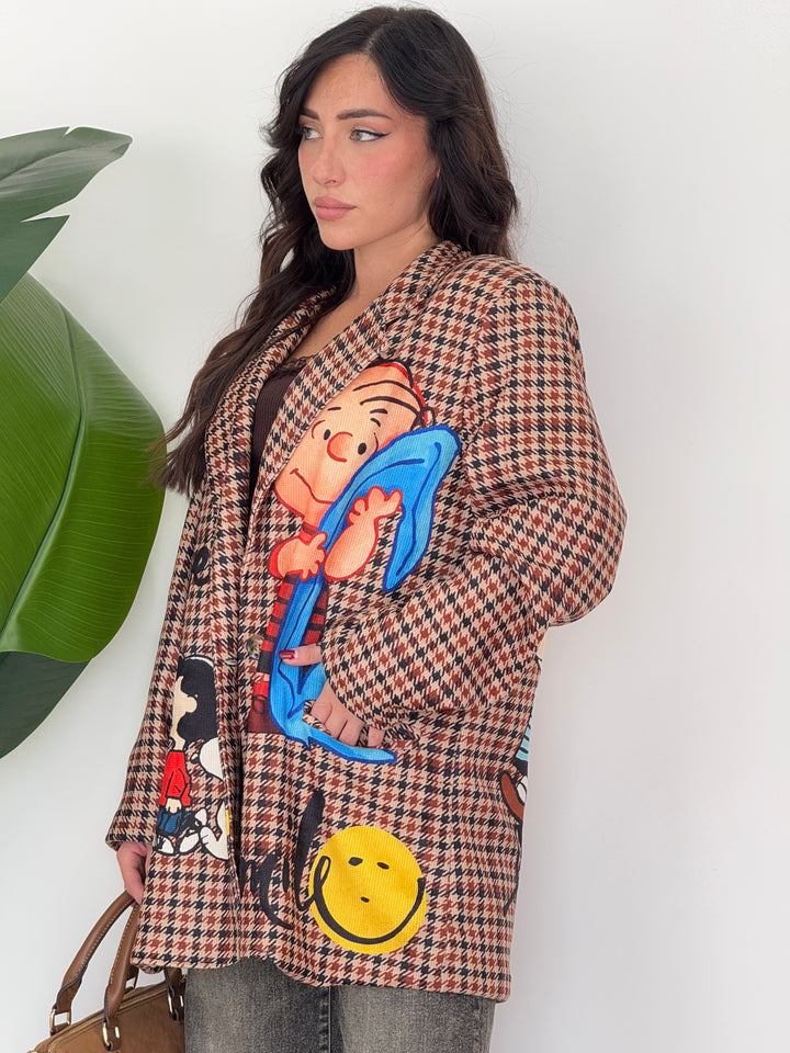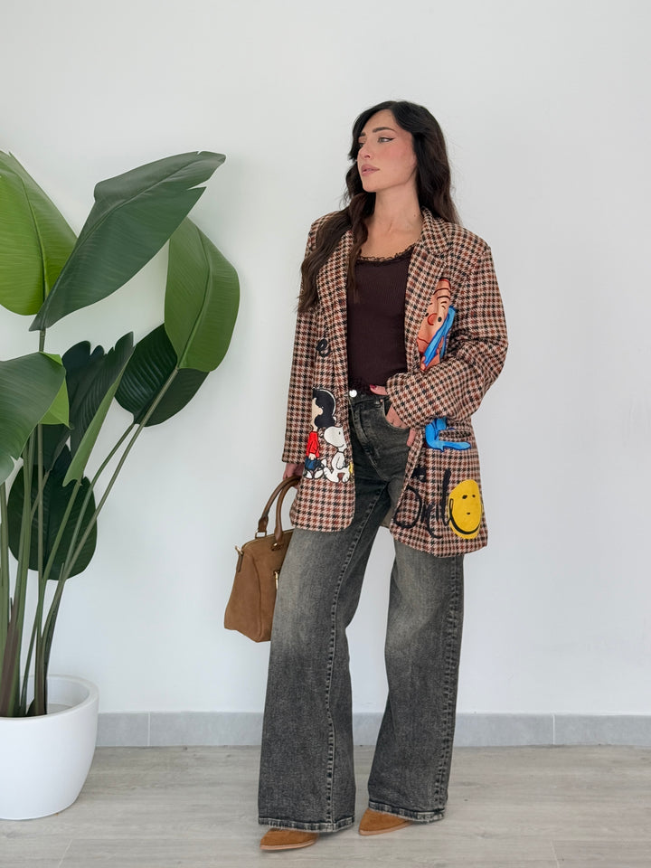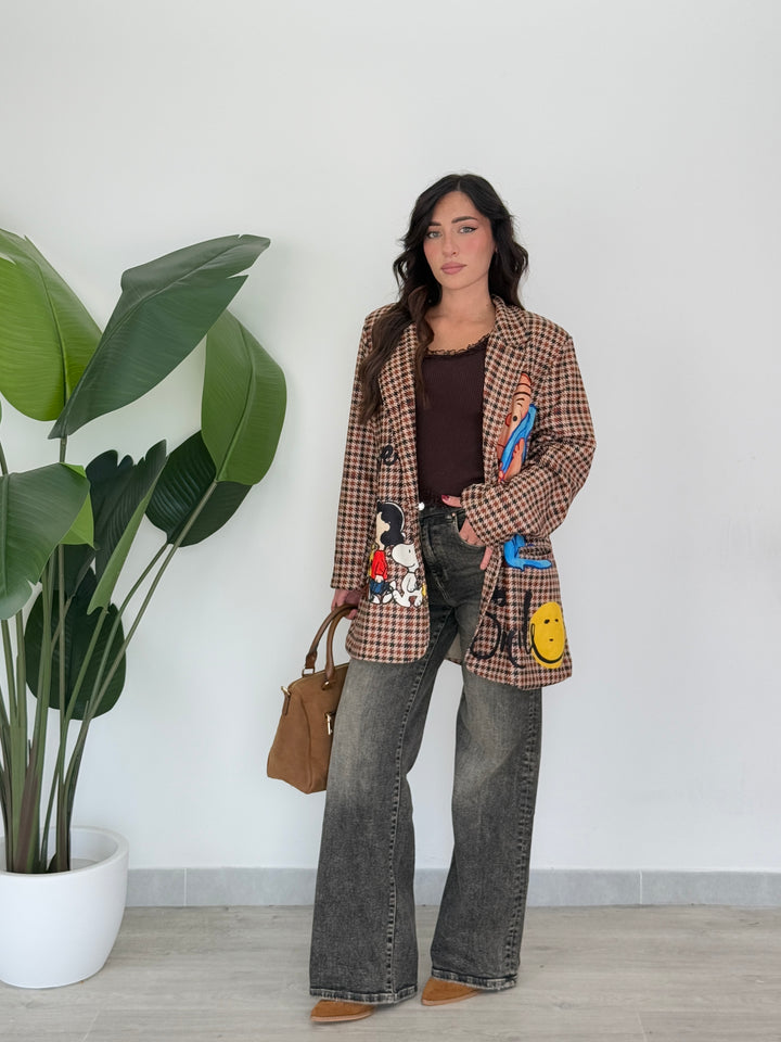 Blazer oversize in panno, con revers classici e chiusura a due bottoni. Decorata con stampe, ha un taglio morbido e contemporaneo. Perfetta per qualsiasi outfit!