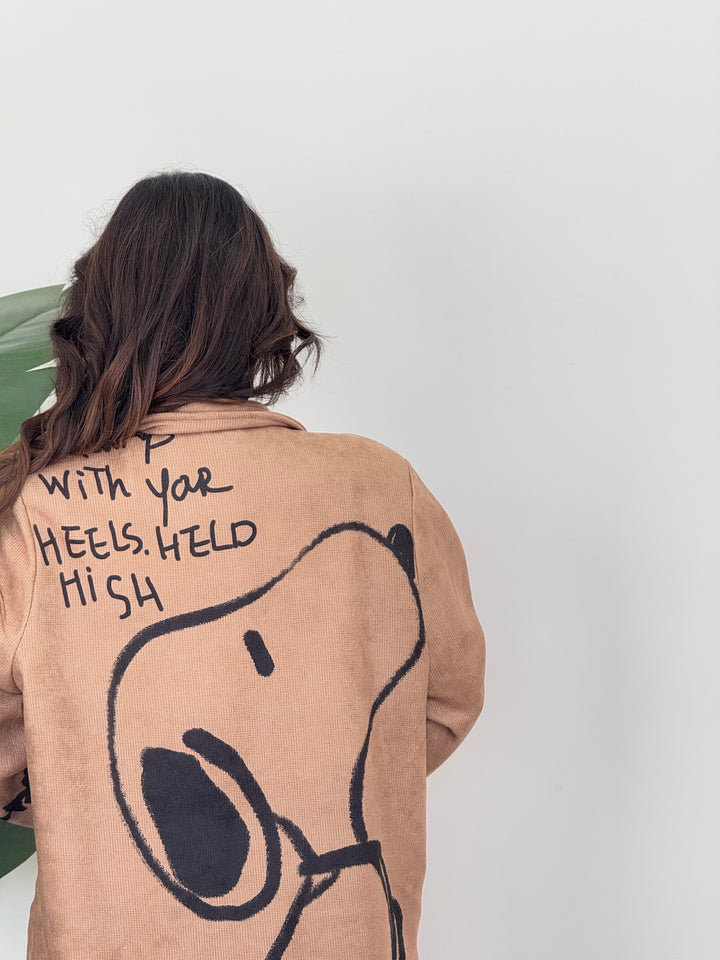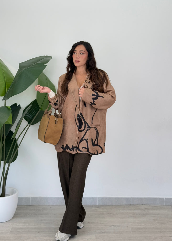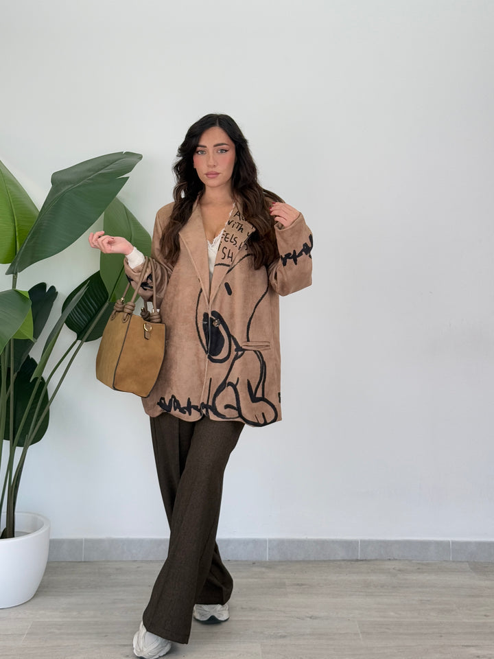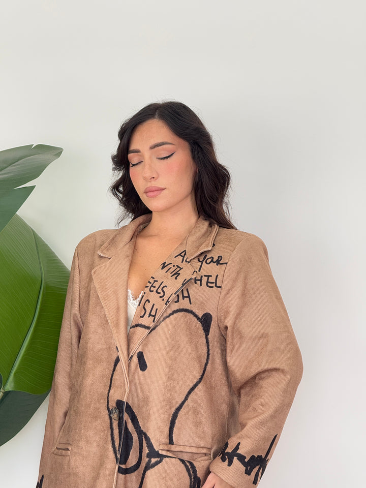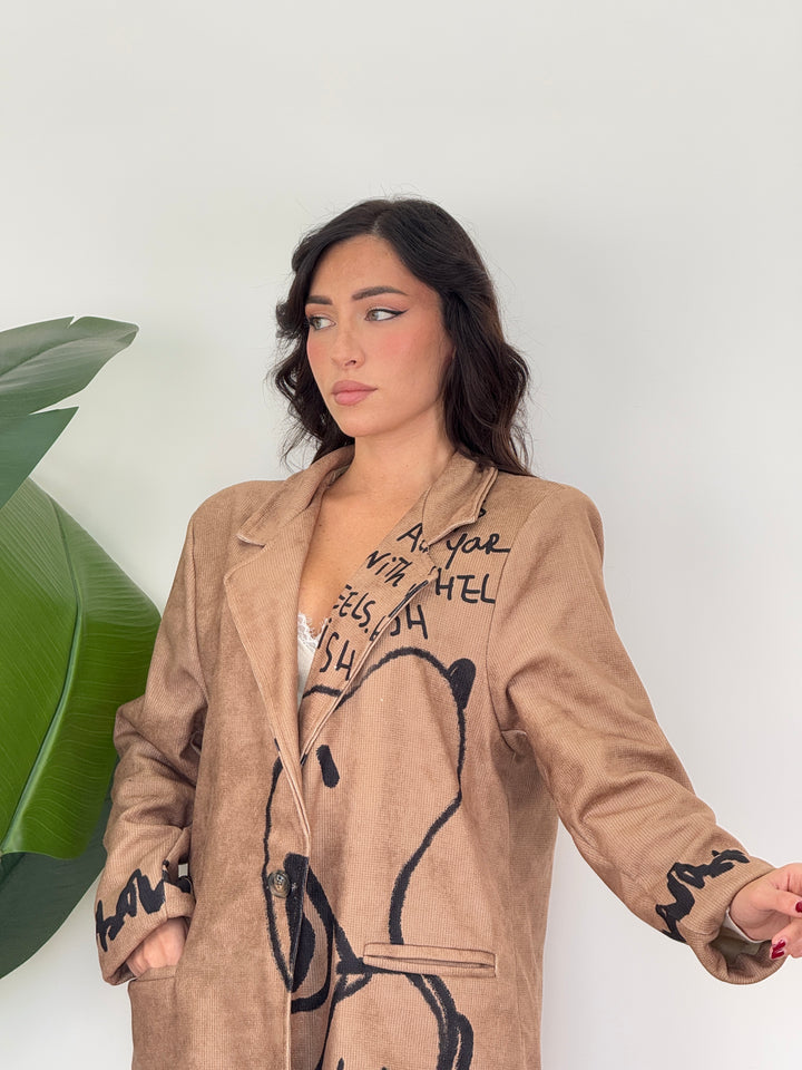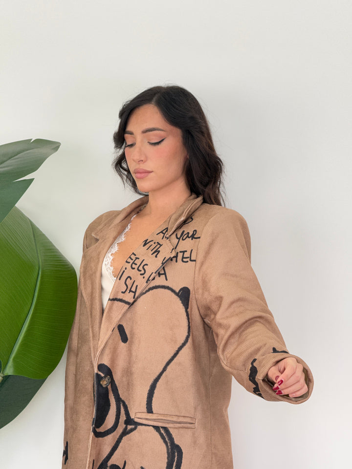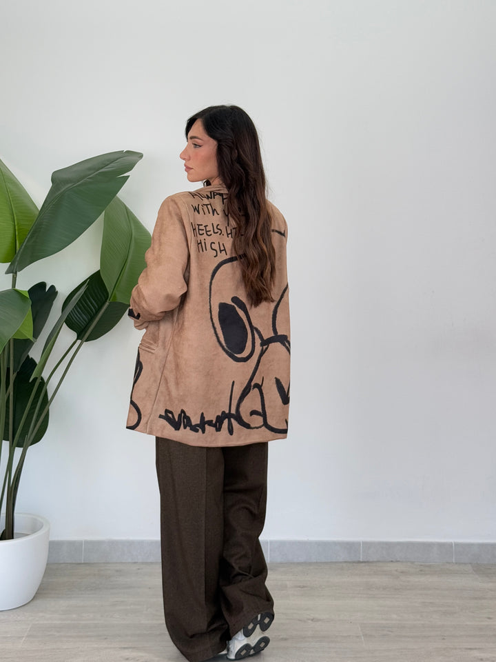 Blazer oversize in panno, con revers classici e chiusura a due bottoni. Decorata con stampa, ha un taglio morbido e contemporaneo. Perfetta per qualsiasi outfit!