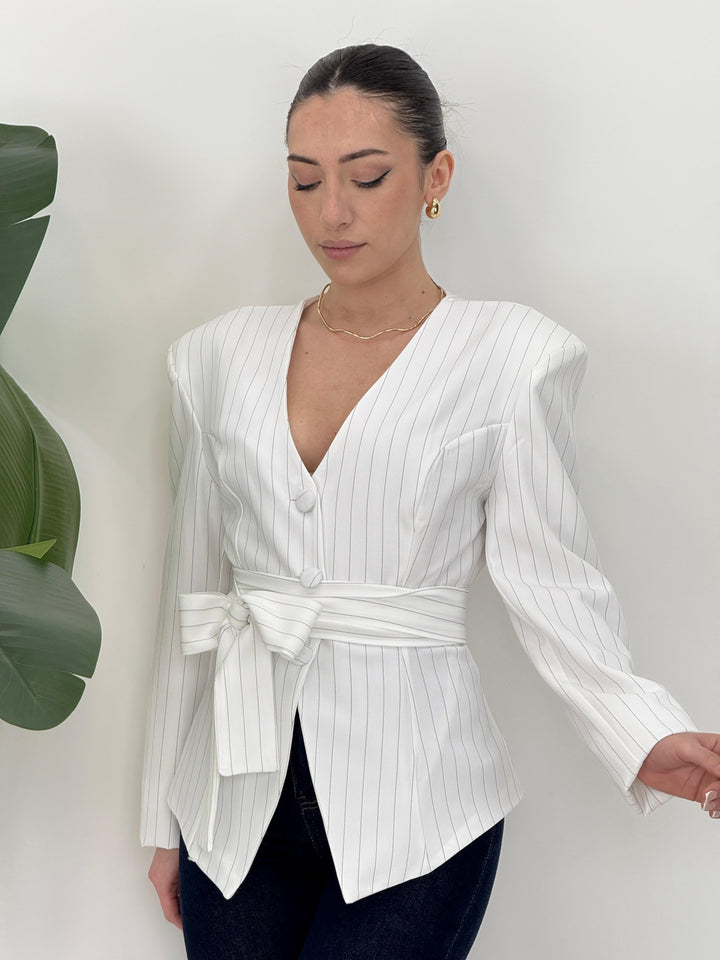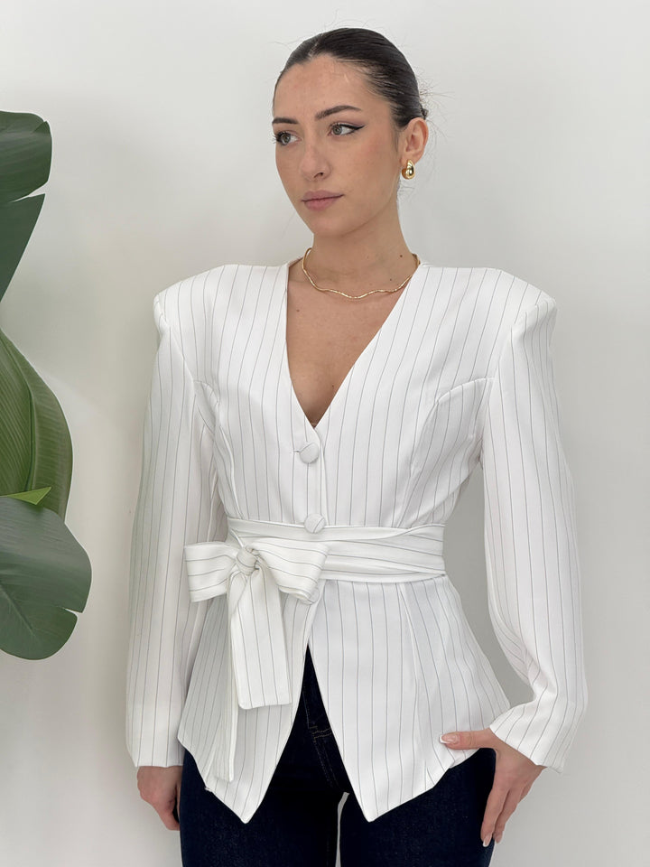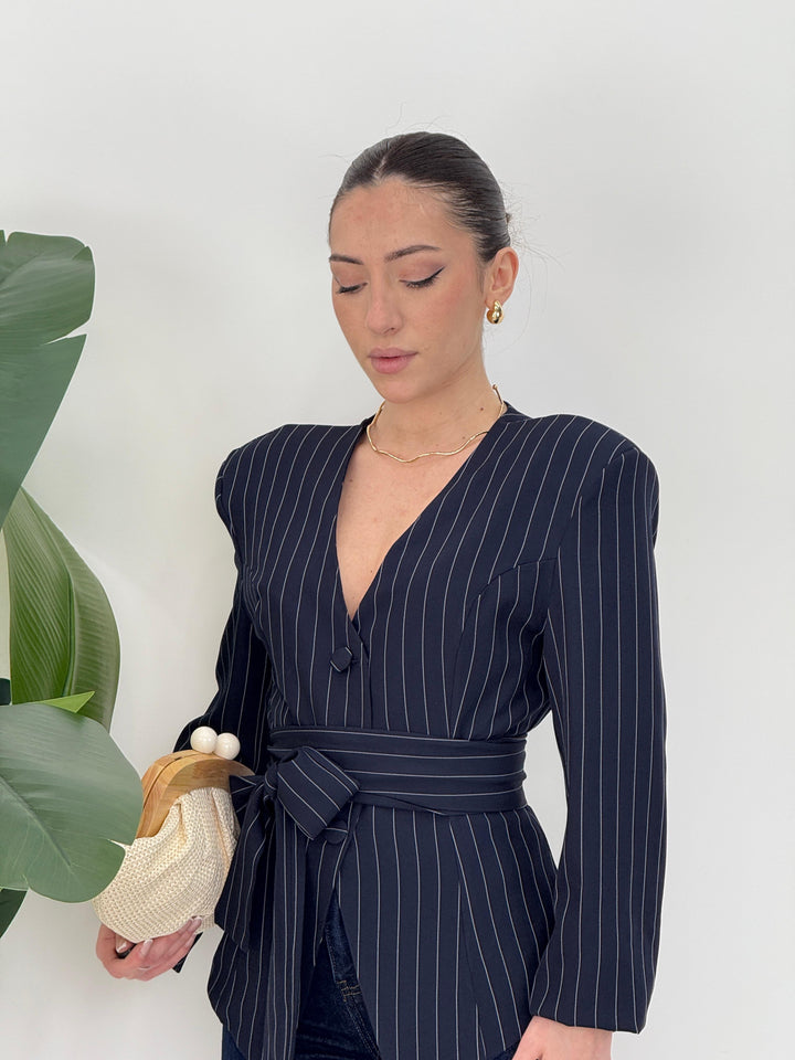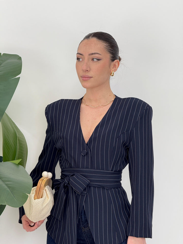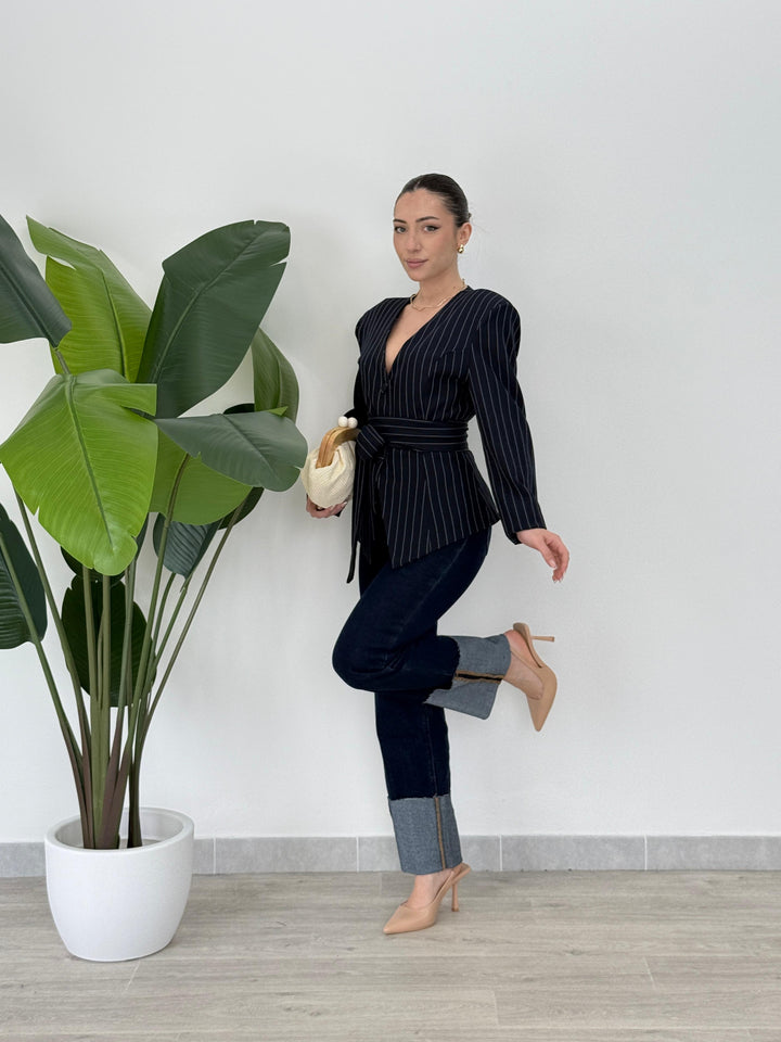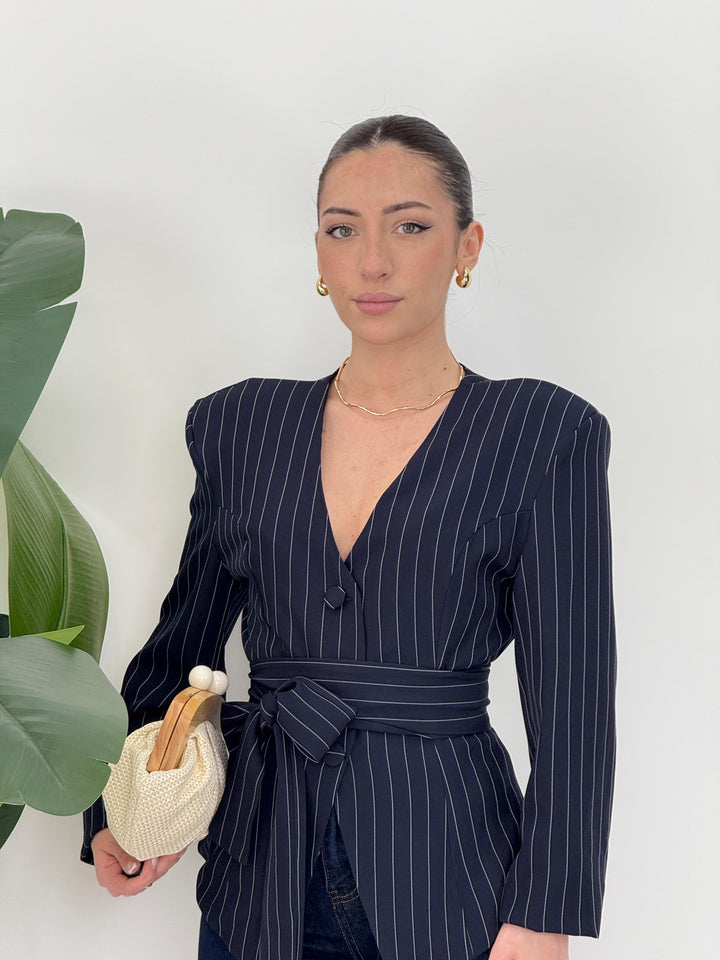 L'iconico Blazer Soraya gessato, è il must have di stile di cui hai bisogno. Con revers a punta e tre bottoni davanti a contrasto ; spalline strutturate , maniche lunghe e cintura rimovibile in vita! Adatto per ogni occasione Foderato all’interno( 100%poliestere).