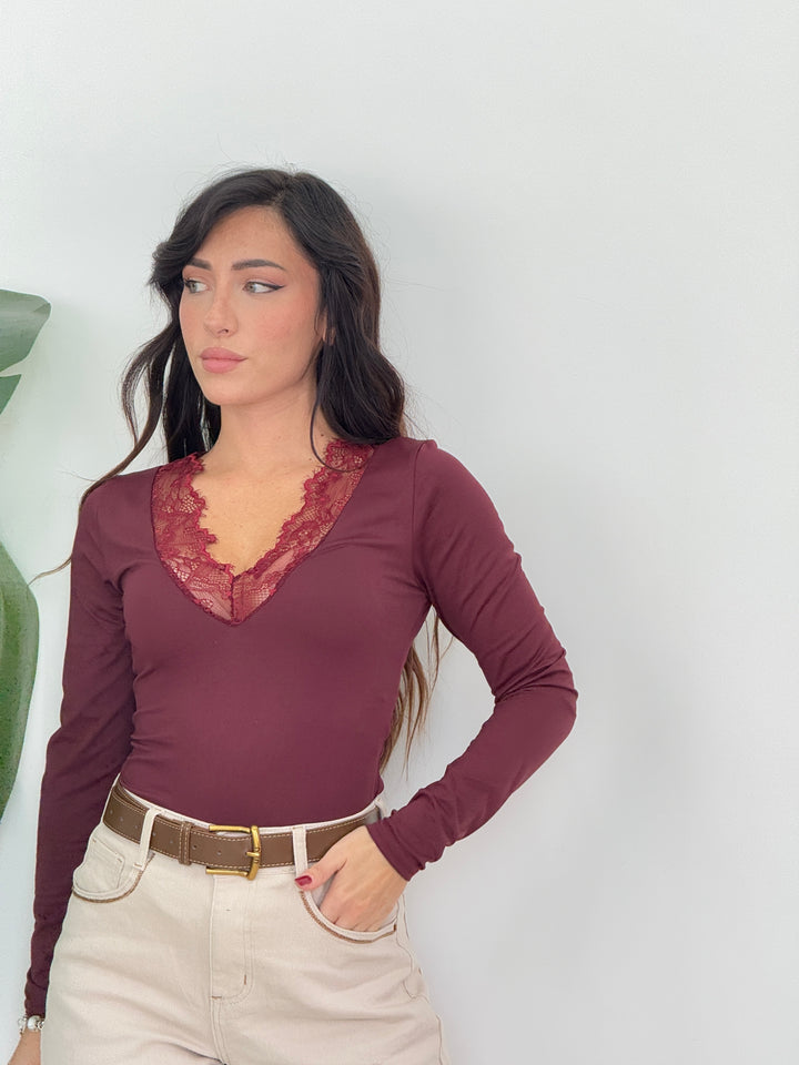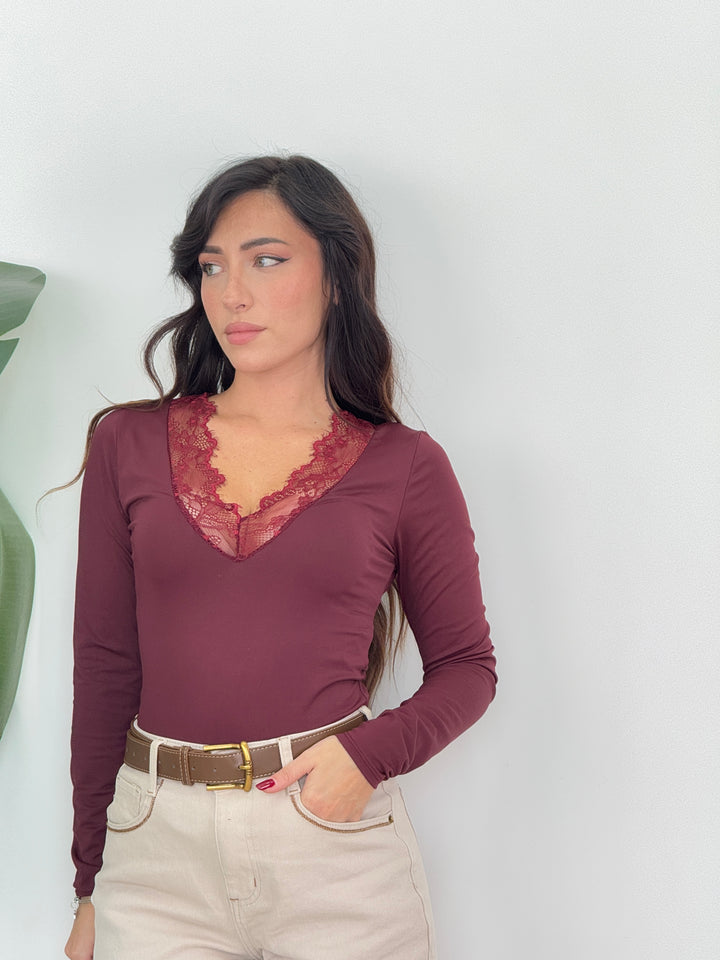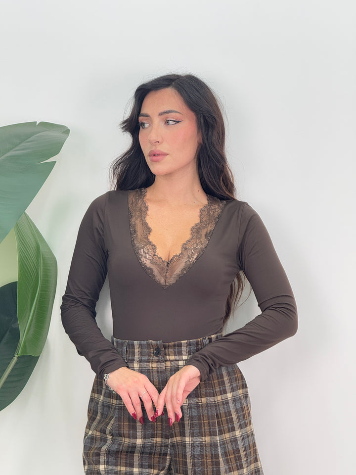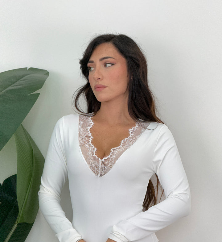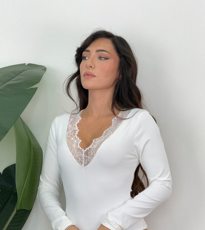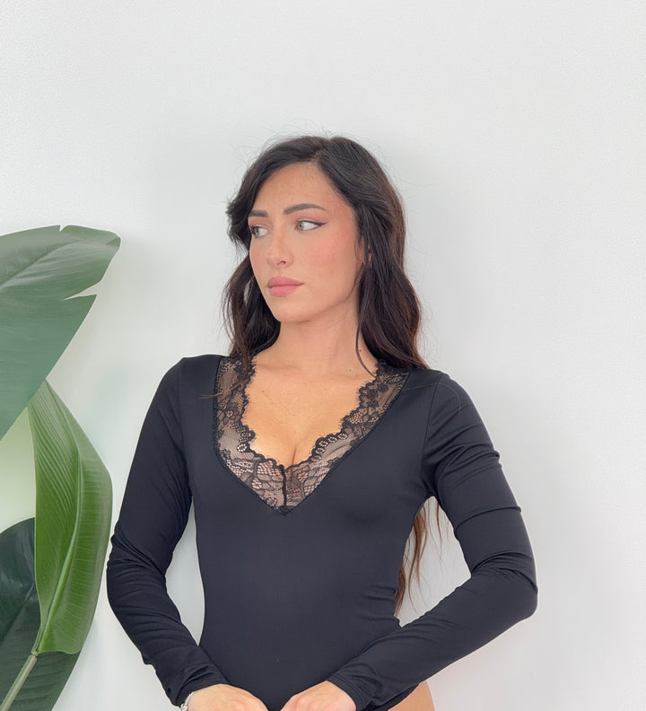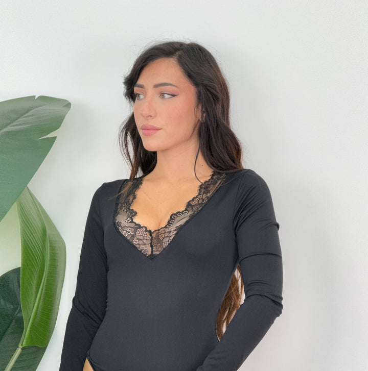Body realizzato su lycra di qualitá con scollo a V in pizzo . Perfetto per qualsiasi outfit dallo stile street,casual a quello elegante.Vestibilitá elastica