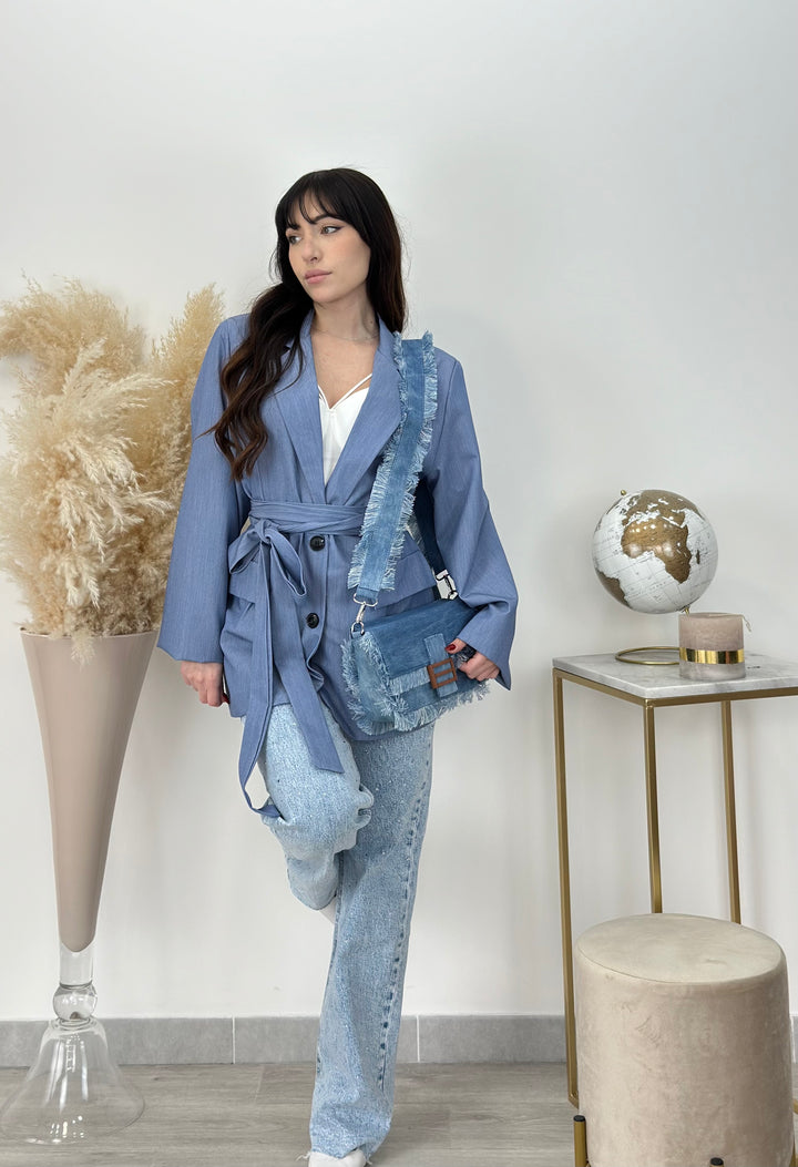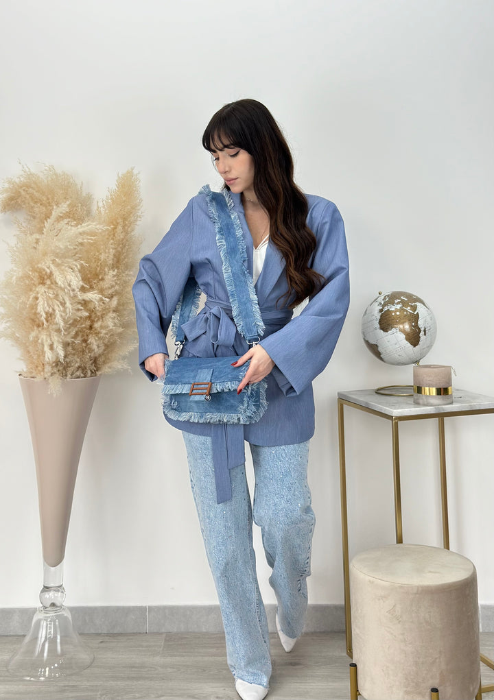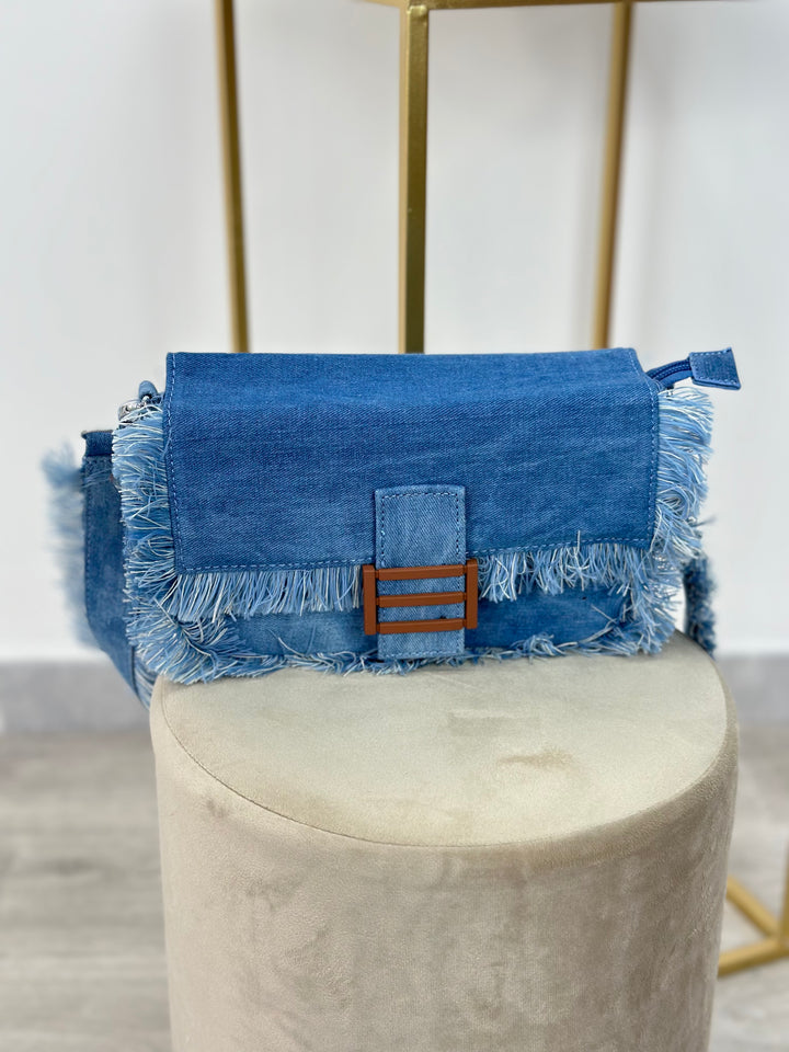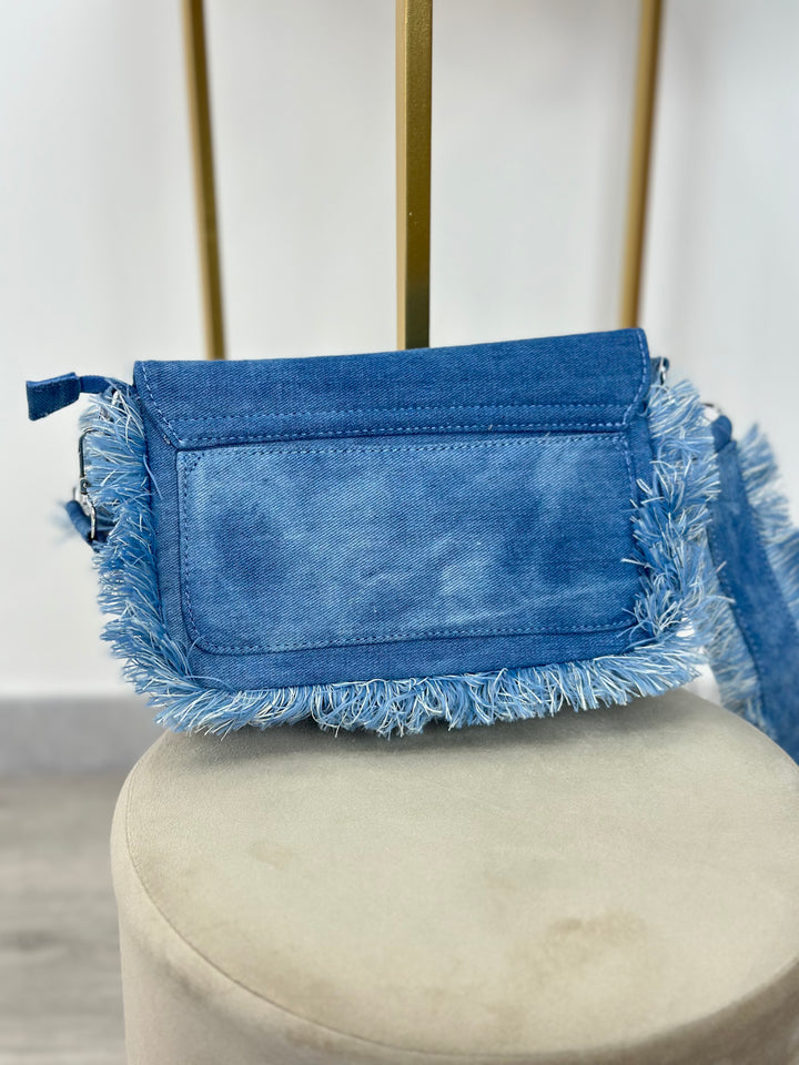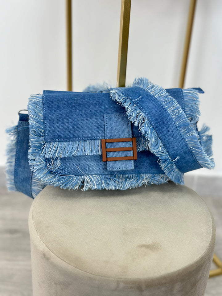 Borsa rigida in denim . Tracolla con frangie rimovibile