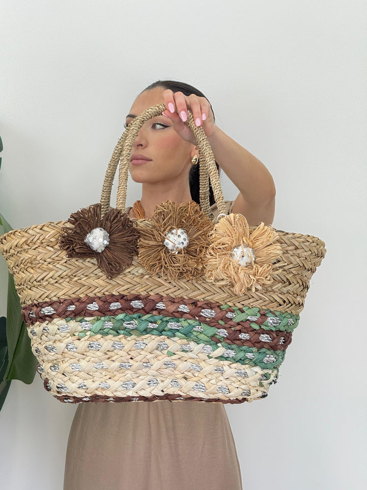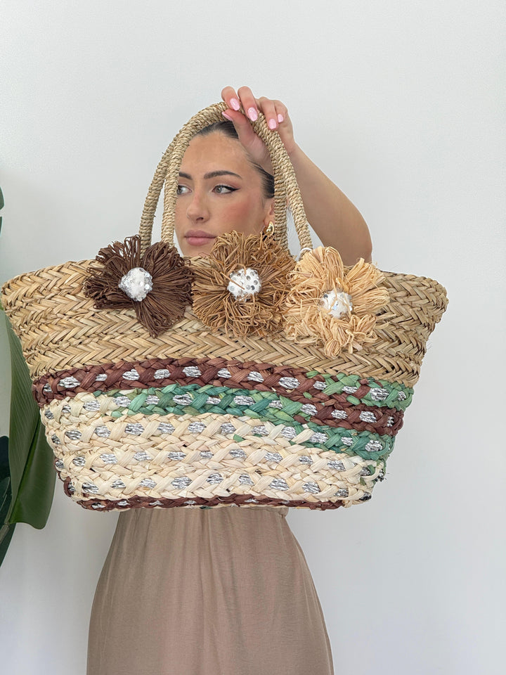 Borsa in paglia intrecciata presenta una lavorazione a strisce da dettagli argentati intrecciati. I due manici robusti in corda naturale garantiscono praticità, mentre tre grandi fiori decorativi in rafia, con centri luccicanti, aggiungono un tocco estivo e artigianale, perfetto per la spiaggia o passeggiate estive.