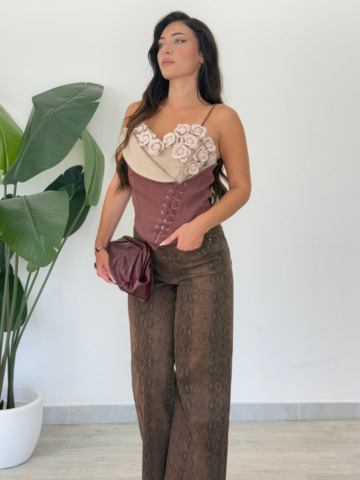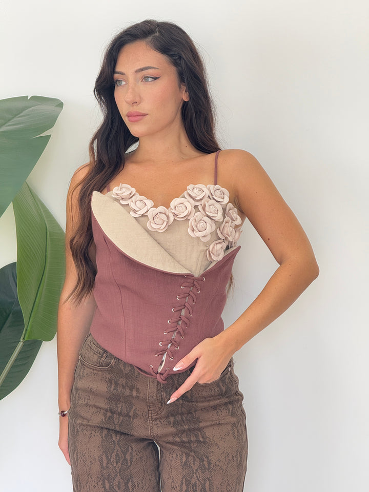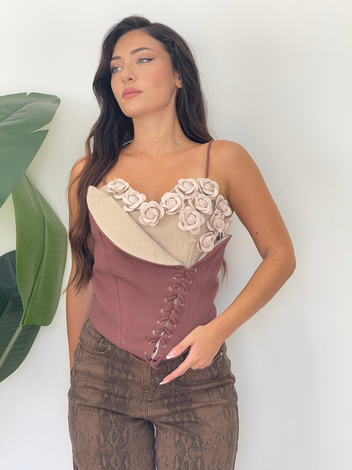 Bustier con applicazioni di rose e stringhe asimmetriche regolabili .zio nel retro. Perfetto per ogni tuo outfit speciale .