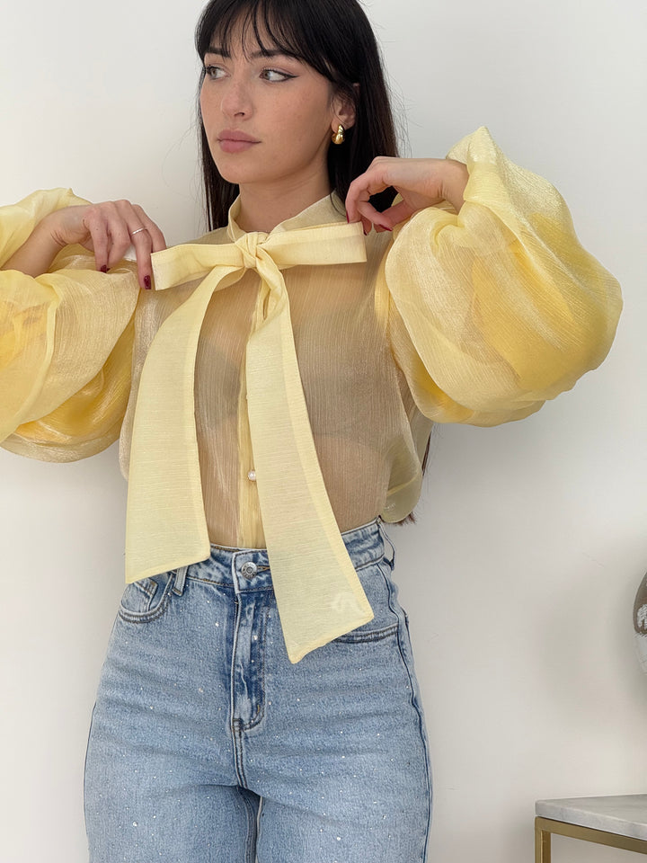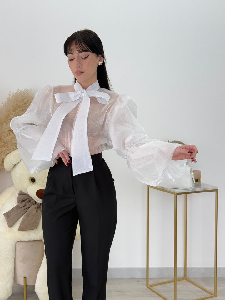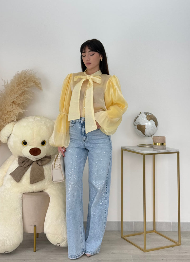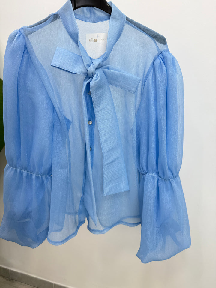 Camicia Azzurra Realizzata in tessuto chiffon in velo con veri bottoni centrali a gioiello e un grande fiocco ,con maniche a sbuffo ed elastici ai gomiti per dare un effetto a palloncino . Perfetta per qualsiasi occasione .Vestibilità regular.
