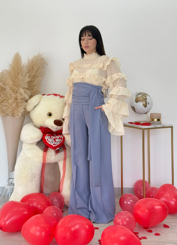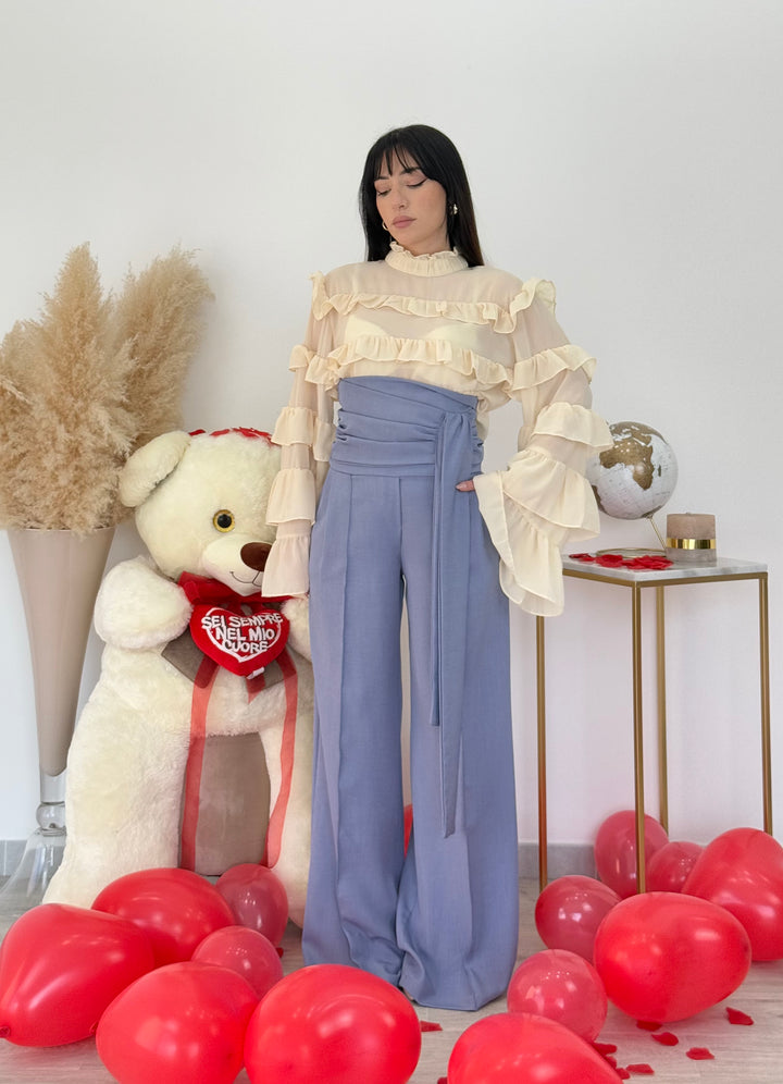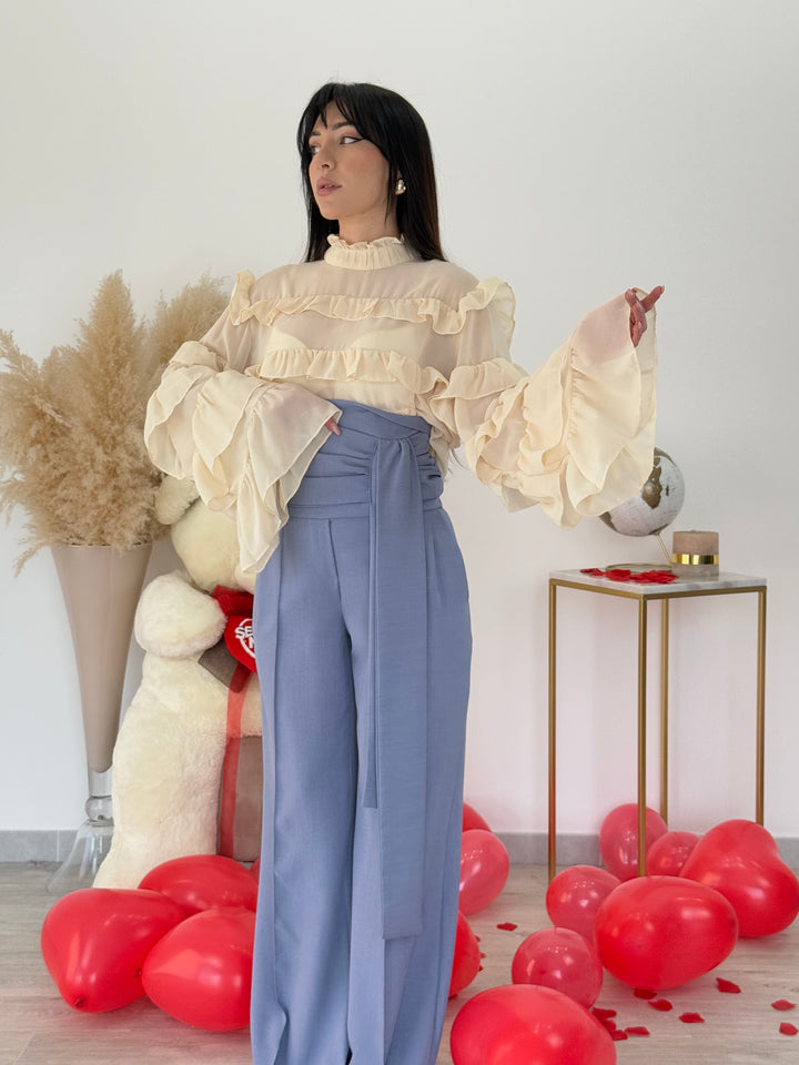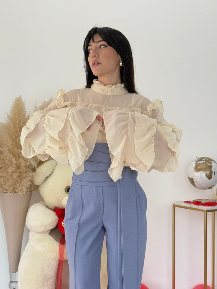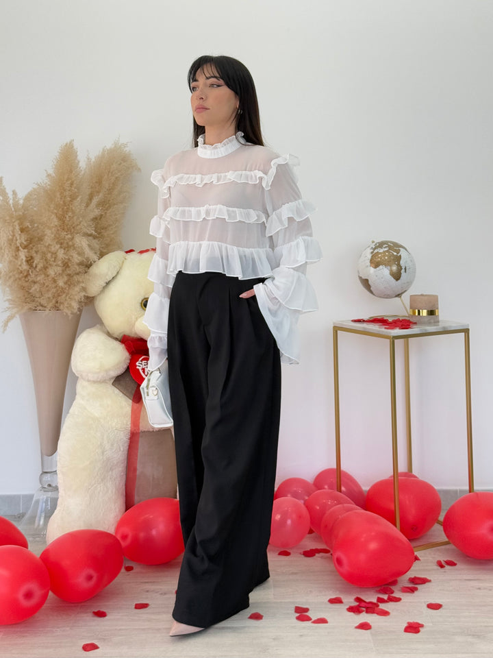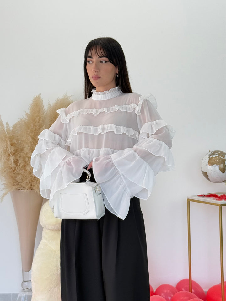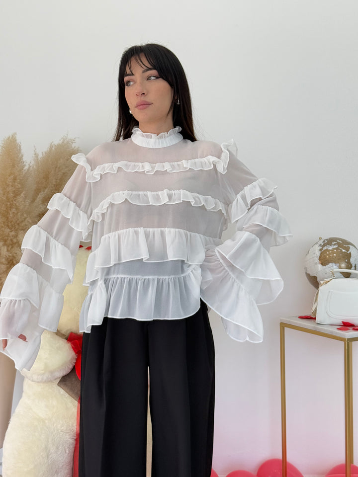 Scopri la bellissima blusa Marisabel,realizzata in tessuto chiffon con collo alla coreana , ampie maniche e balze ovunque. Perfetta per qualsiasi occasione. Vestibilità semi-over