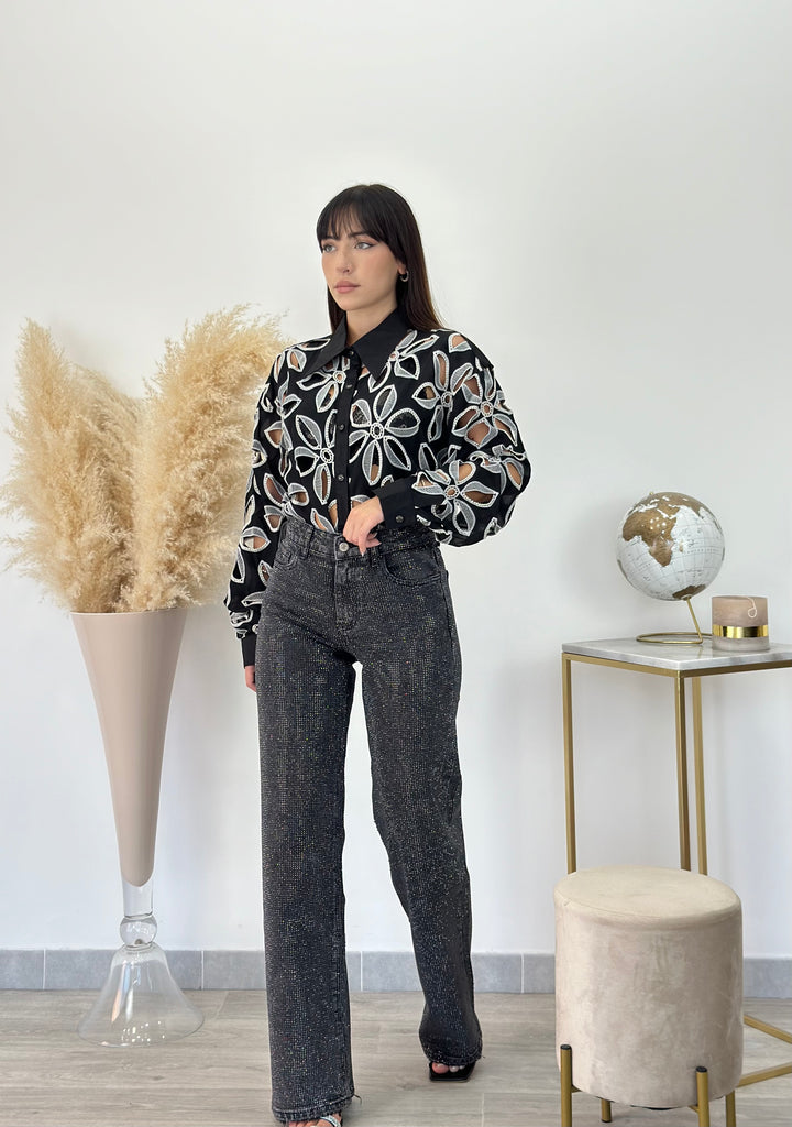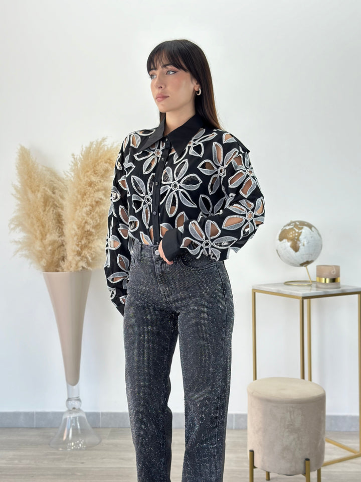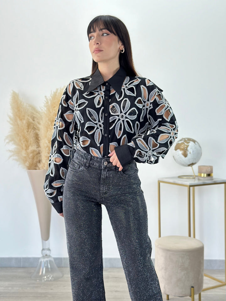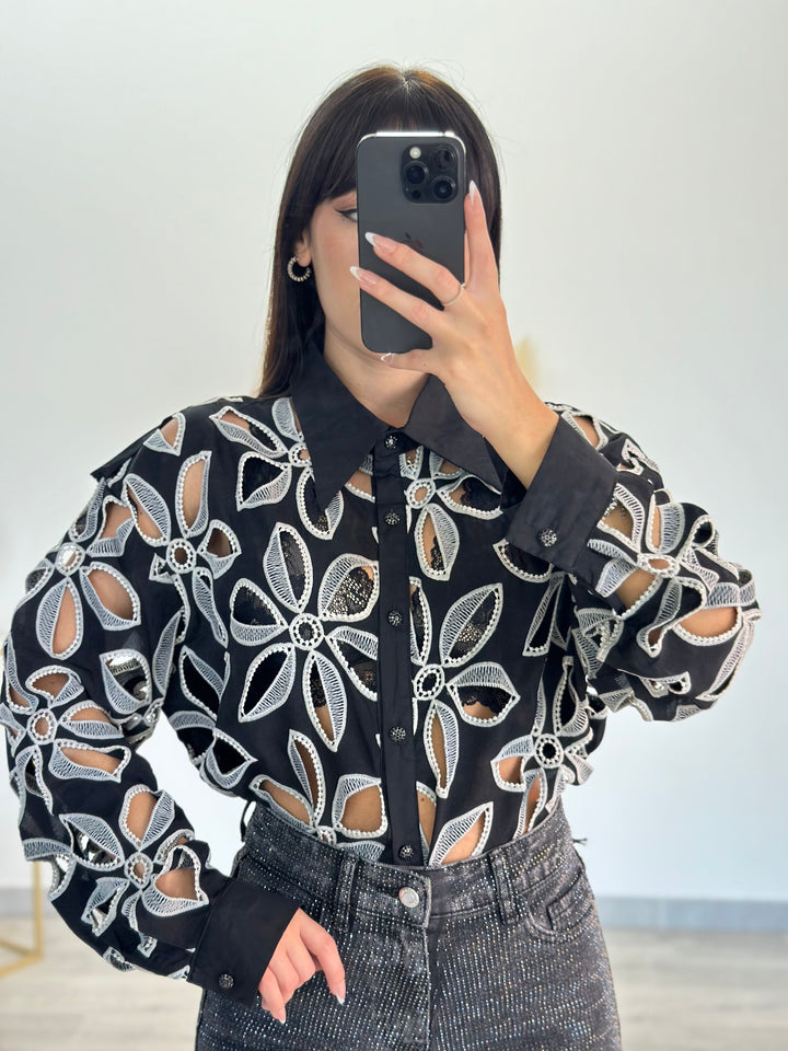 Camicia Flower a maniche lunghe. Colletto classico e chiusura con bottoni,tessuto in pizzo con ricami floreali traforati a contrasto.Perfetta per qualsiasi occasione Vestibilità regular