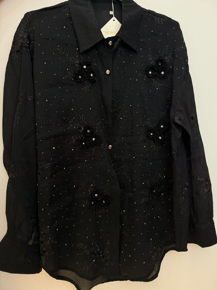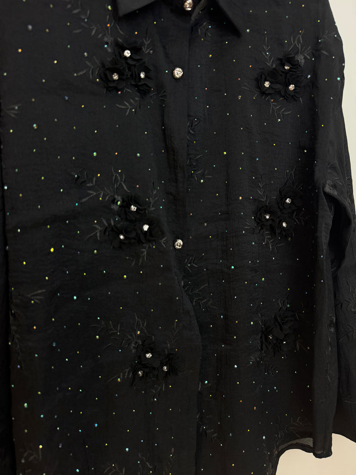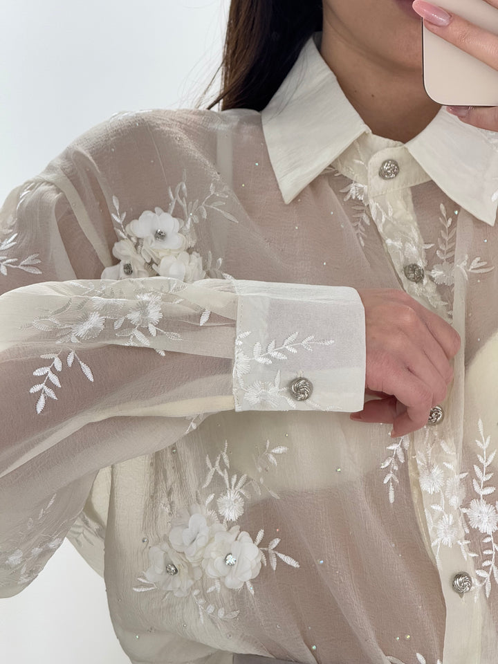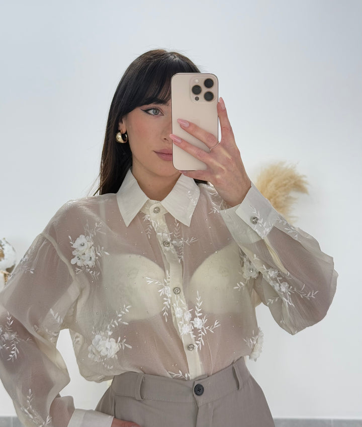 Scopri la nostra Camicia Tersy ! Realizzata in tessuto chiffon con colletto alla francese , veri bottoni centrali e applicazioni di fiori in lurex. Perfetta per qualsiasi outfit . Vestibilità semi-over.