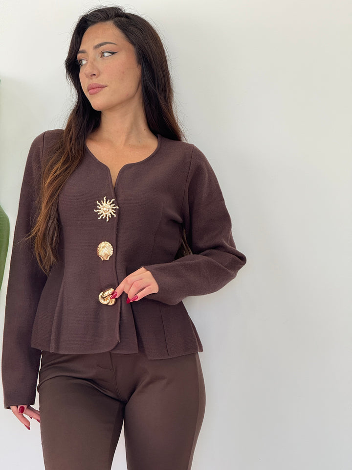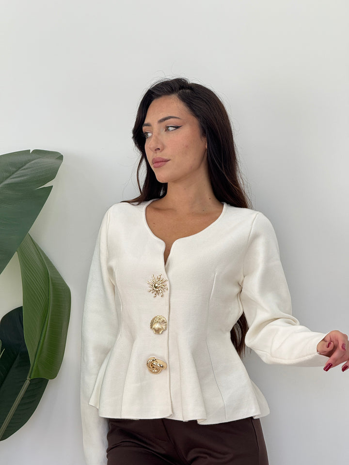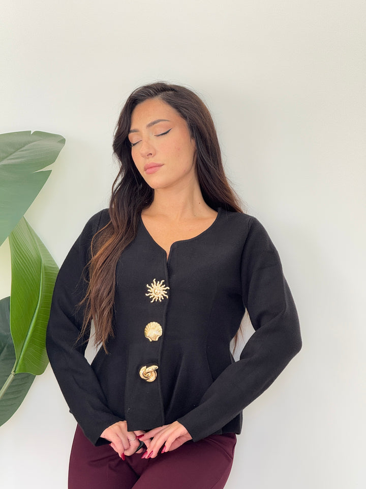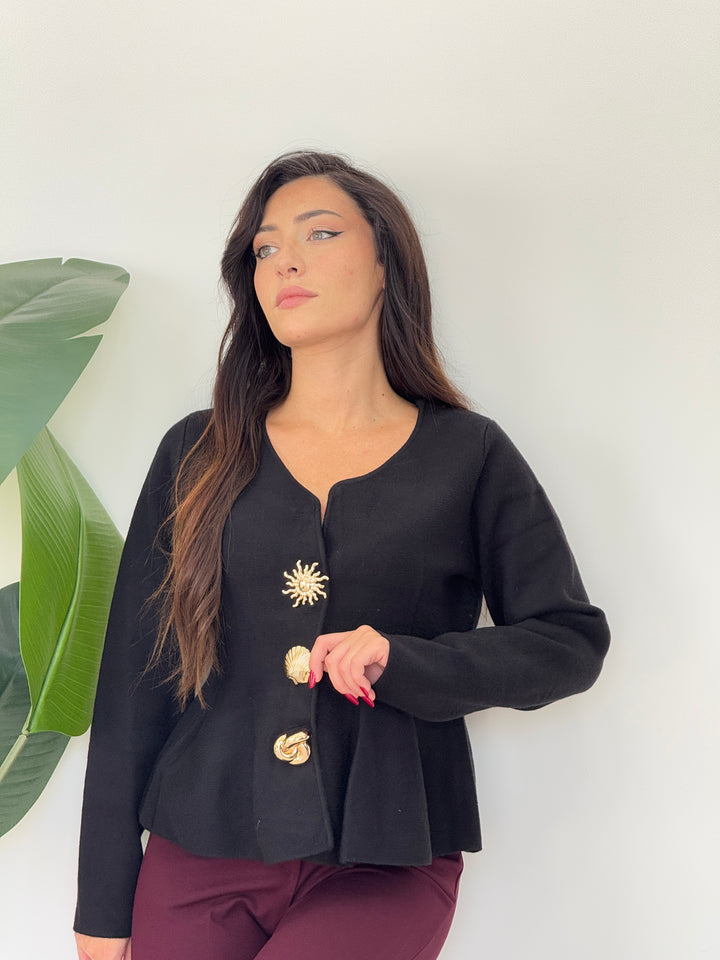 Cardigan Sea realizzato in morbida lana doppia pettianta, . Particolare lavorazione con bottoni che richiamano le forme marine . Scollo quadrato , svasato sotto con pieghe . Ideale per qualsiasi outfit. Vestibilità elastica