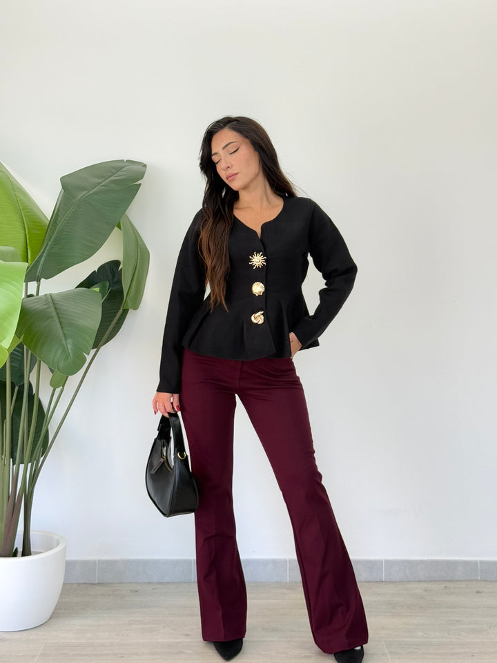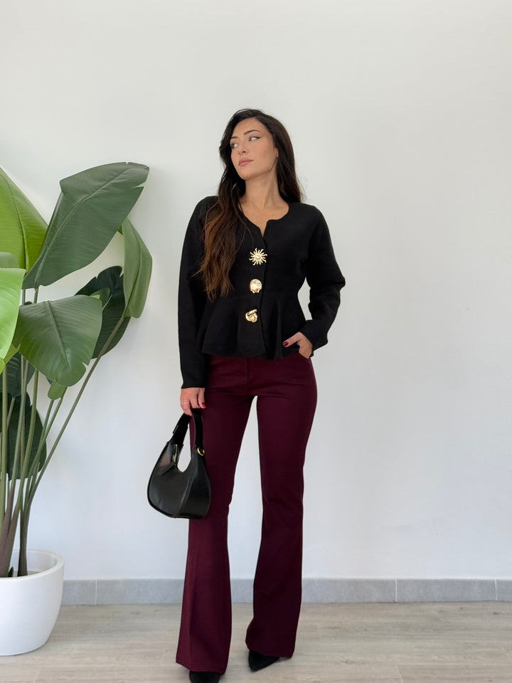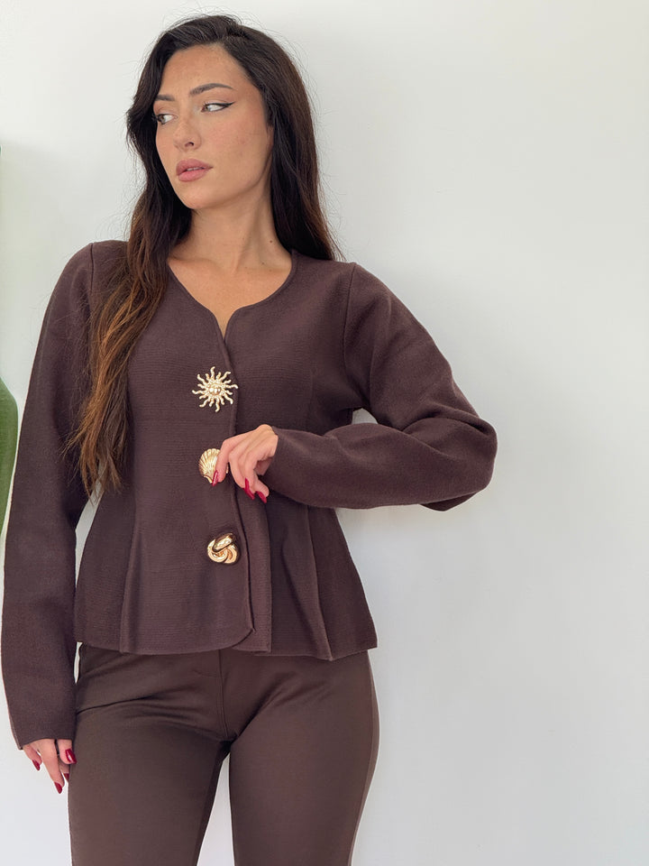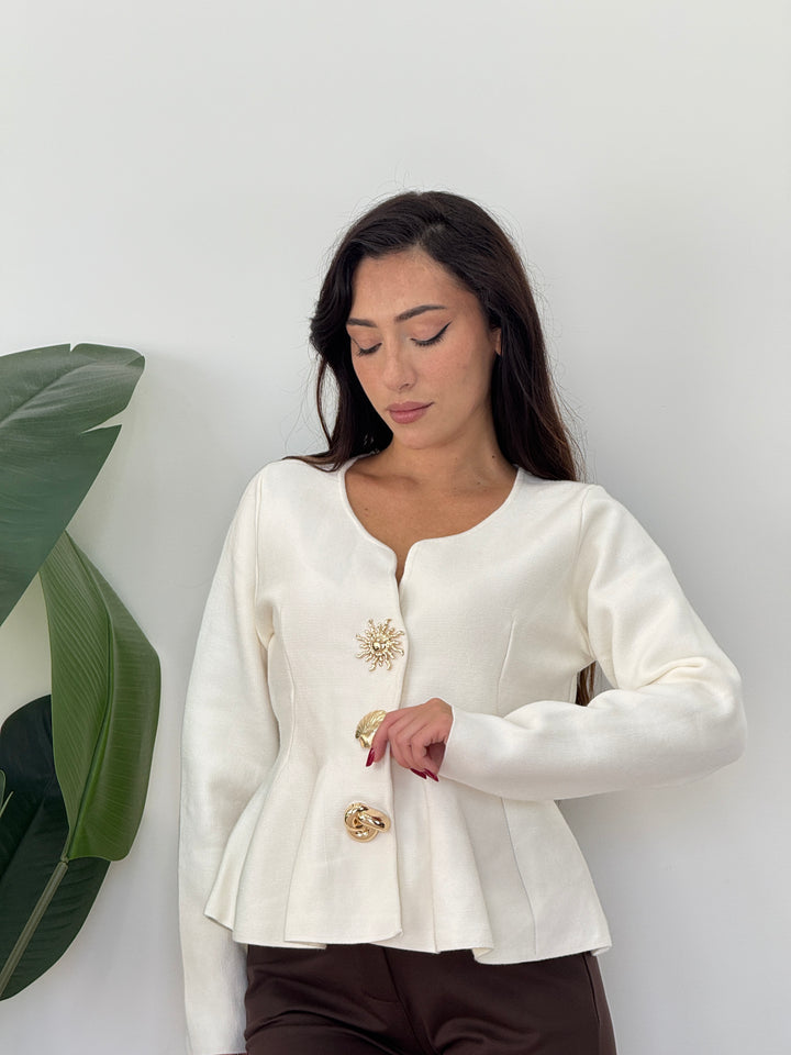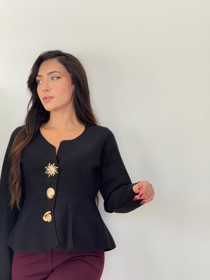 Cardigan Sea realizzato in morbida lana doppia pettianta, . Particolare lavorazione con bottoni che richiamano le forme marine . Scollo quadrato , svasato sotto con pieghe . Ideale per qualsiasi outfit. Vestibilità elastica