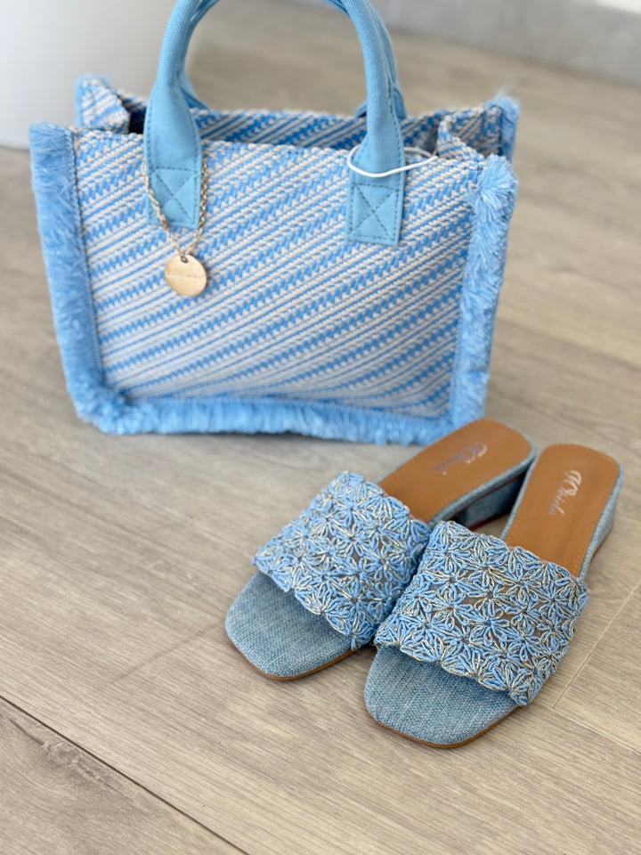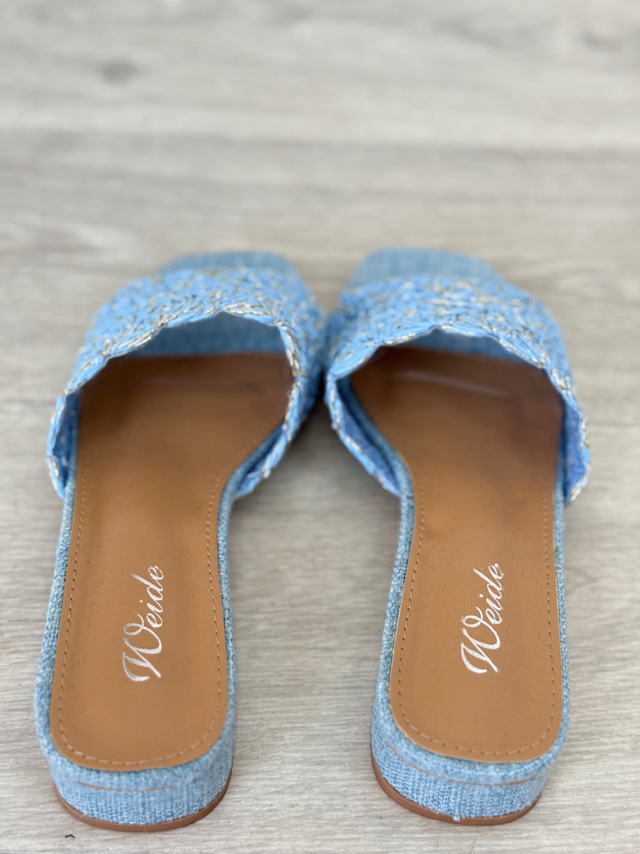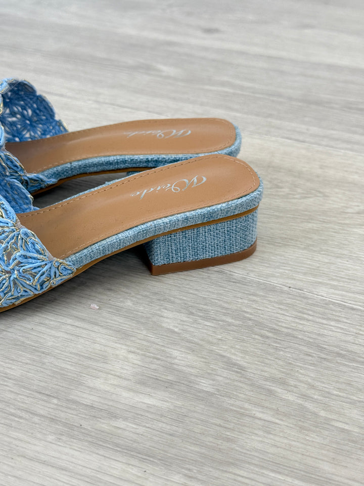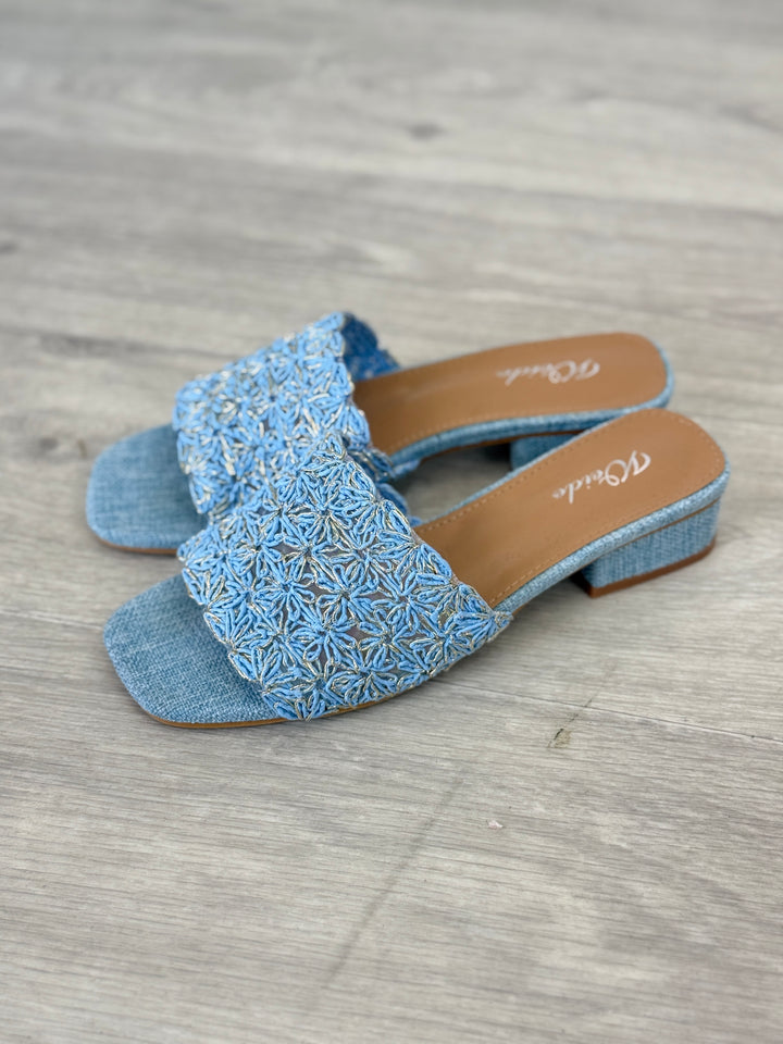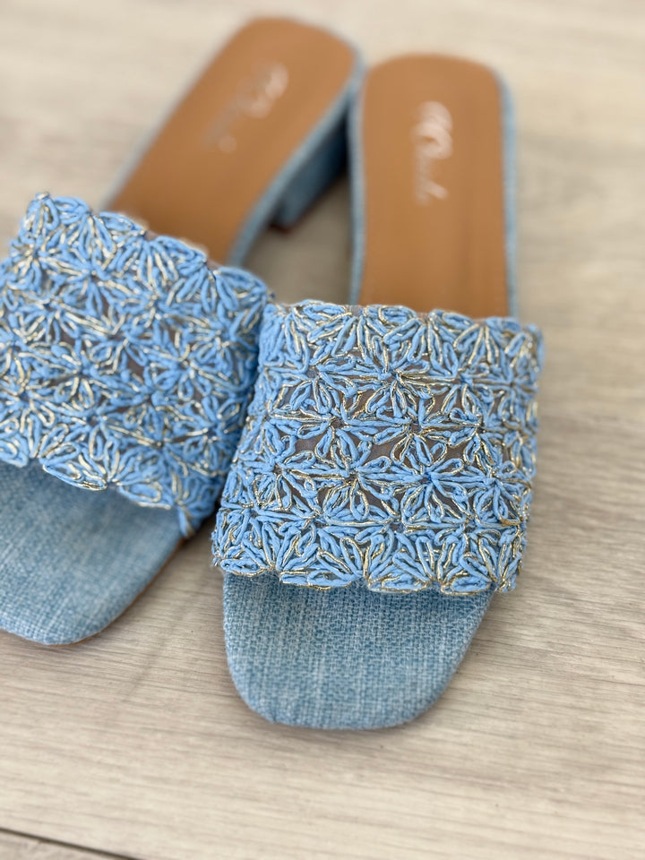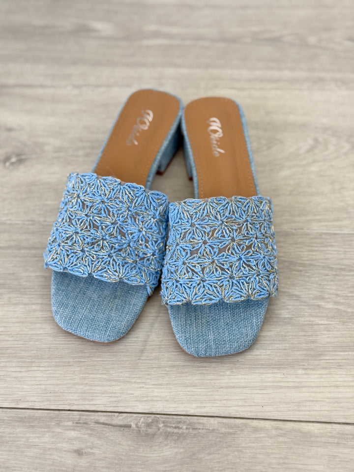 Ciabattine con piccolo tacco in denim chiaro, tomaia aperta decorata con ricami floreali azzurri e bianchi a rilievo, soletta interna color cuoio con Punta squadrata.