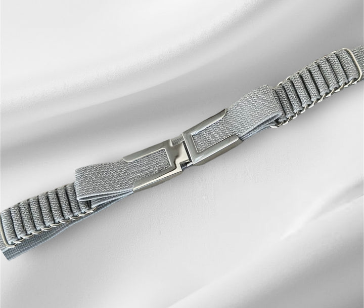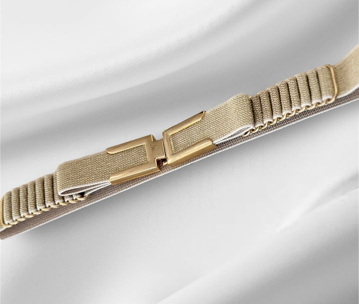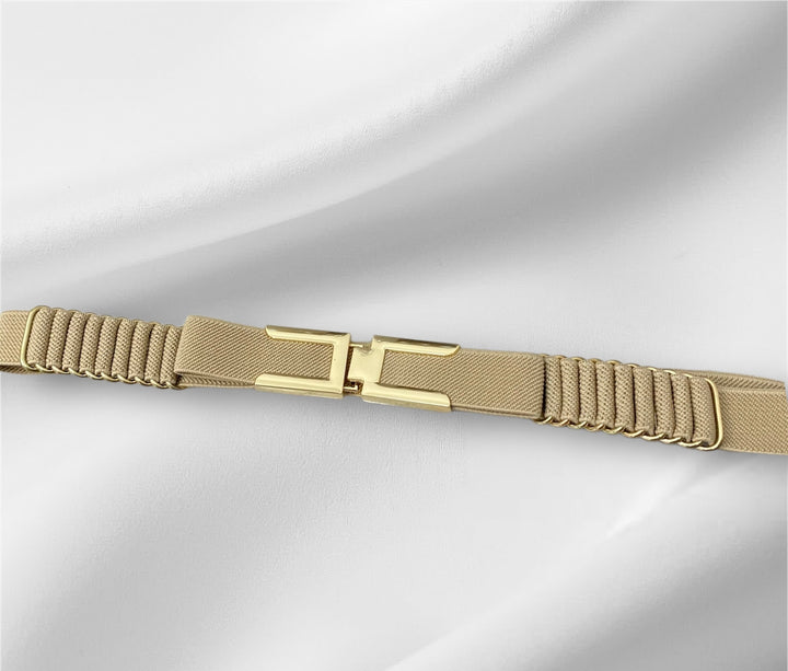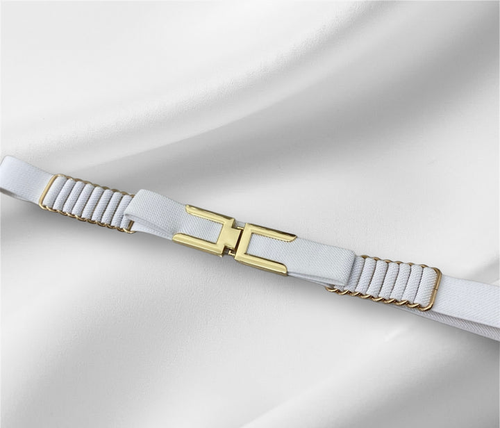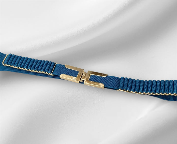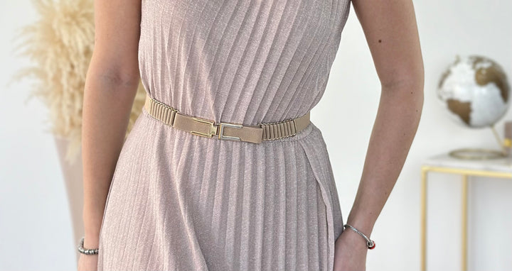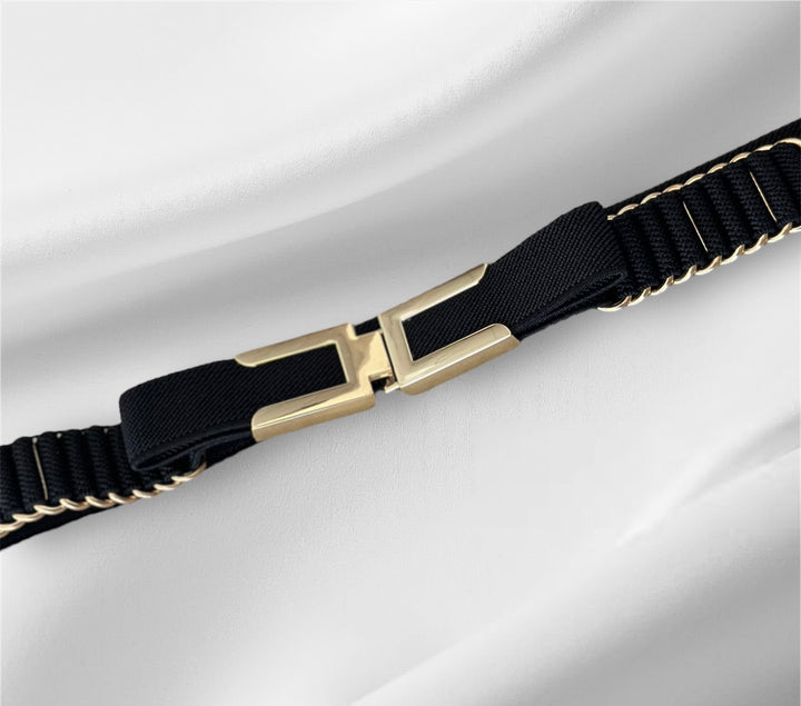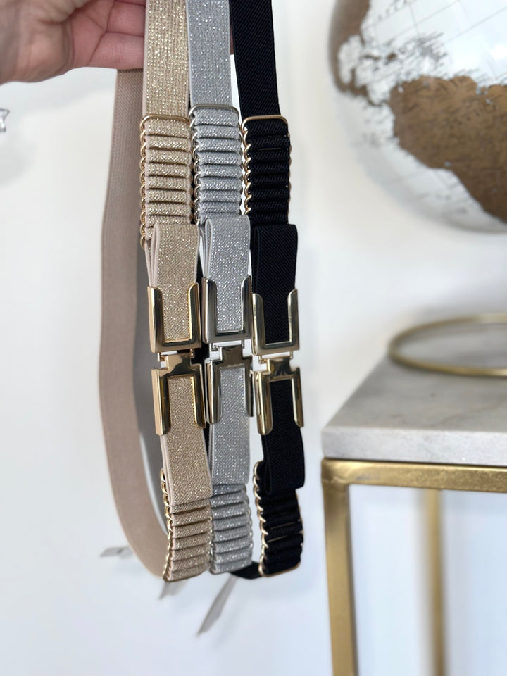 Elegante cintura in lurex , caratterizzata da fibbia metallica dorata. Vestibilità elasticizzata.