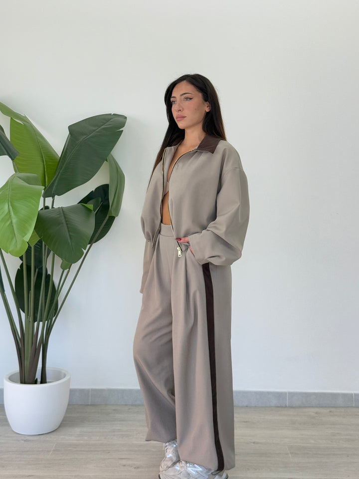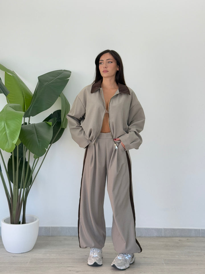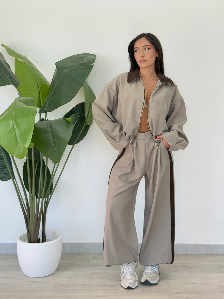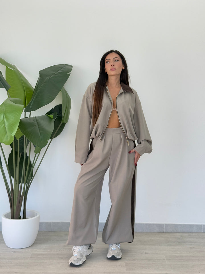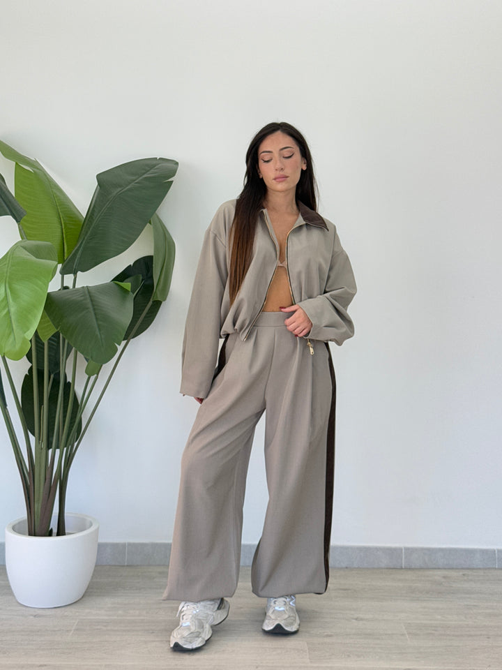 Scopri il coord set Ava! Coordinato composto da giacca a zip con collo in camoscio e pantalone con elastico in vita sul retro e alle caviglie. Perfetto per un look comodo e pratico!