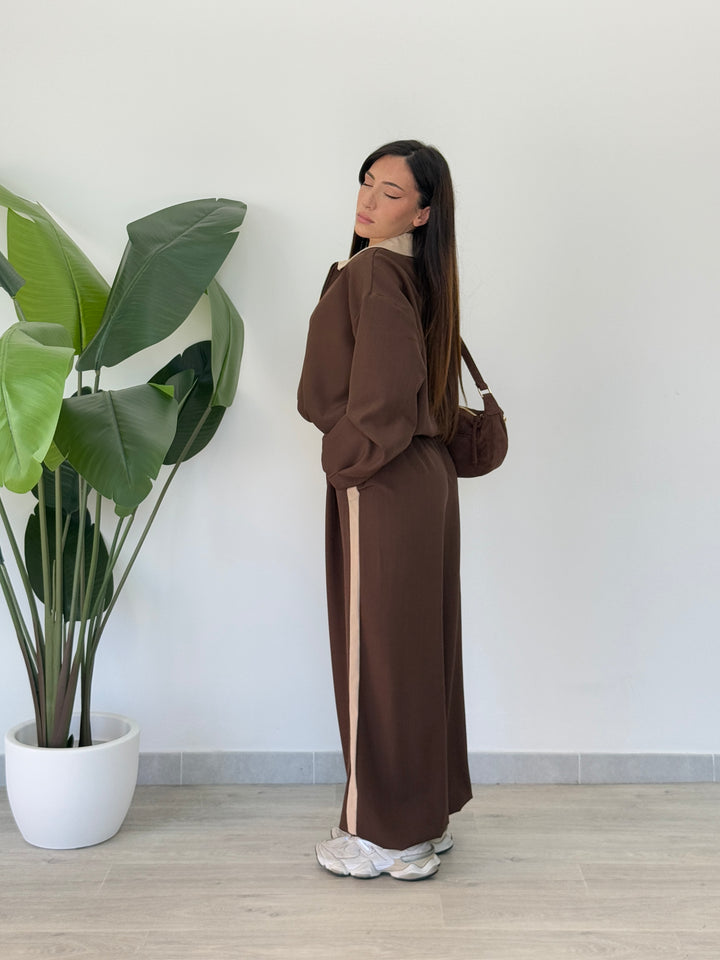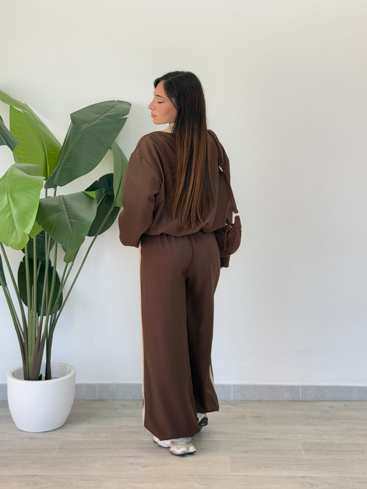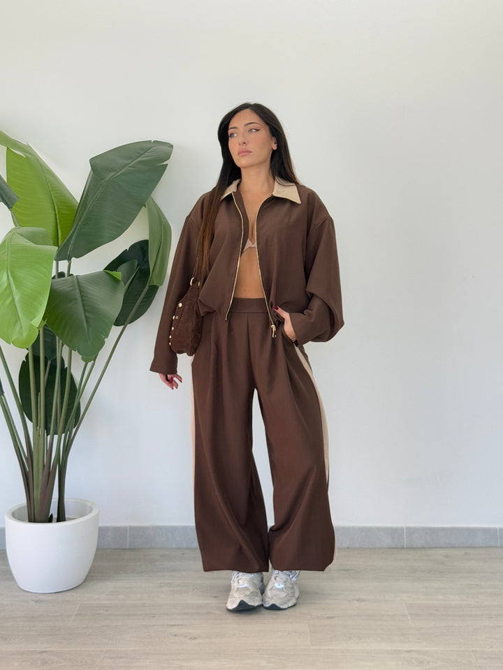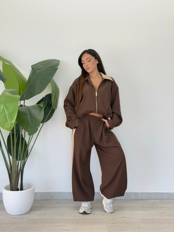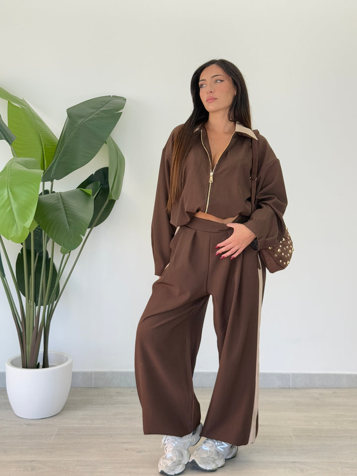 Scopri il coord set Ava! Coordinato composto da giacca a zip con collo in camoscio e pantalone con elastico in vita sul retro e alle caviglie. Perfetto per un look comodo e pratico!