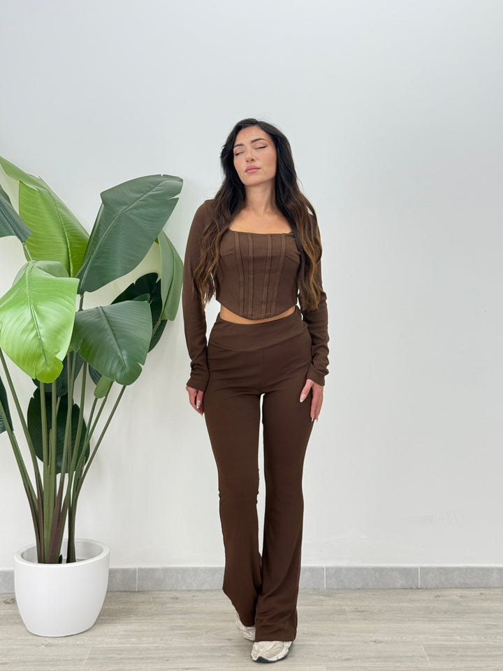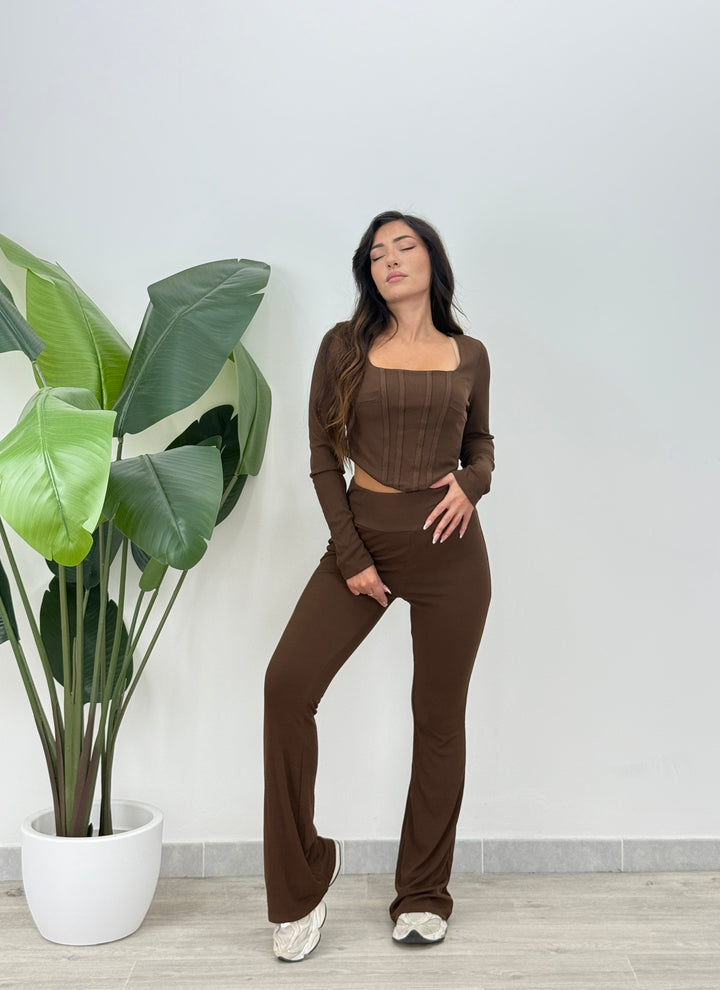 Coordinato comfy . Realizzato a costine , composto da maglio crop con scollo quadrato e pantalone con elastico in vita modello a zampa . Perfetto per un look originale e fuori dal comune. Scegli il tuo colore preferito e sfoggialo con stile!"Vestibilità elasticizzata