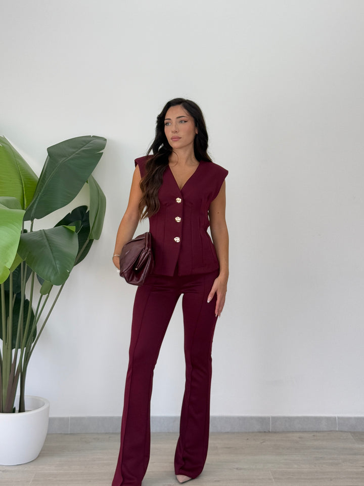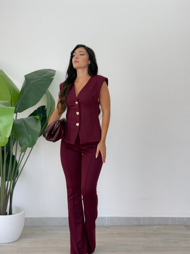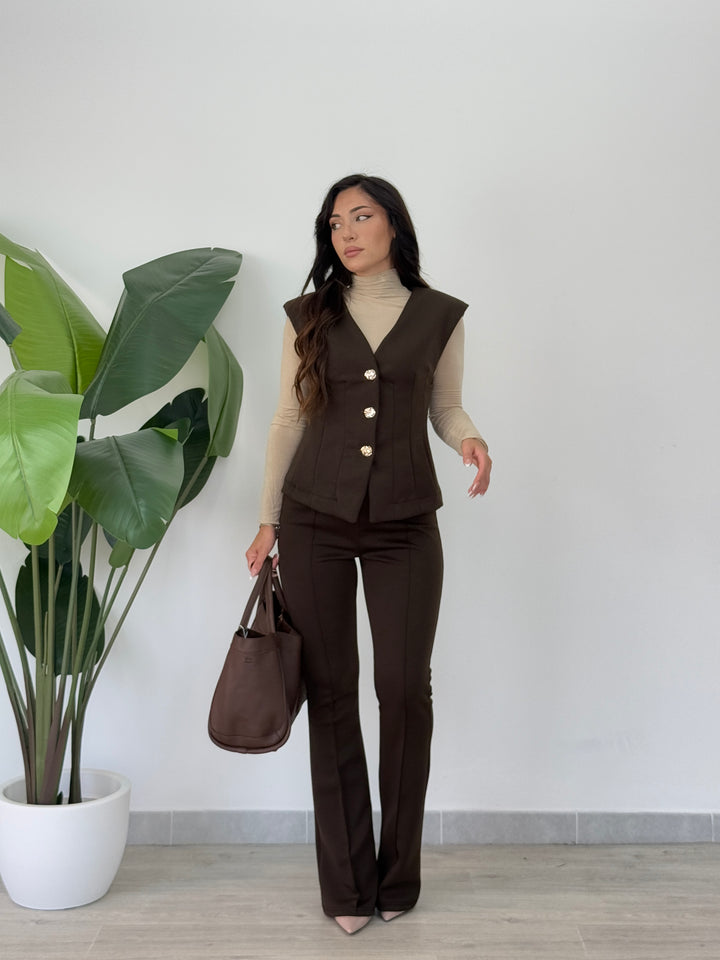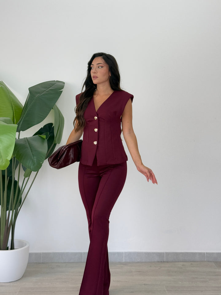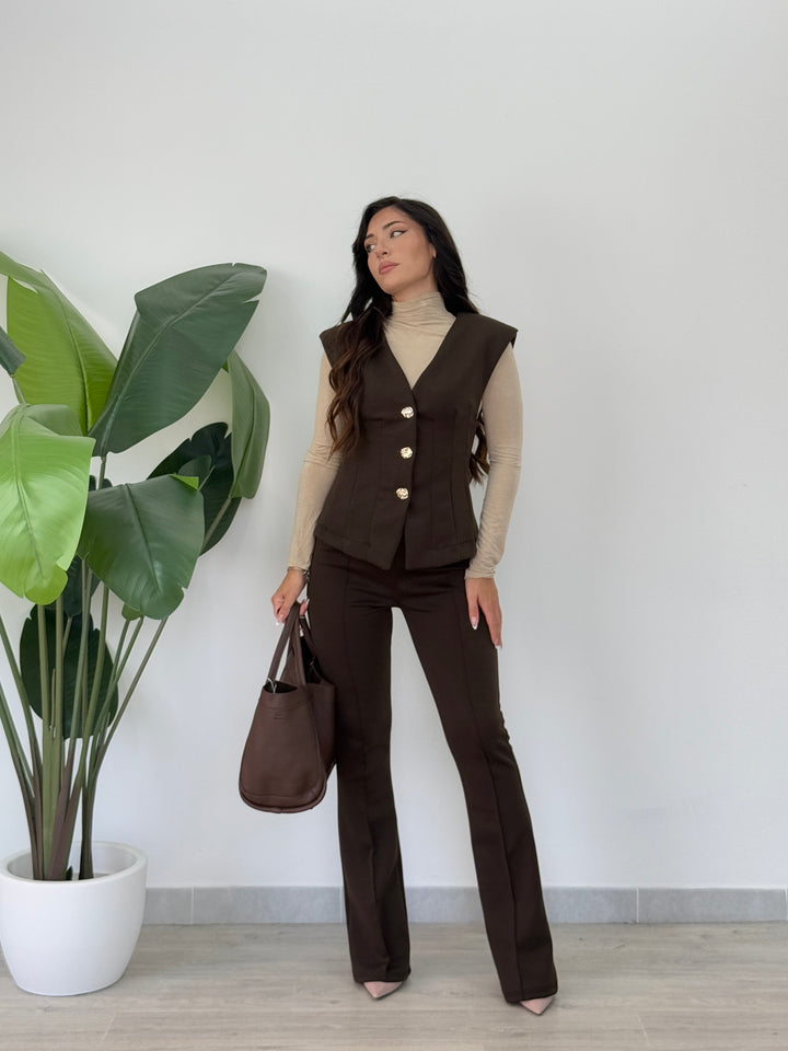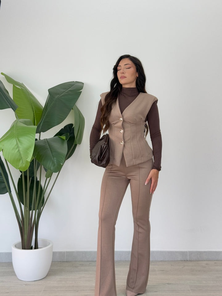 Coordinato composto da gilet con veri botti gioello, spalline strutturate e leggermente sfinato nel punto vita . Pantalone modello zampa con elastico nel retro . Vestibilitá elasticizzata