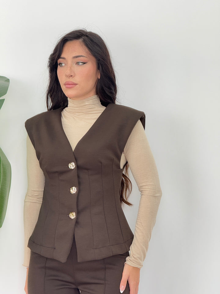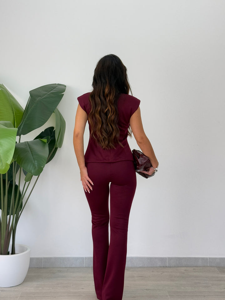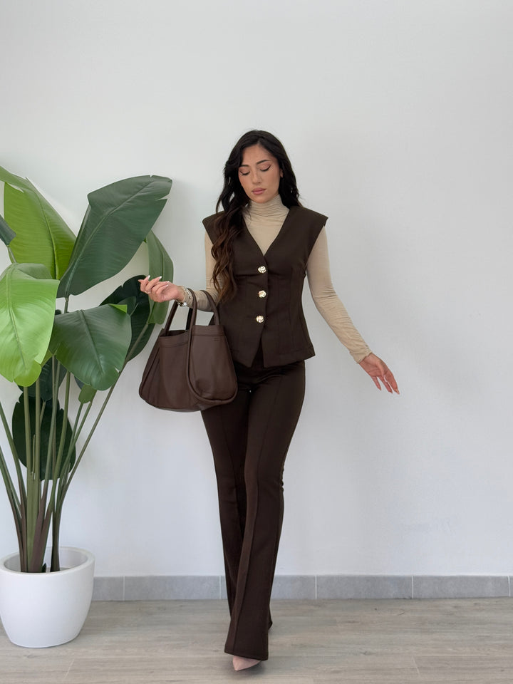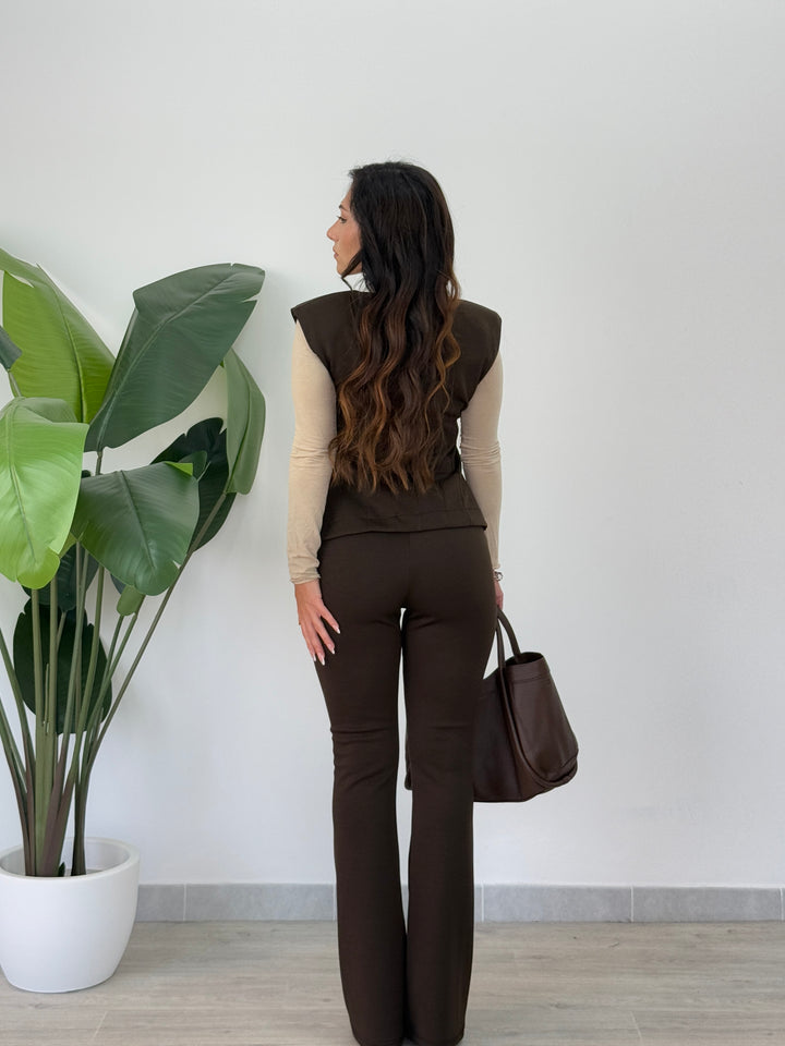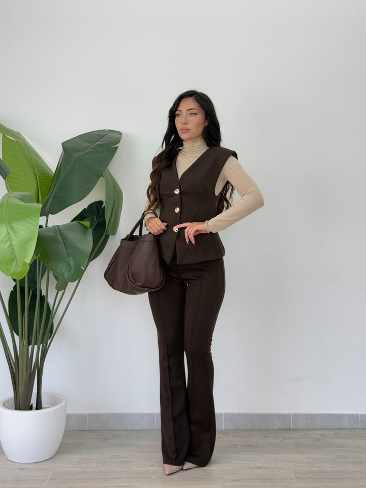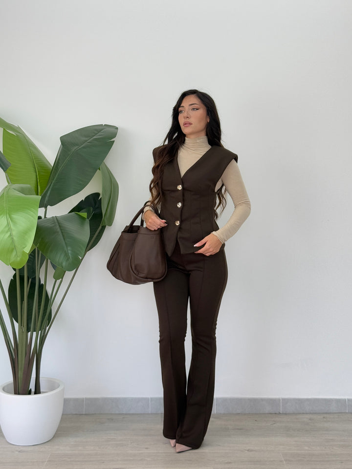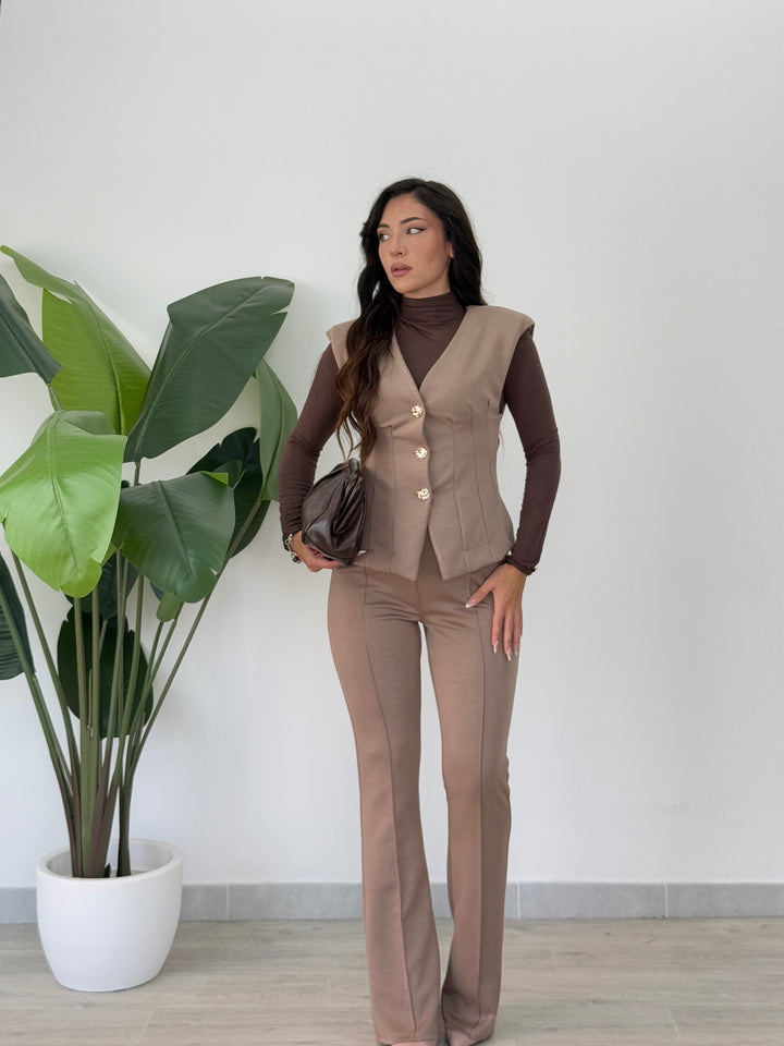 Coordinato composto da gilet con veri botti gioello, spalline strutturate e leggermente sfinato nel punto vita . Pantalone modello zampa con elastico nel retro . Vestibilitá elasticizzata
