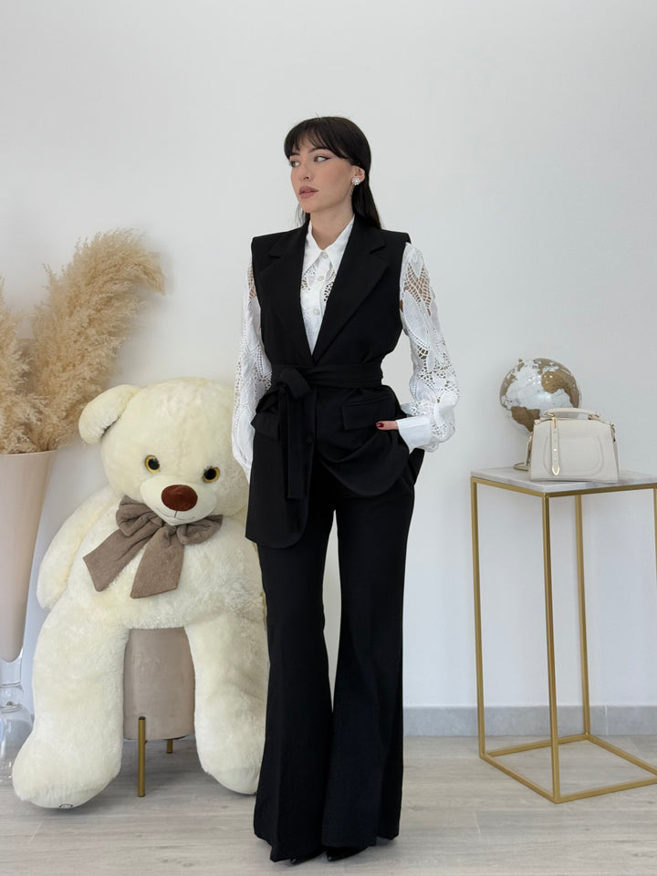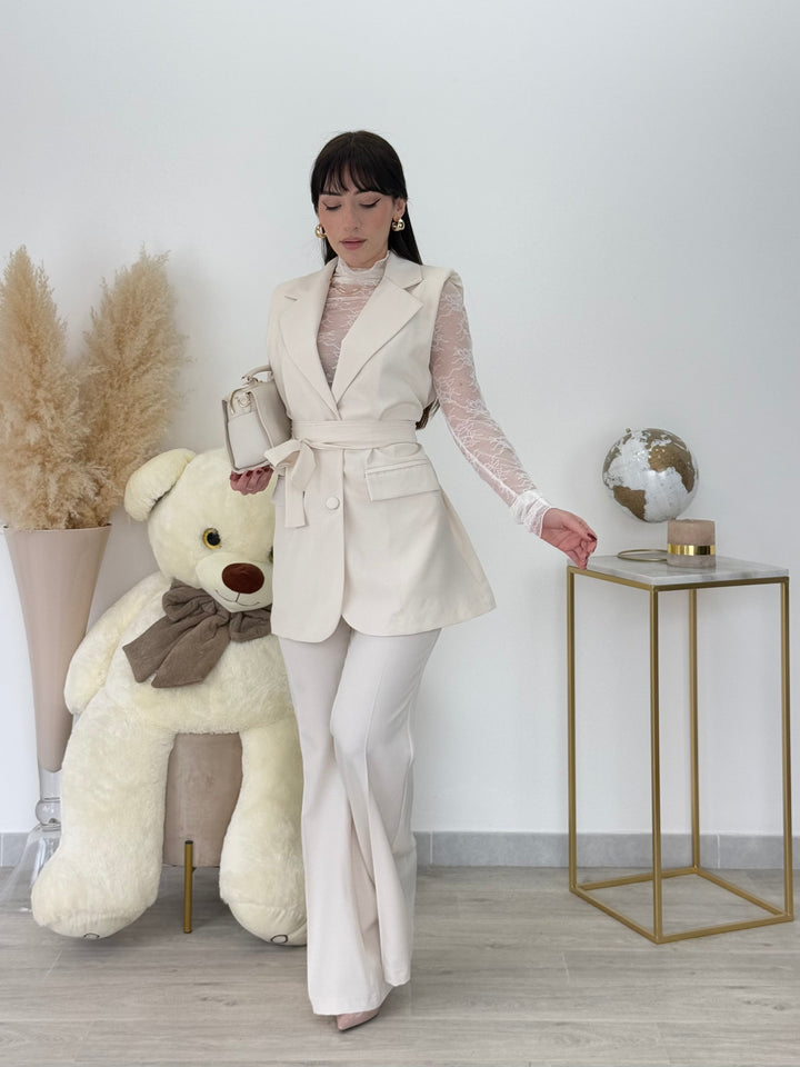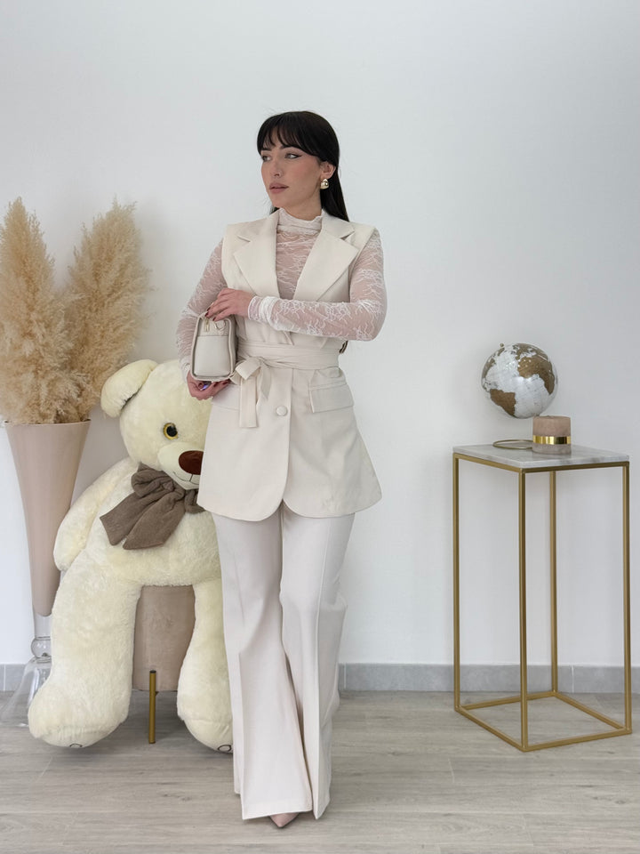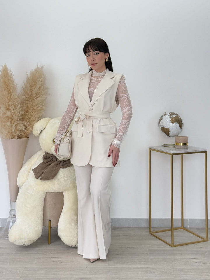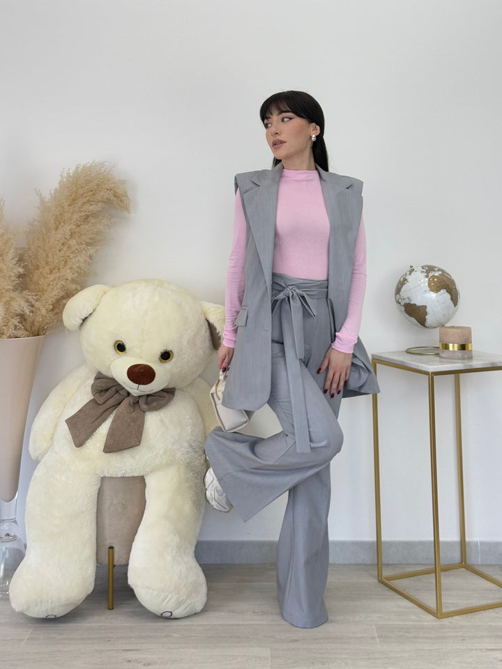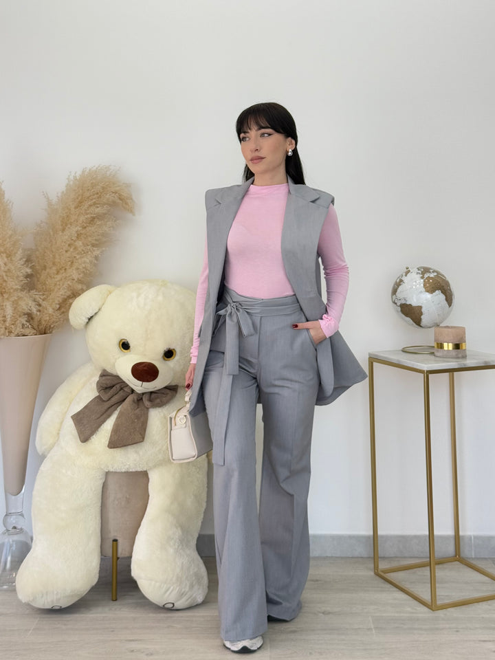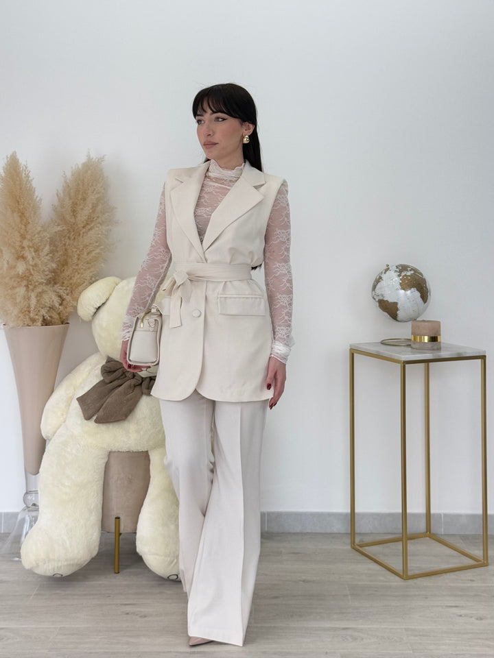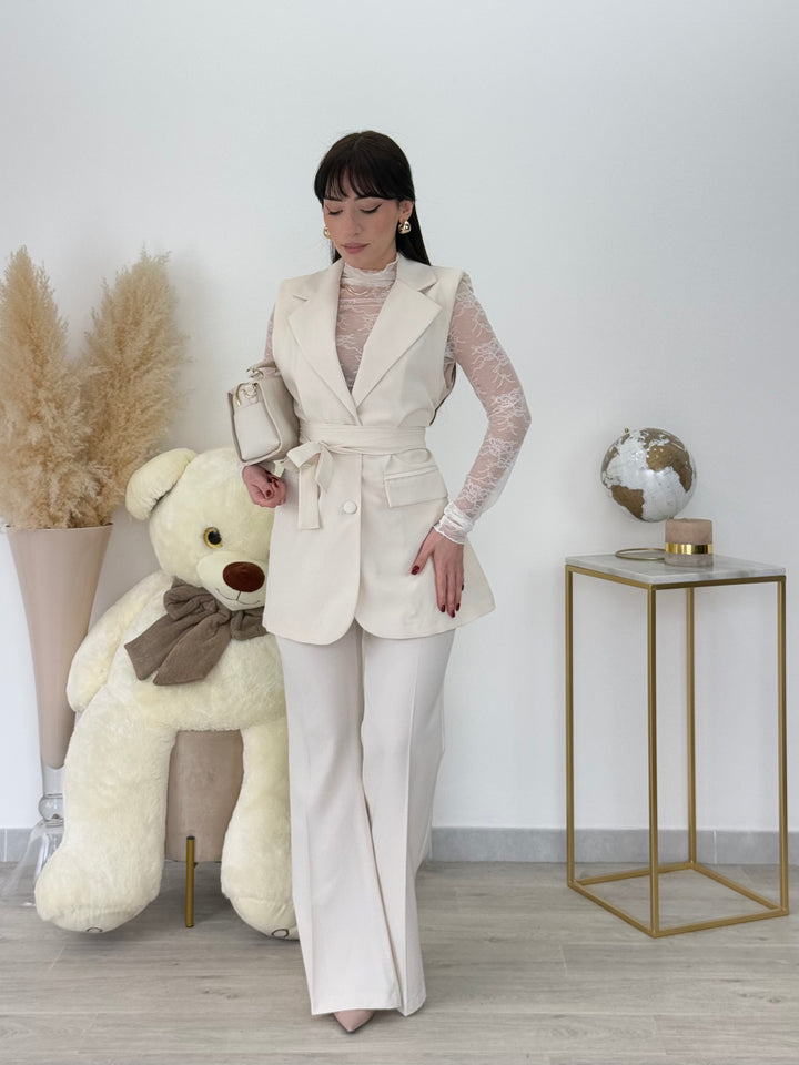 Il nostro Tailleur Erica è composto da smanicato, foderato e chiusura monopetto, inoltre presenta due tasche anteriori a filetto con patta e doppia cintura in vita regolabile per valorizzare il punto vita.