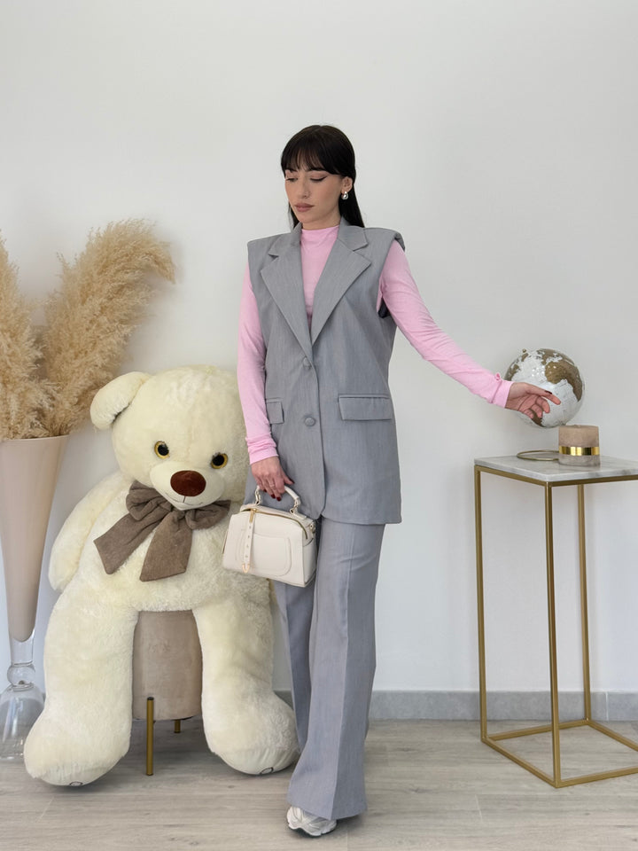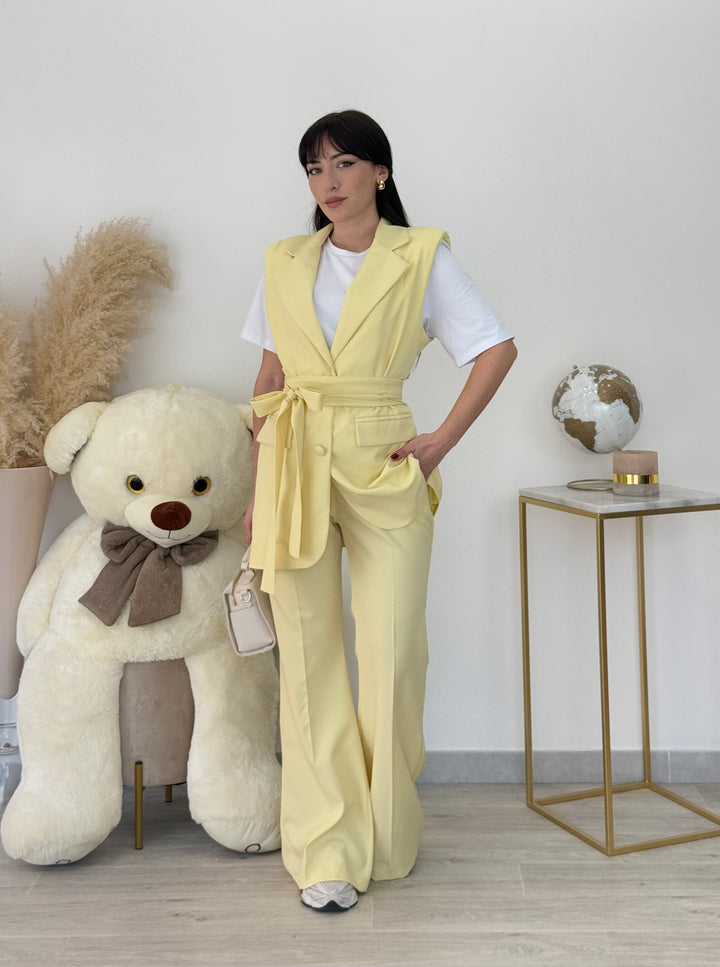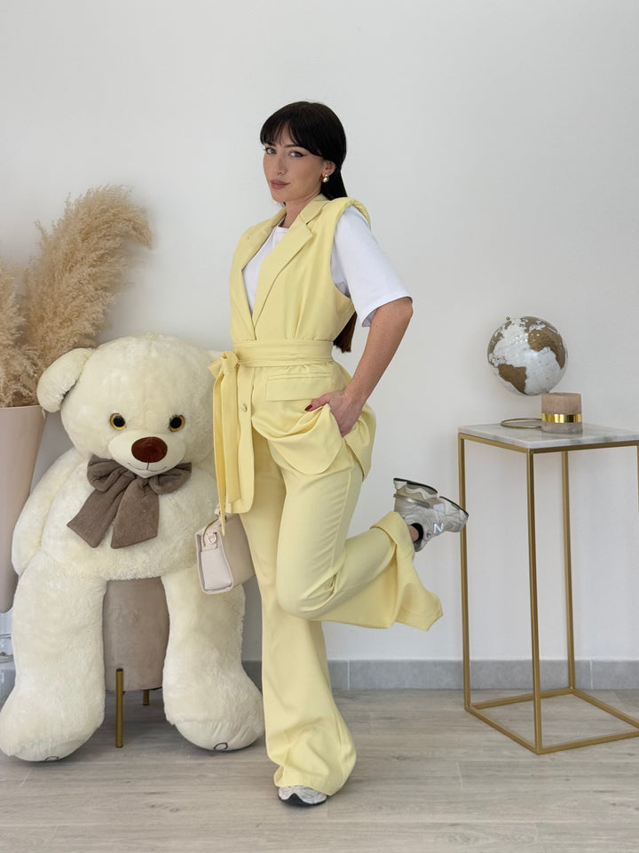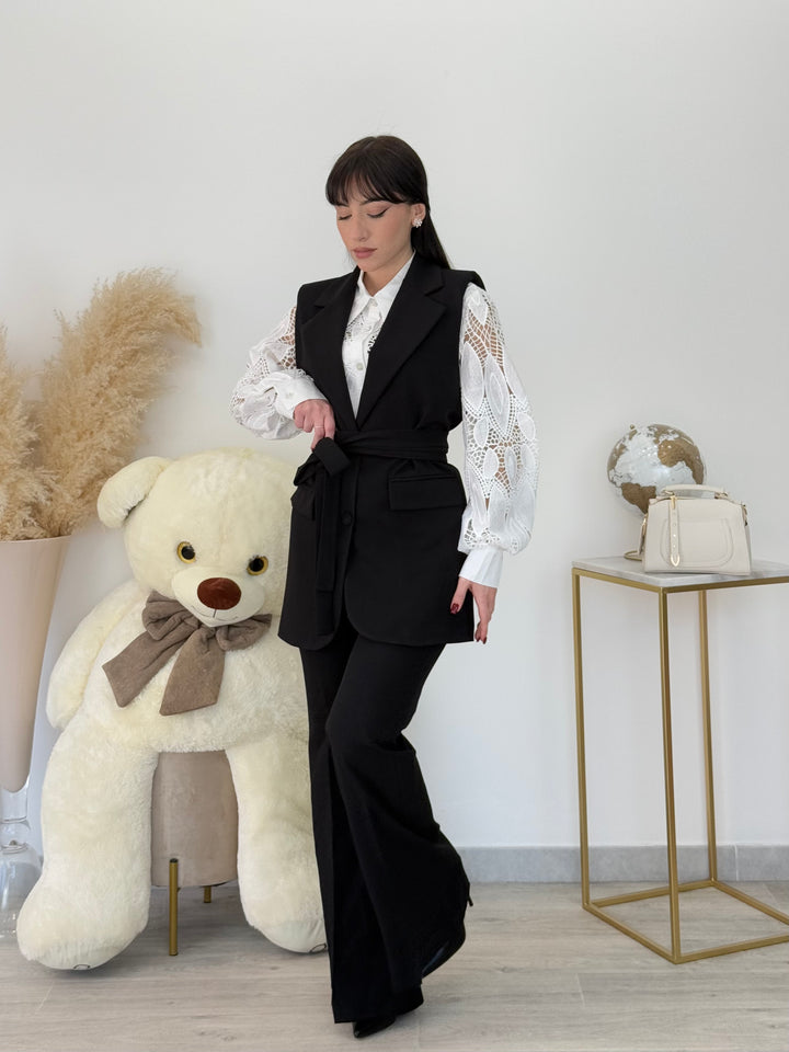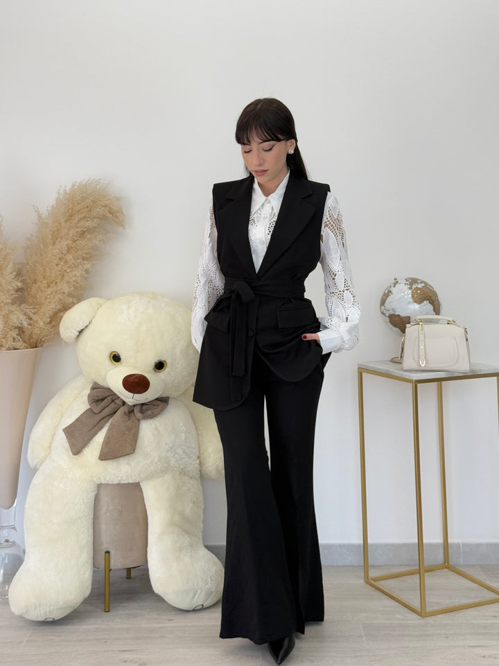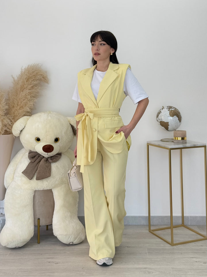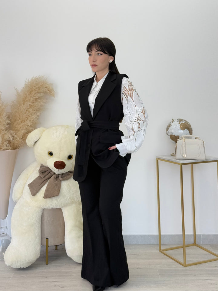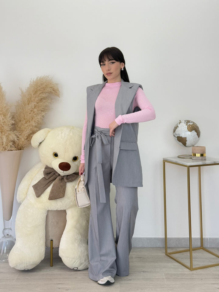 Il nostro Tailleur Erica è composto da smanicato, foderato e chiusura monopetto, inoltre presenta due tasche anteriori a filetto con patta e doppia cintura in vita regolabile per valorizzare il punto vita.
