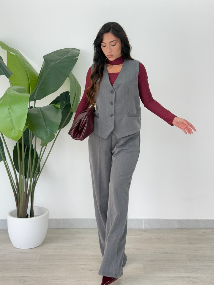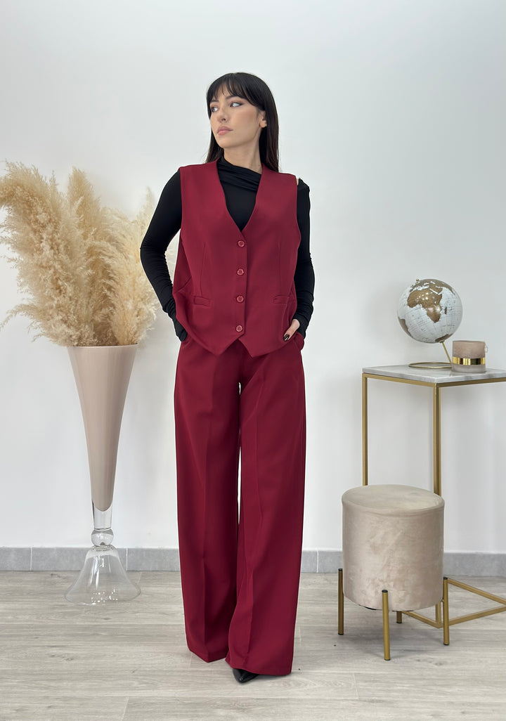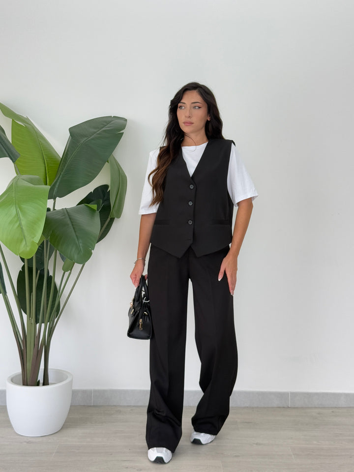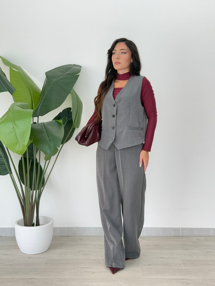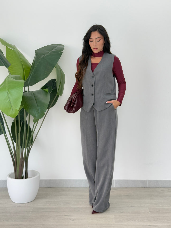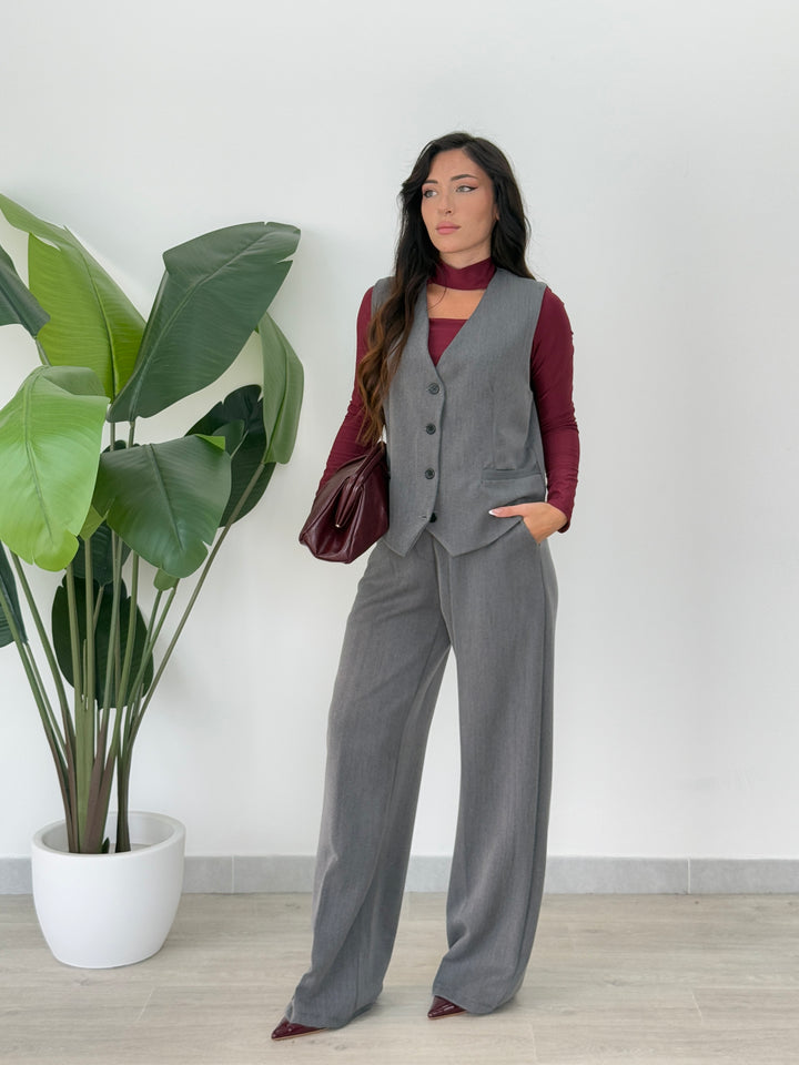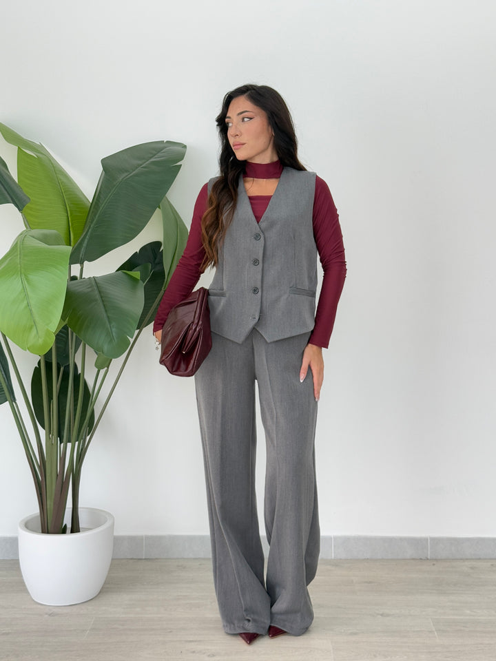 Composto da gilet con bottoni ,foderato all’interno e pantalone mod palazzo con elastico sul retro, bottone e zip. Perfetto sia per le tue occasioni importanti che per la tua quotidianità.Vestibilità regular .