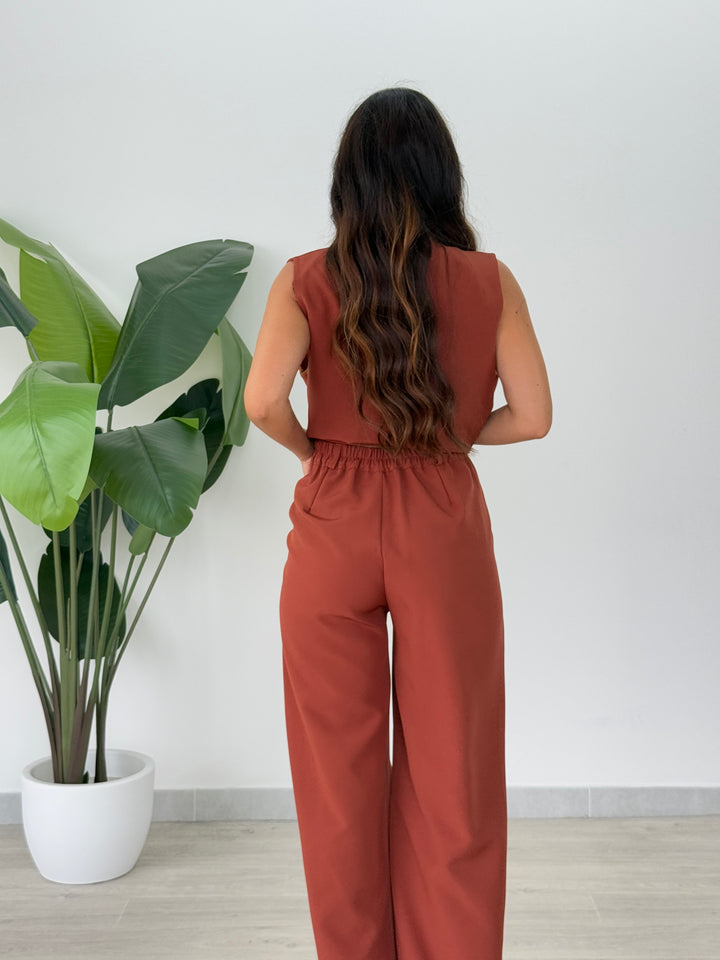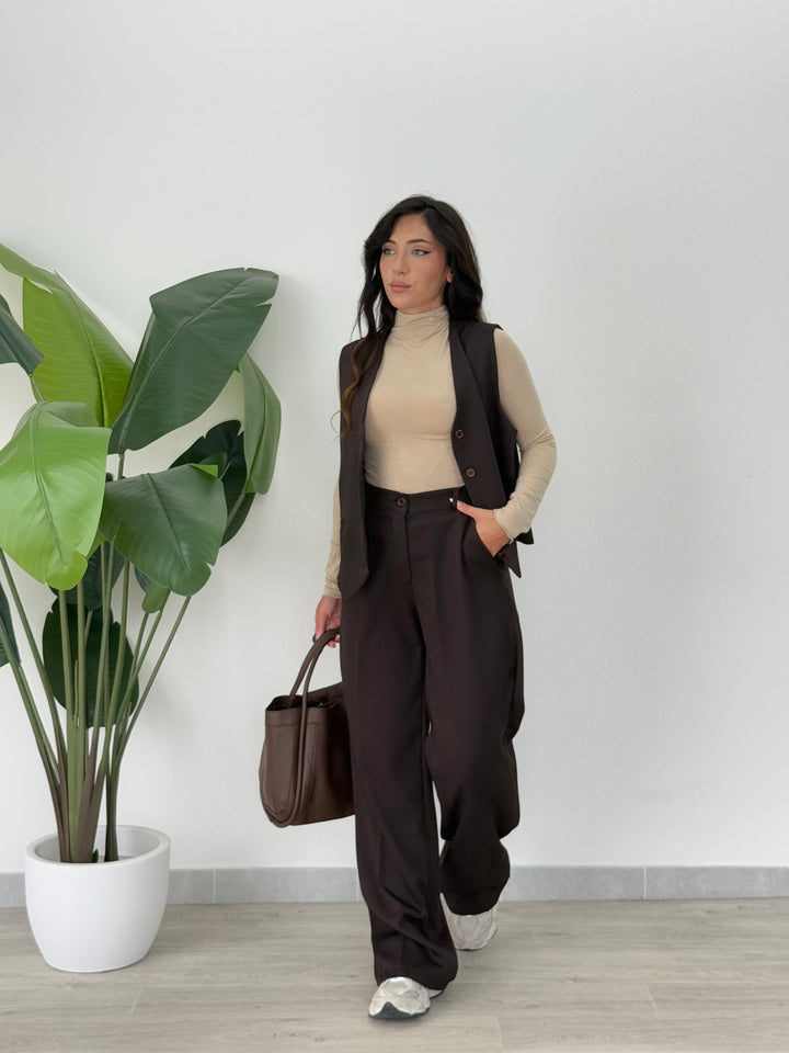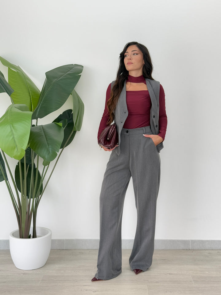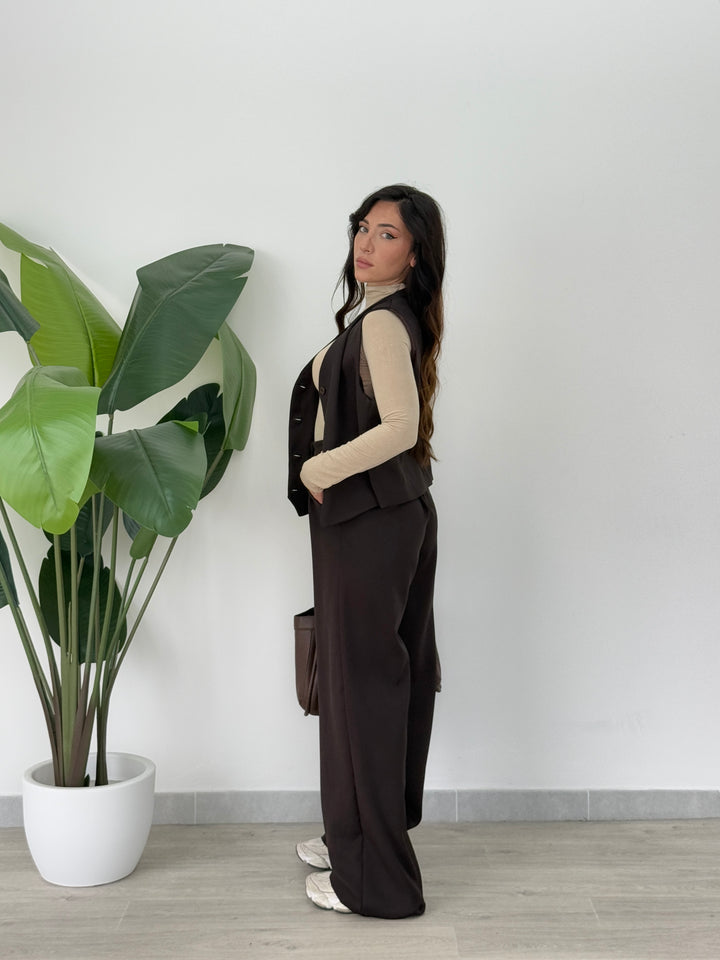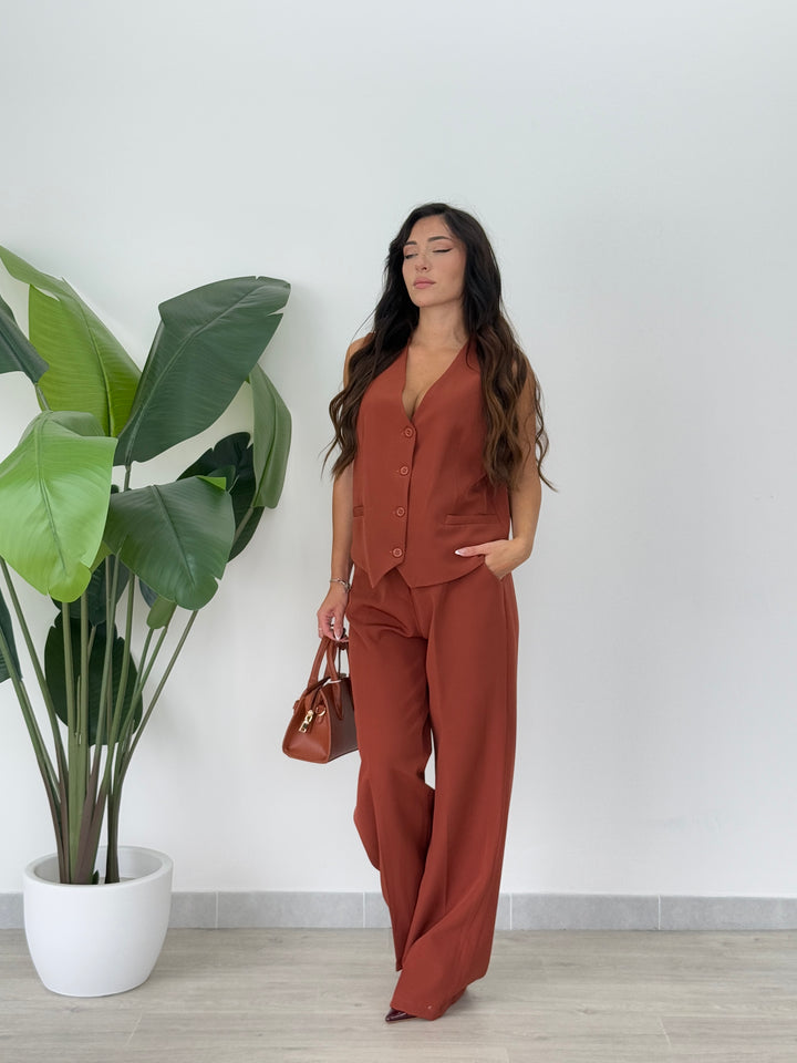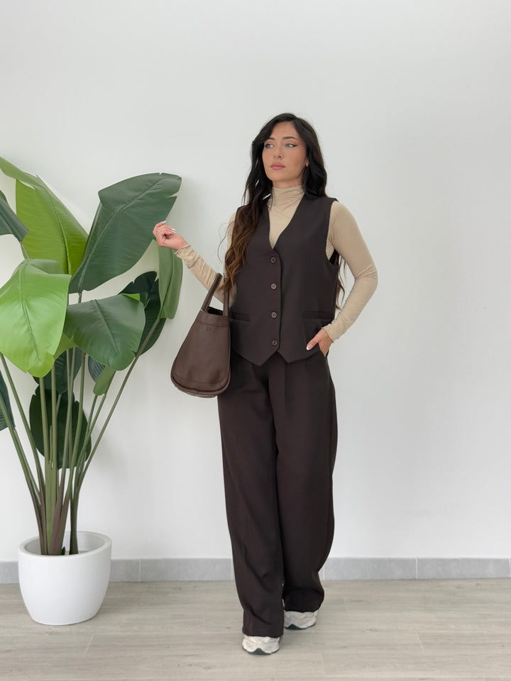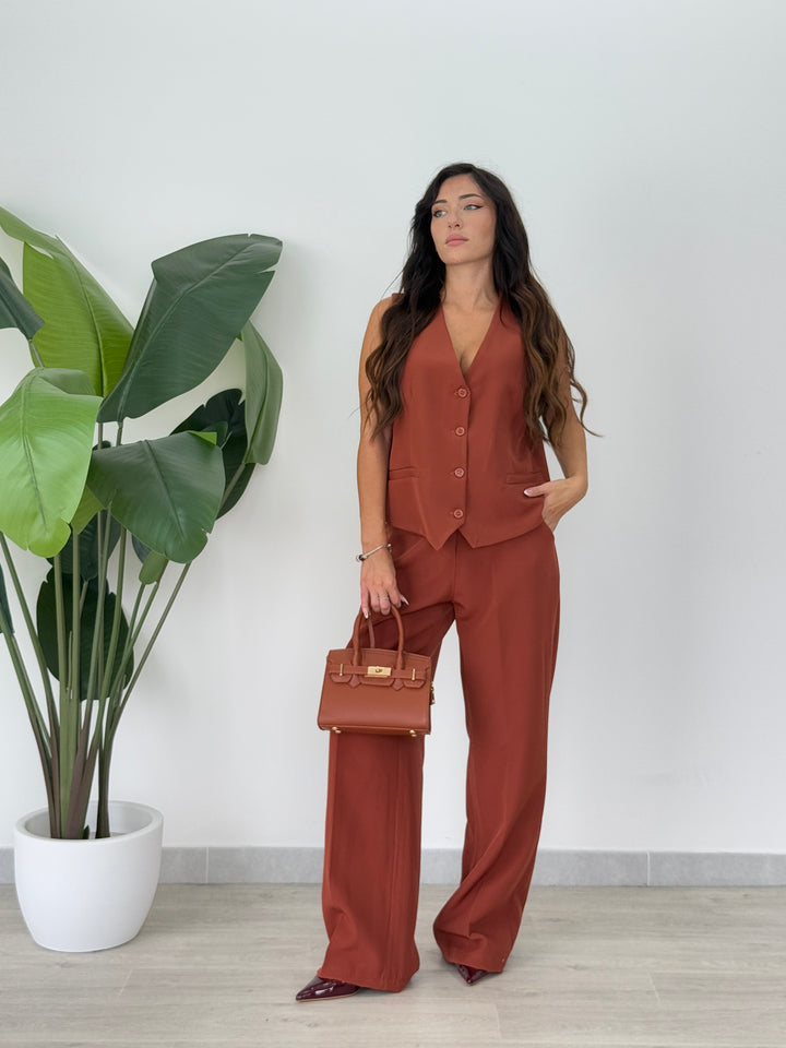 Composto da gilet con bottoni ,foderato all’interno e pantalone mod palazzo con elastico sul retro, bottone e zip. Perfetto sia per le tue occasioni importanti che per la tua quotidianità.Vestibilità regular .