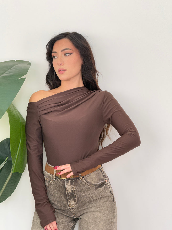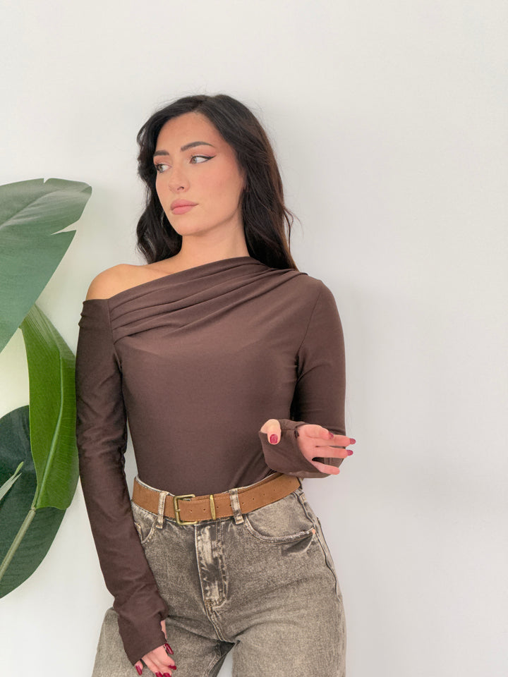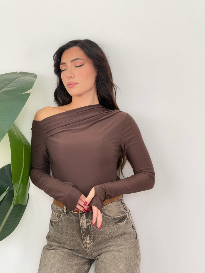 Body Yara realizzato in licra elasticizzata. Modello con scollo asimmetrico con maniche lunghe a guanto . Perfetto per qualsiasi outfit . Vestibilità elasticizzata