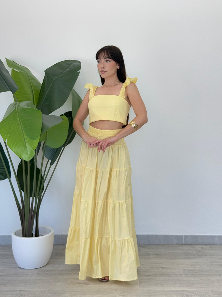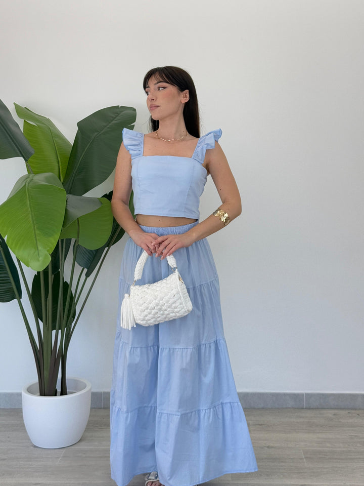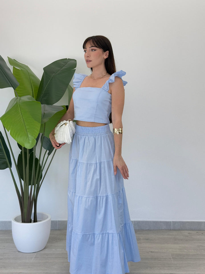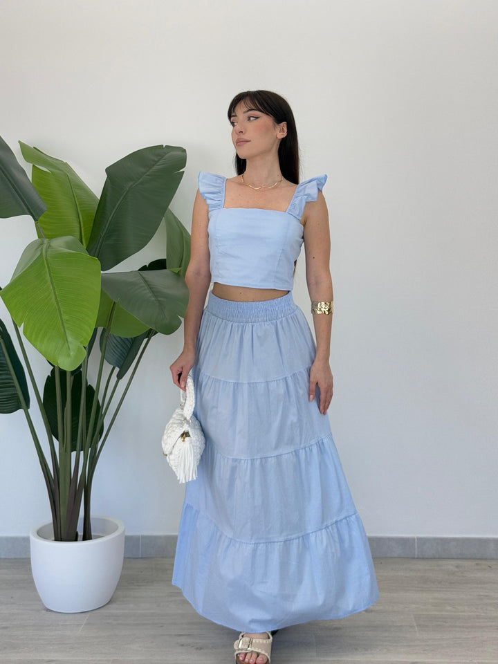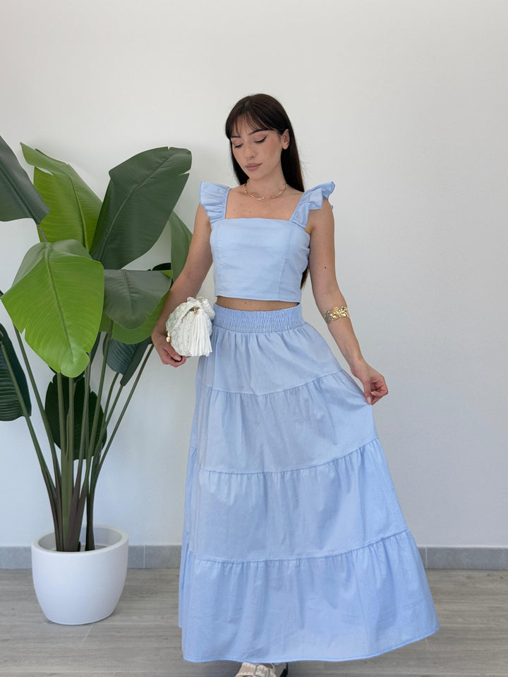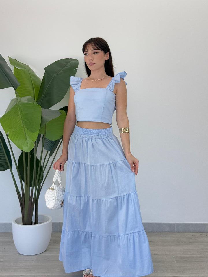 Coordinato Ostuni realizzato in cotone(100%). Coordinato composto da top con coppe preformate,elastico sul retro e spalline con volant elasticizzate e gonna con elastico in vita a campana. Perfetto per qualsiasi occasione. Vestibilitá elasticizzata.