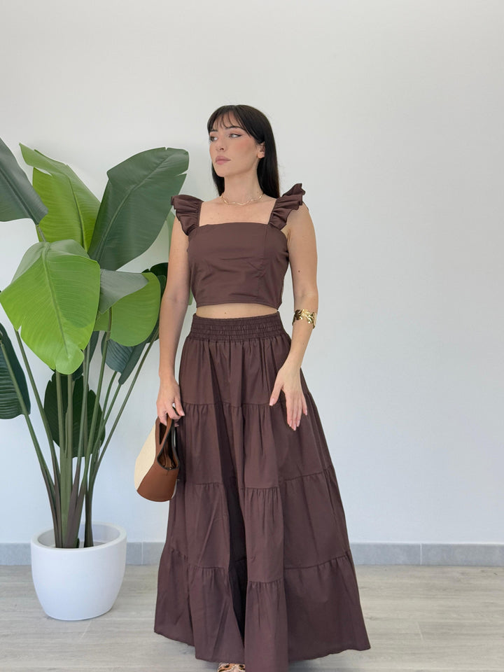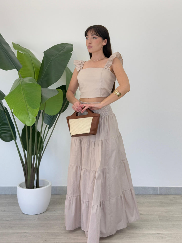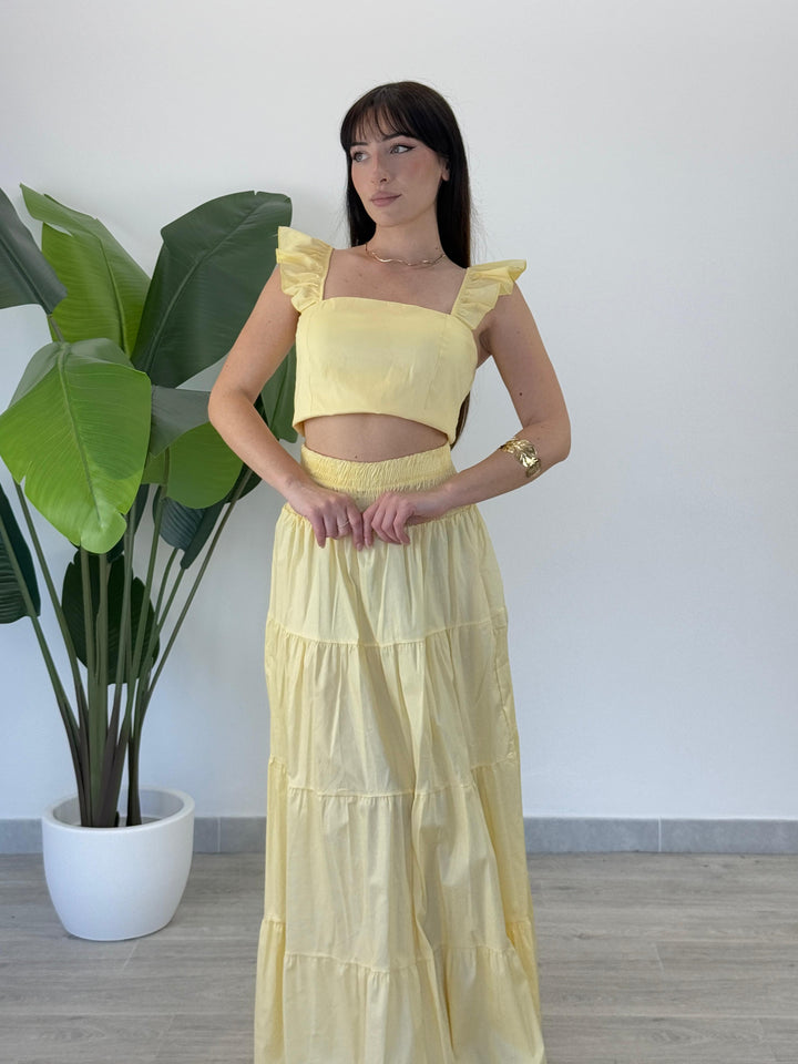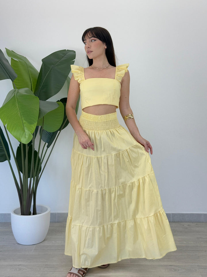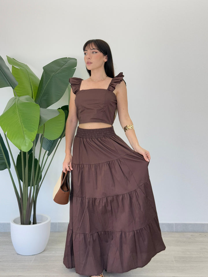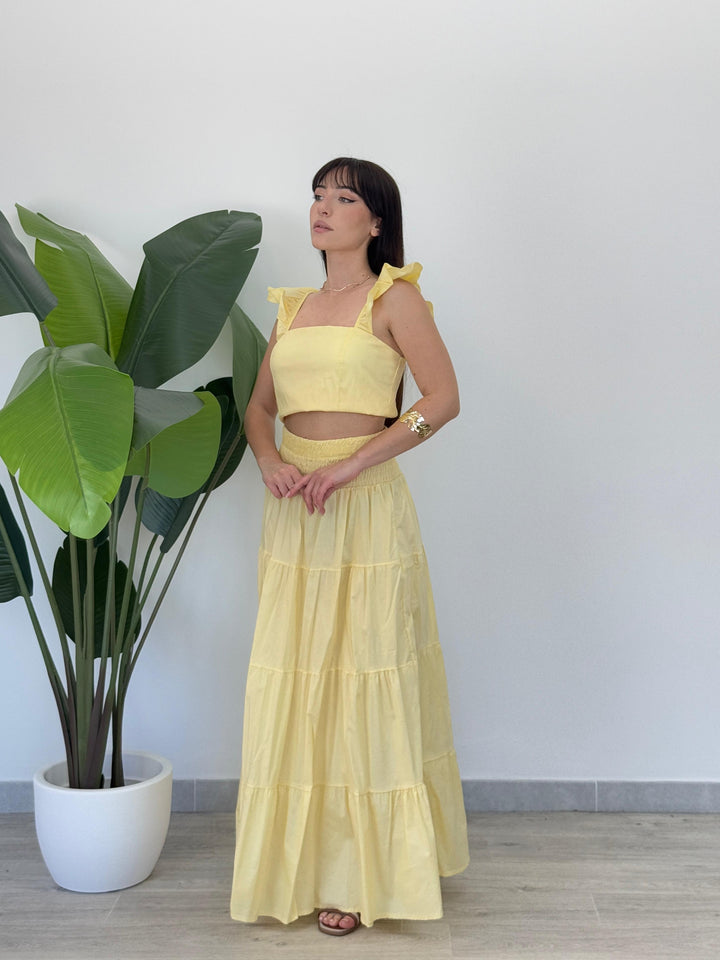 Coordinato Ostuni realizzato in cotone(100%). Coordinato composto da top con coppe preformate,elastico sul retro e spalline con volant elasticizzate e gonna con elastico in vita a campana. Perfetto per qualsiasi occasione. Vestibilitá elasticizzata.