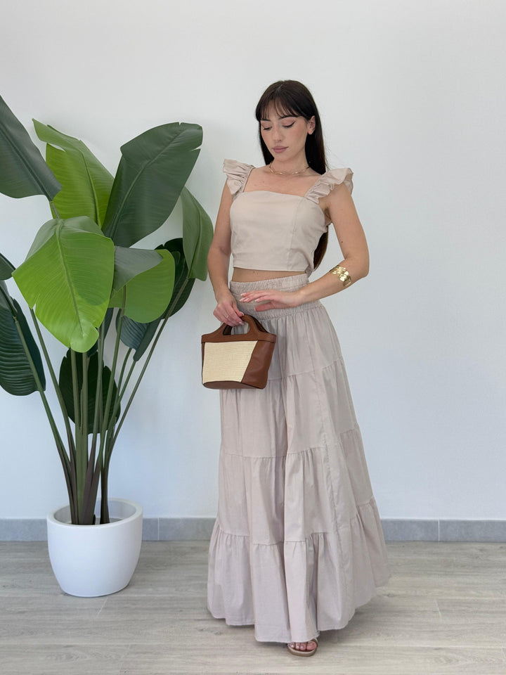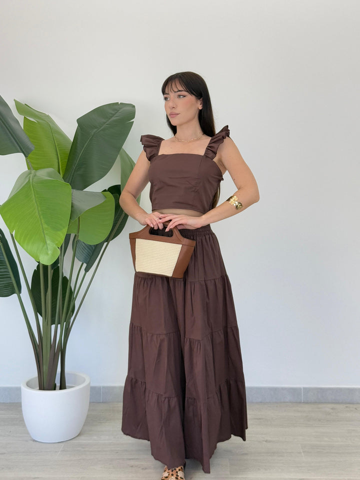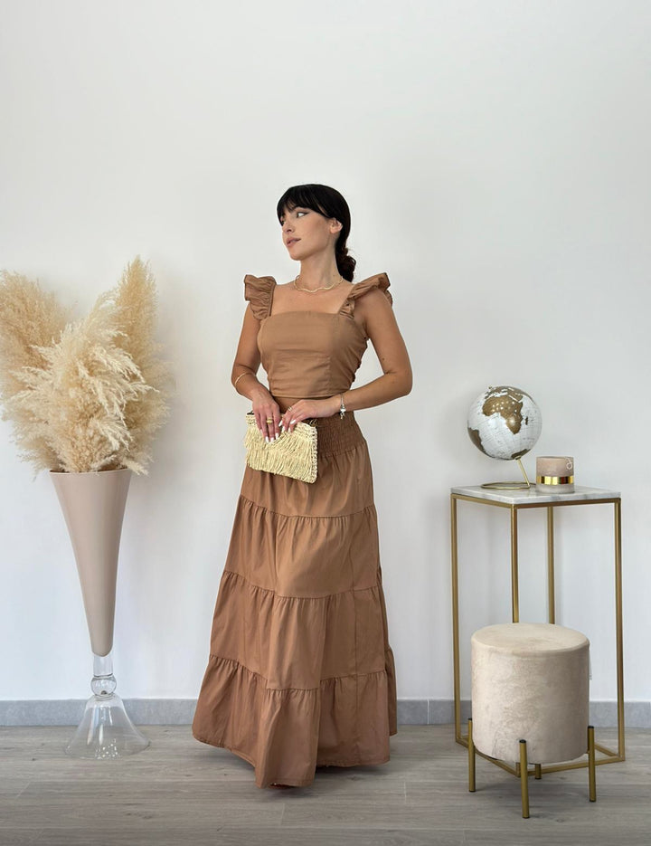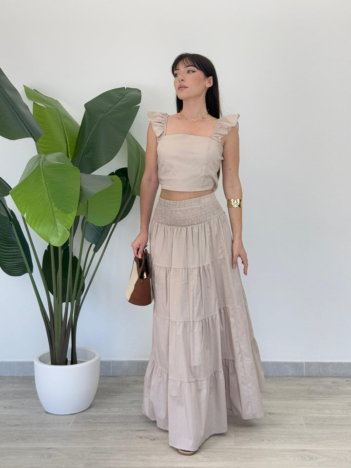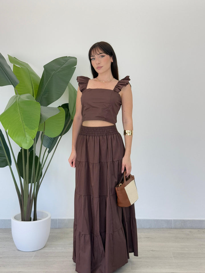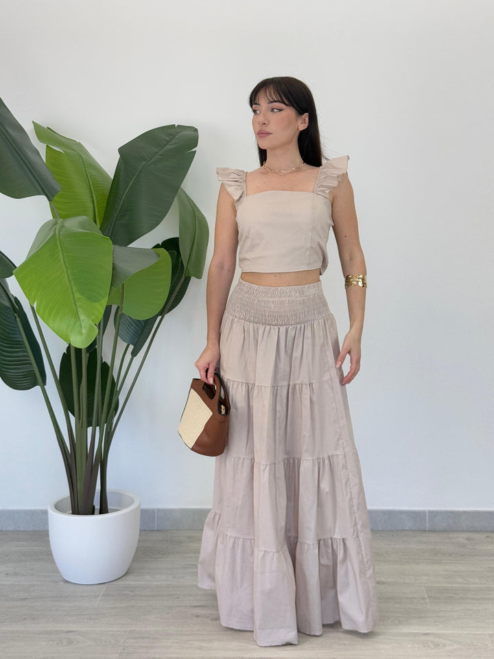 Coordinato Ostuni realizzato in cotone(100%). Coordinato composto da top con coppe preformate,elastico sul retro e spalline con volant elasticizzate e gonna con elastico in vita a campana. Perfetto per qualsiasi occasione. Vestibilitá elasticizzata.