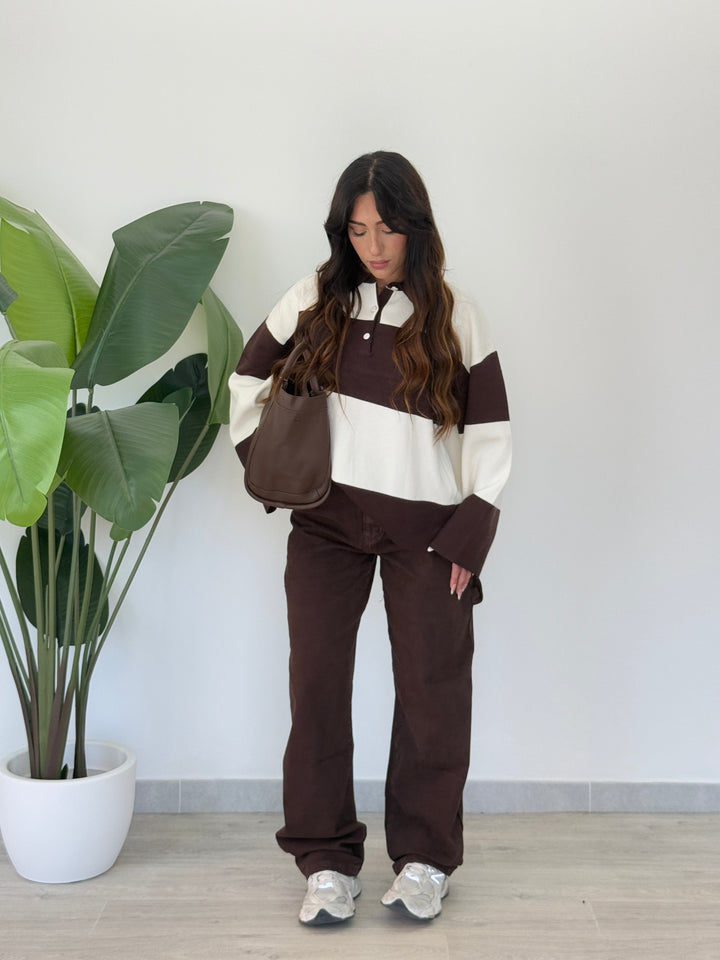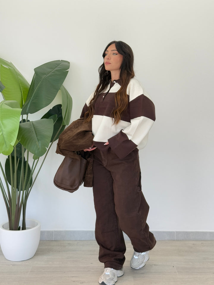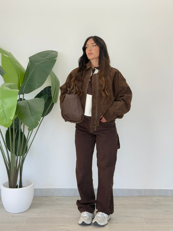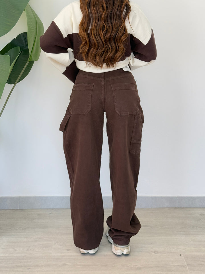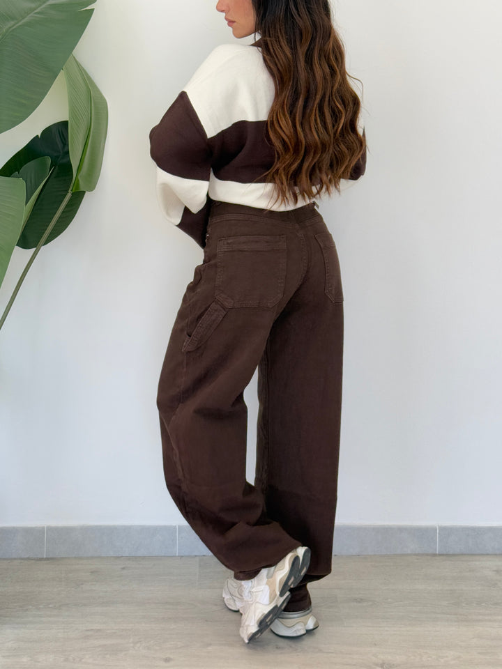 Jeans ballon Marrone , Realizzato su tela semi elastica di qualitá con tasche e passanti per cintura, zip e bottone. Perfetto per qualsiasi outfit. Vestibilità regular.