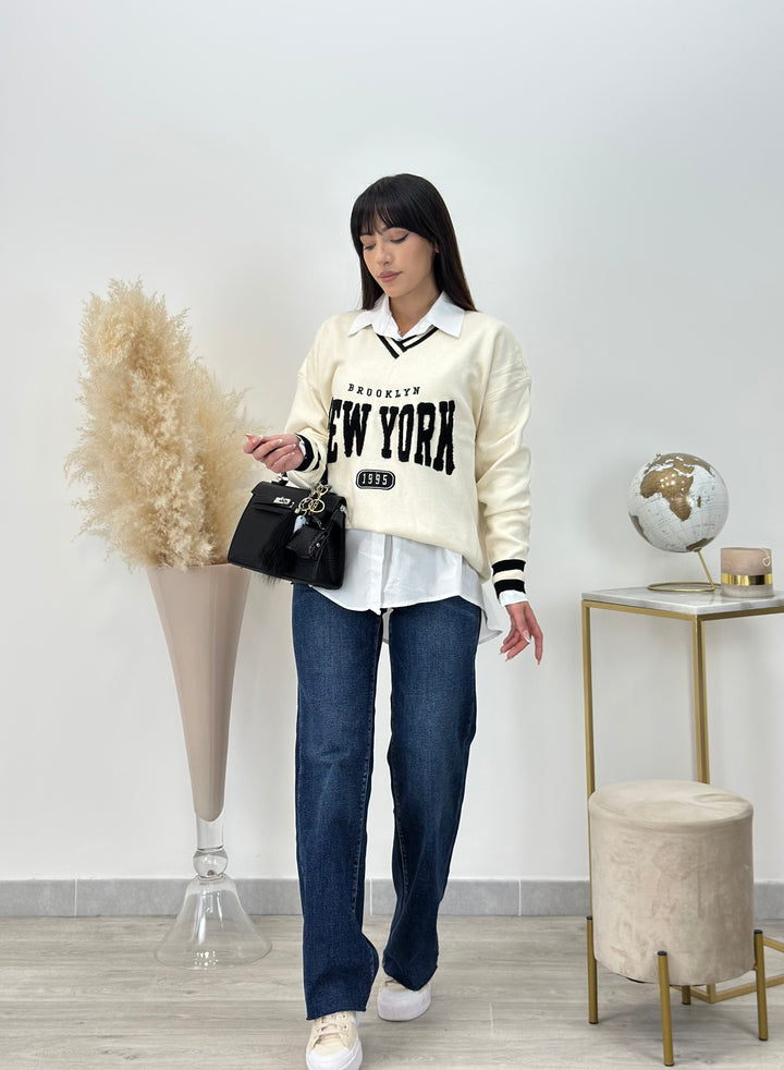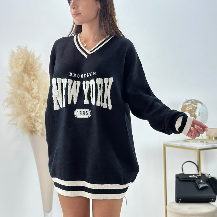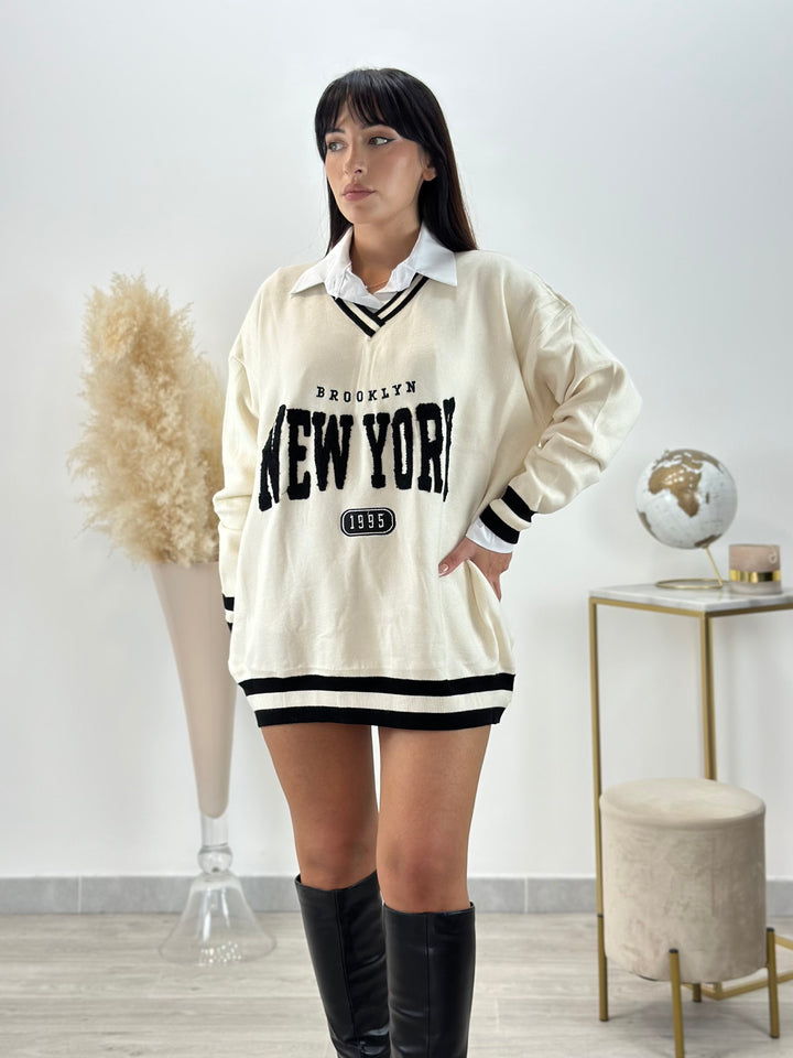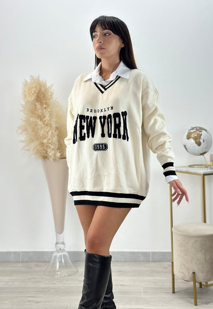 Scopri il nostro Maxi pull New York 2.0,realizzato in lana pettinata.Modello college dritto con Collo a V, Maniche lunghe , scritta centrale ed estremità a contrasto. Perfetto per chi ama la comodità, ma allo stesso tempo essere sempre alla moda ideale per qualsiasi outfit. VESTIBILITÁ elasticizzata .