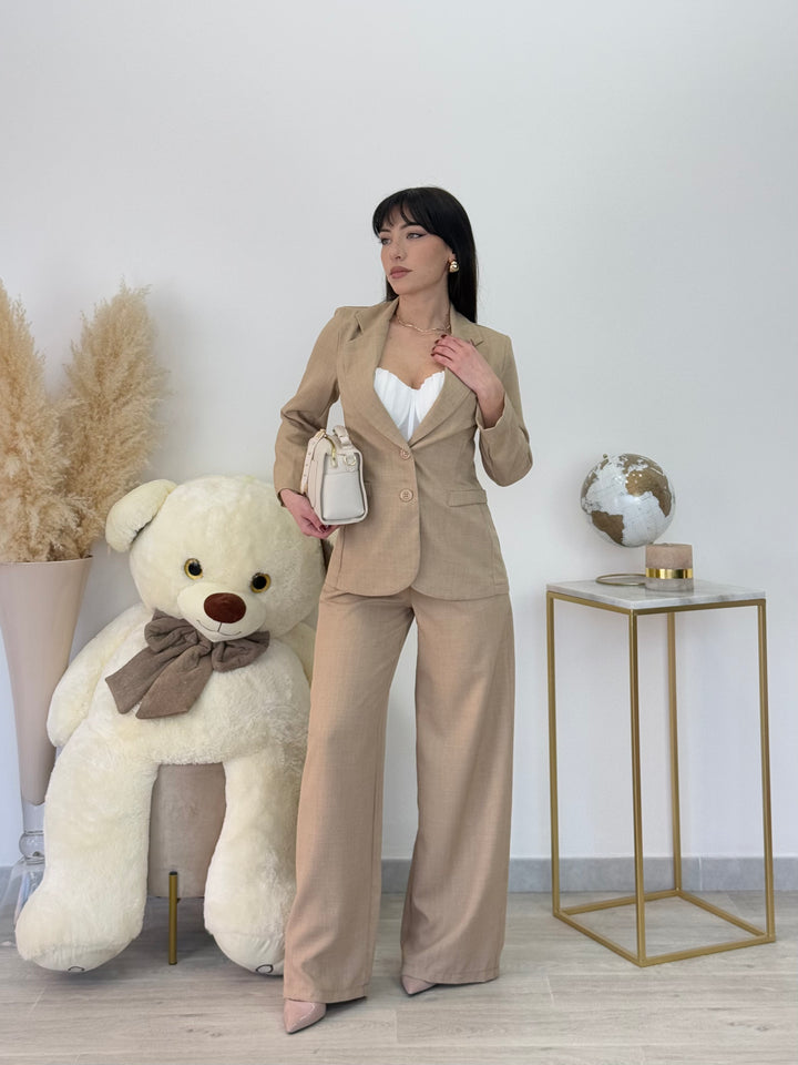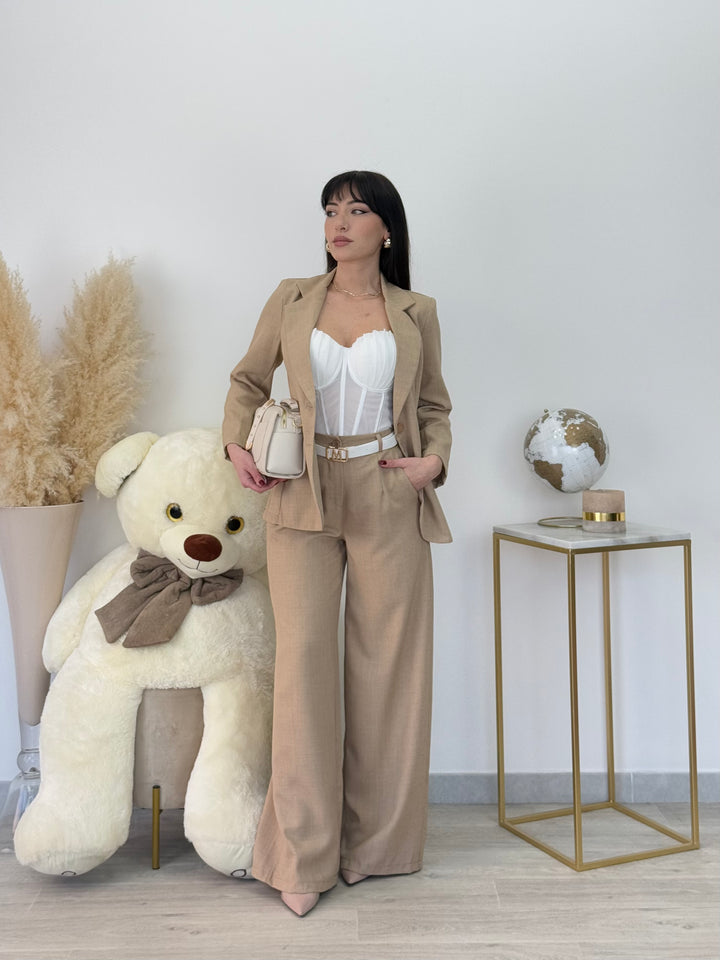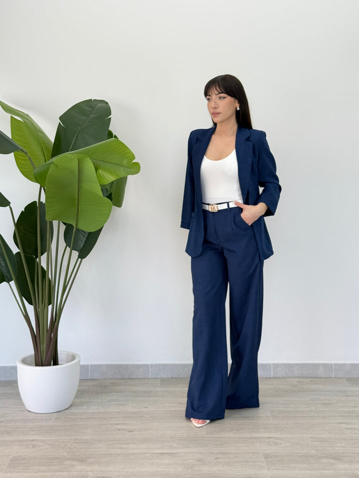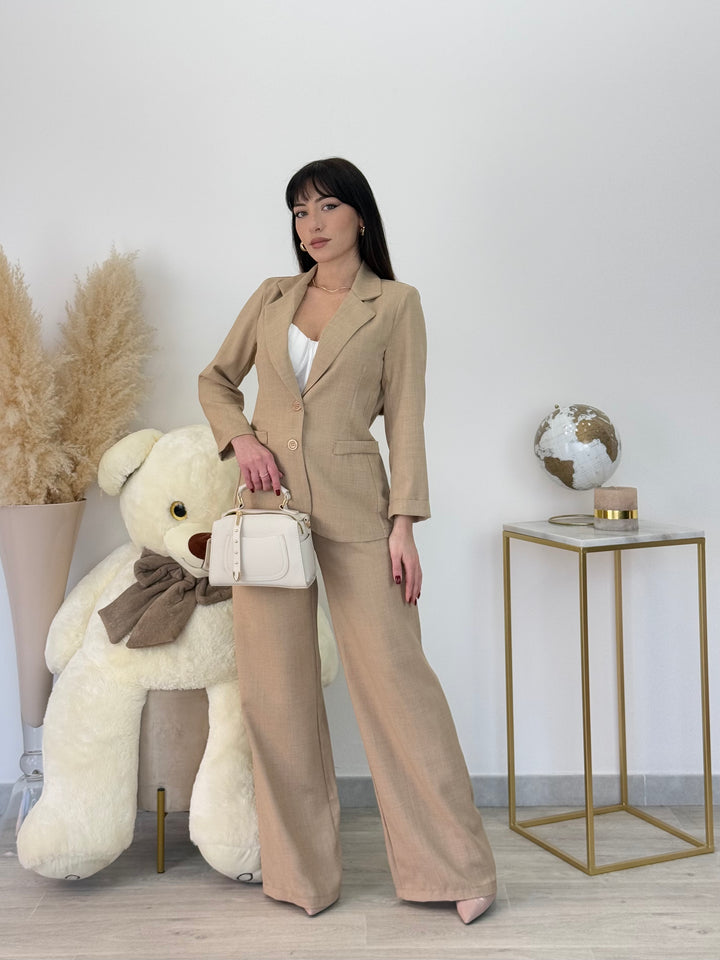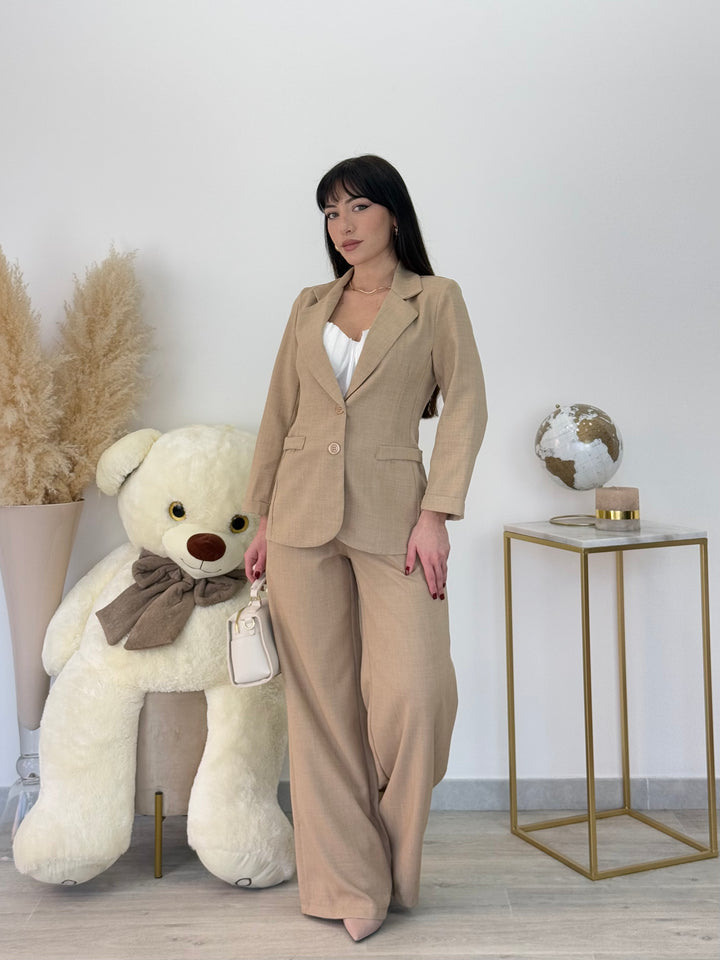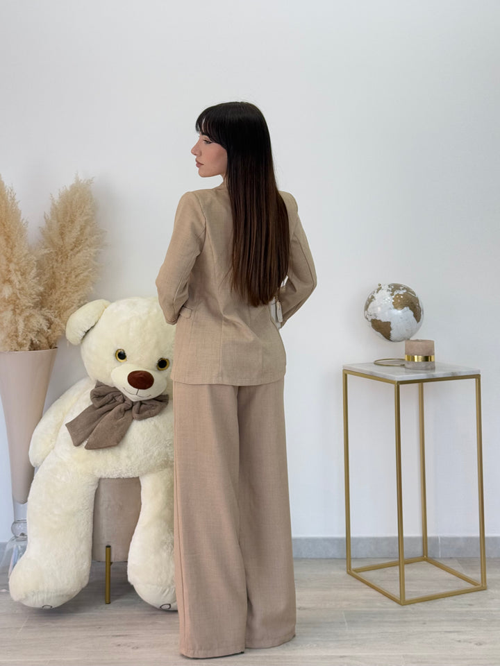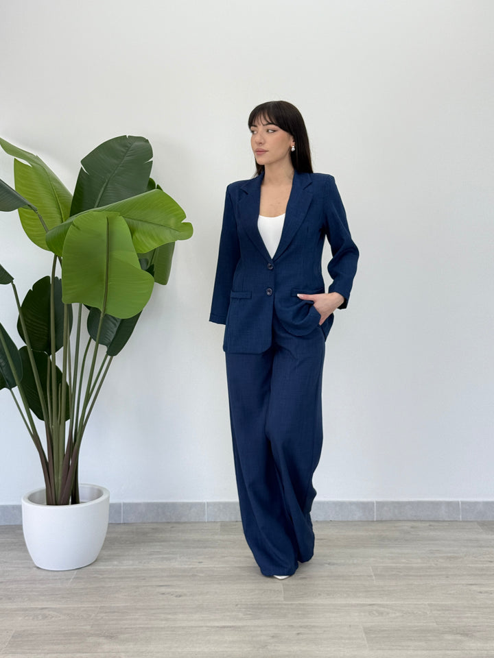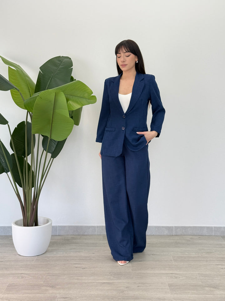 Tailleur in simil Lino di qualità . Presenta una giacca sfoderata con spalline imbottite , rever classico e due finte tasche laterali . Pantaloni a palazzo con bottone zip e elastico posteriore. È un tailleur perfetto per le tue occasioni speciali,ma anche per la tua quotidianità ! Vestibilitá regular.