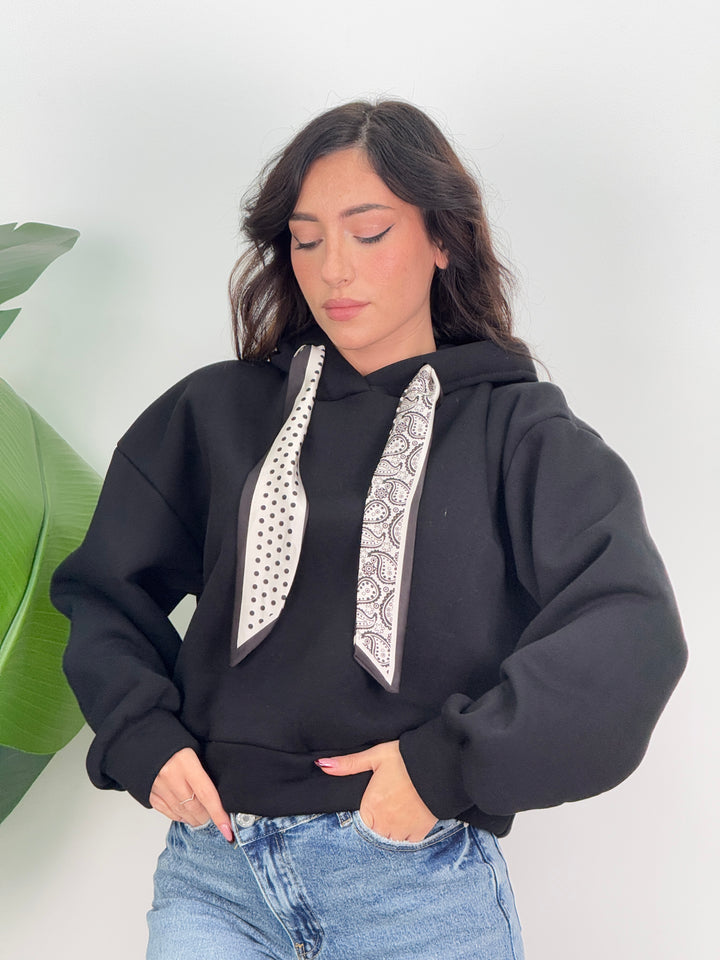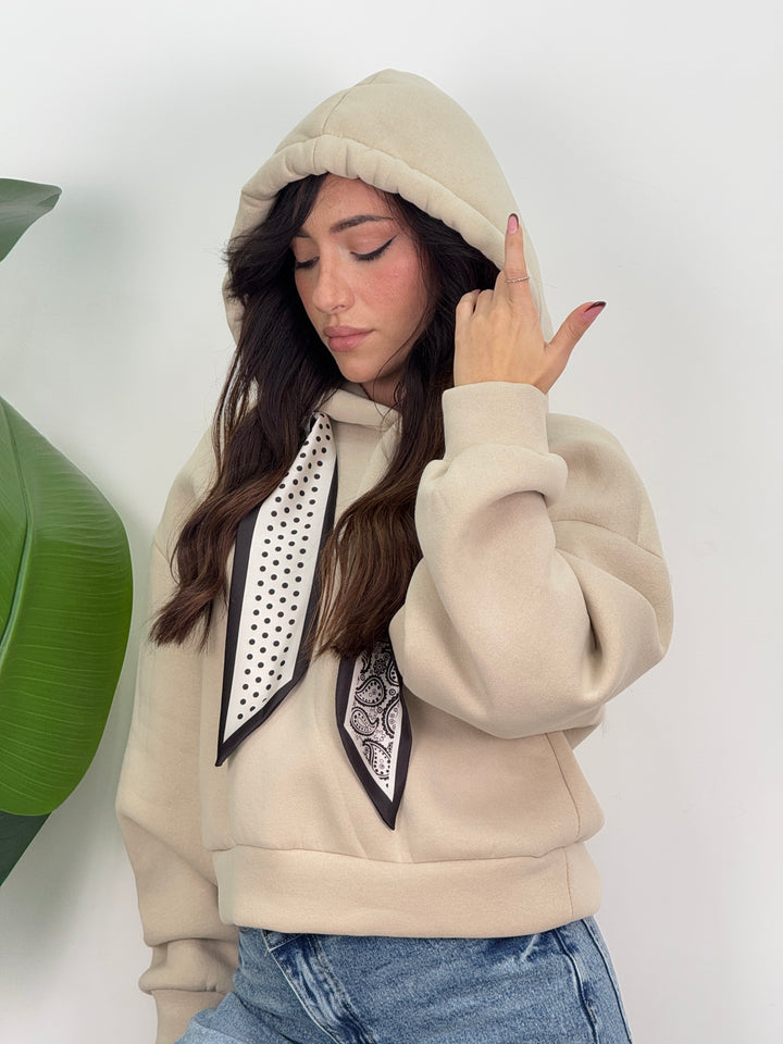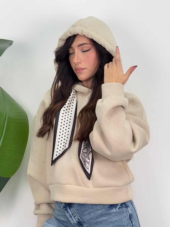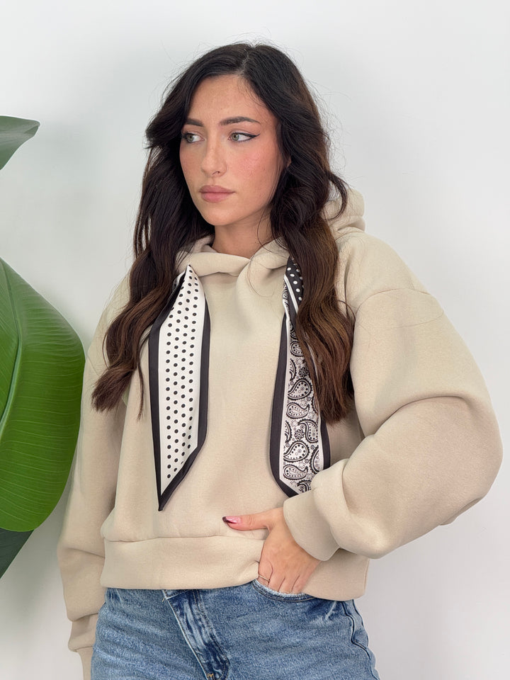 Scopri la felpa Angie! Felpa con cappuccio con lacci decorativi(felpata all’ interno). Ideale per un look caldo, comodo e pratico.