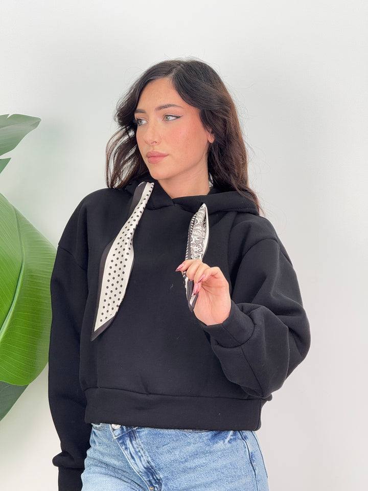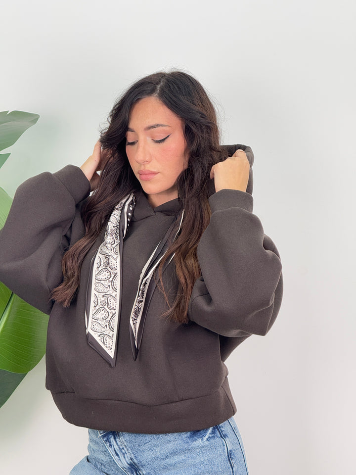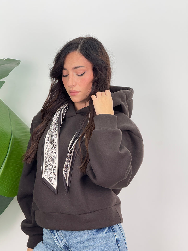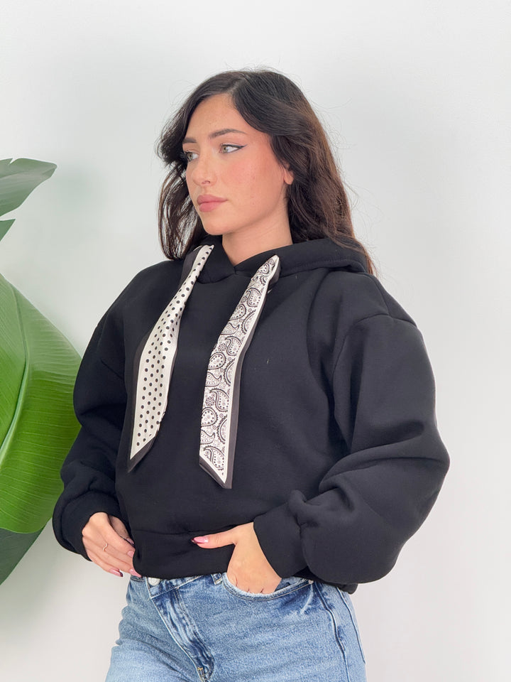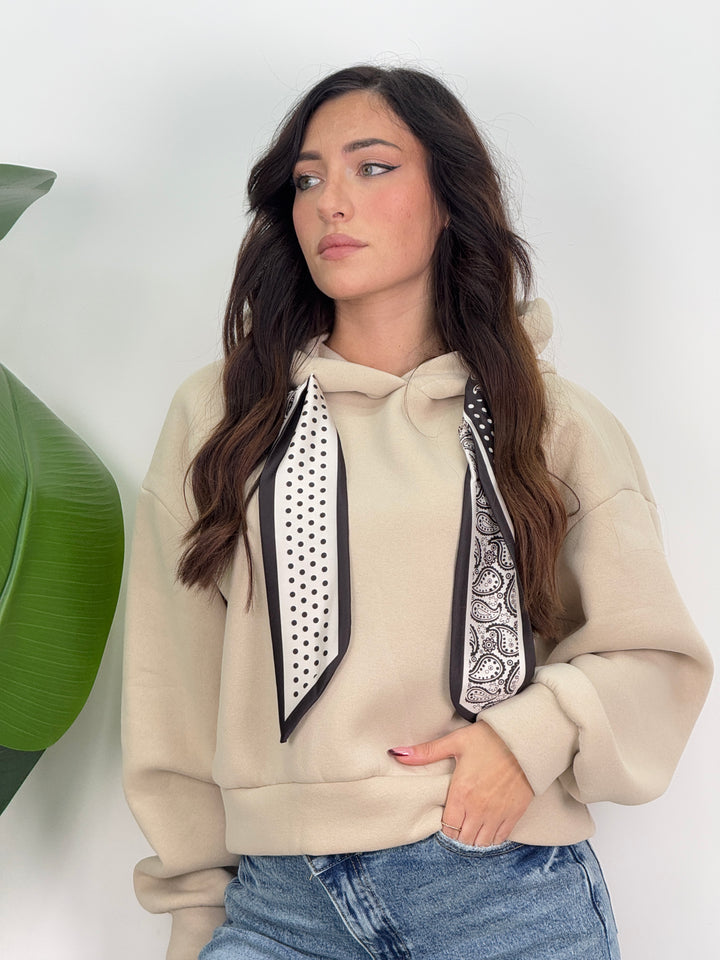 Scopri la felpa Angie! Felpa con cappuccio con lacci decorativi(felpata all’ interno). Ideale per un look caldo, comodo e pratico.