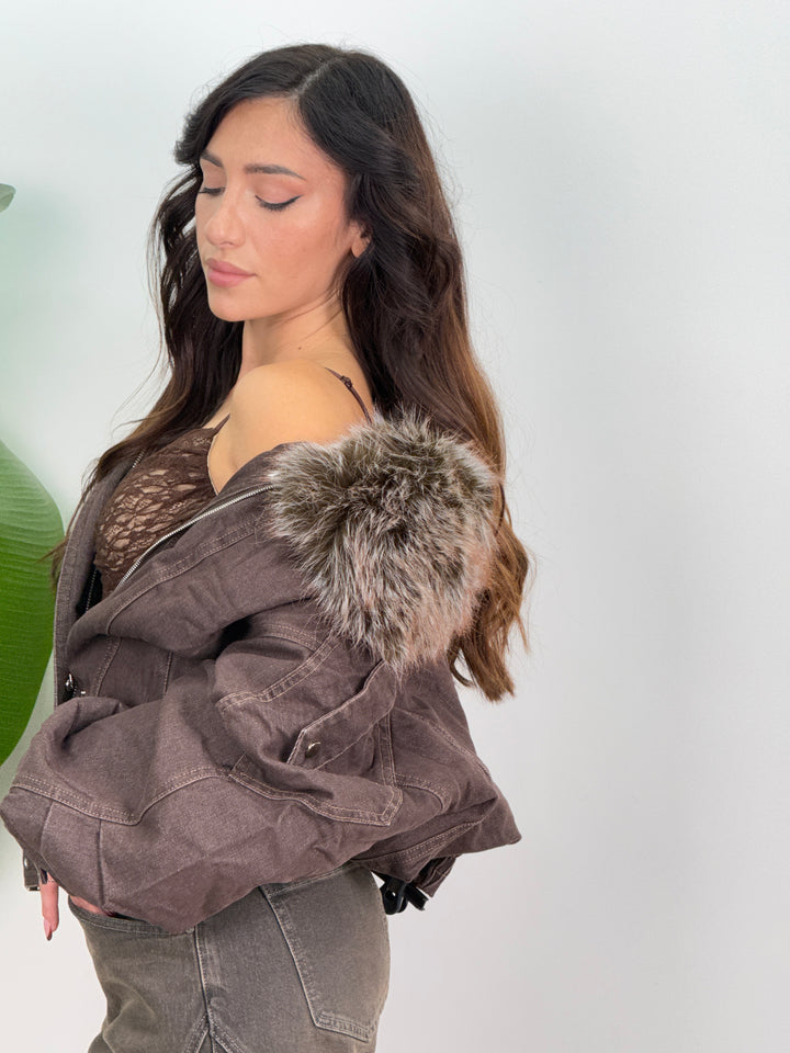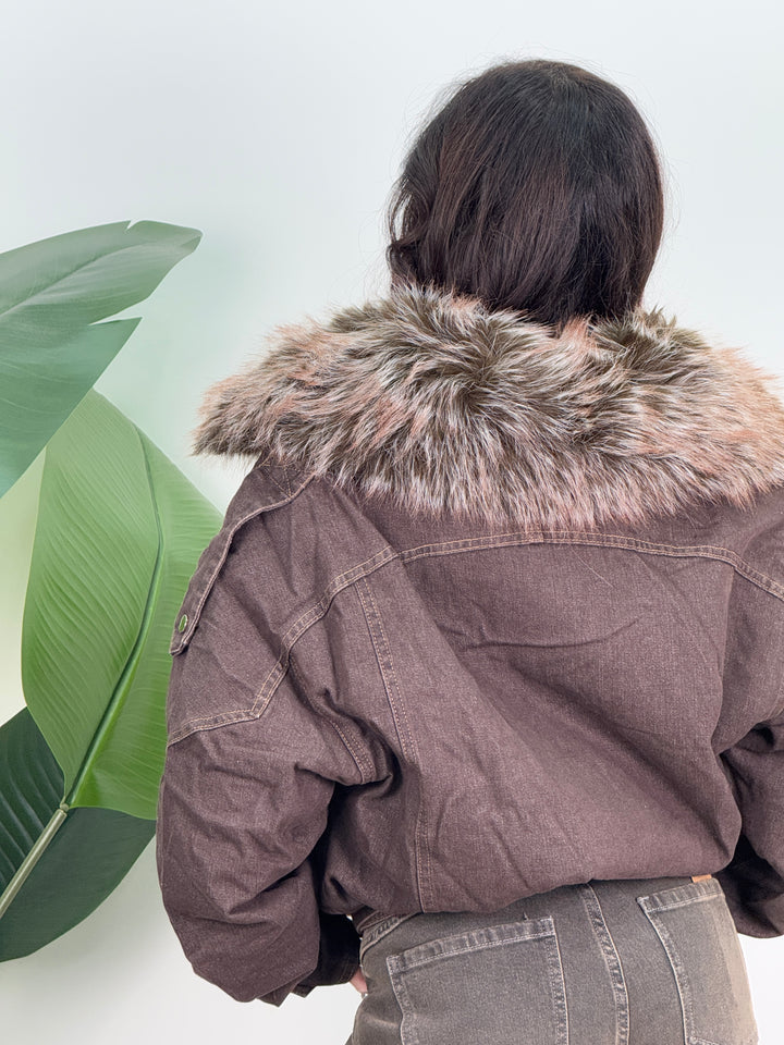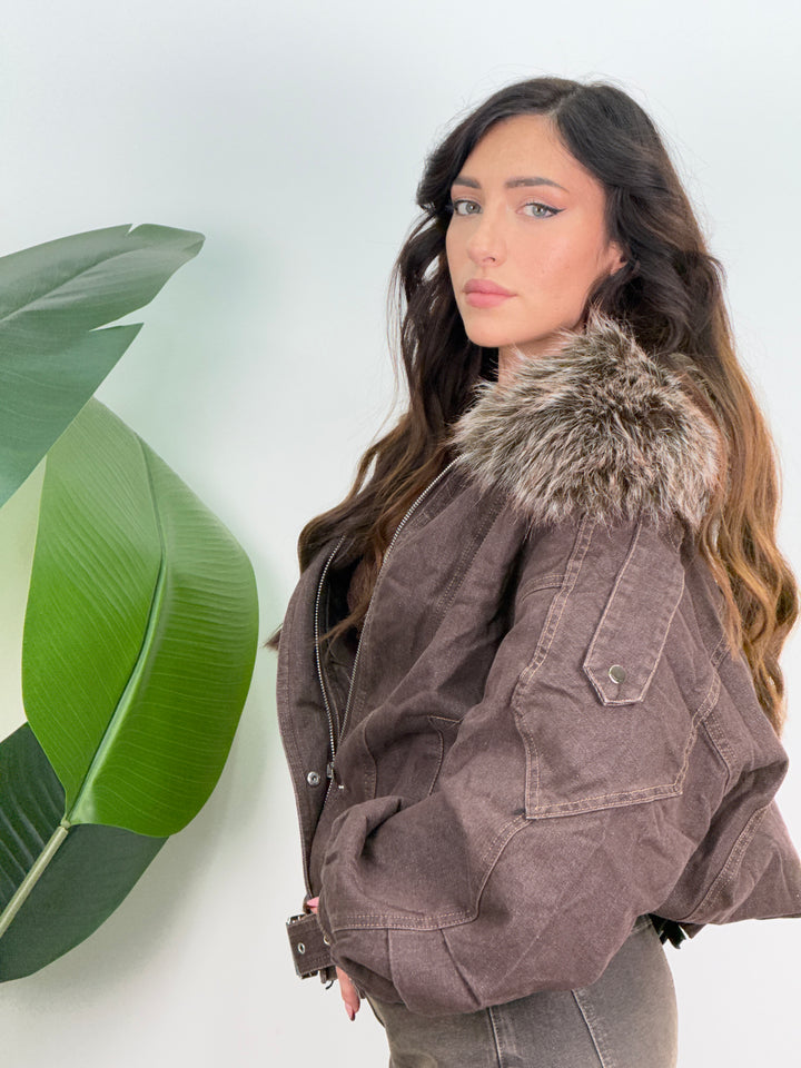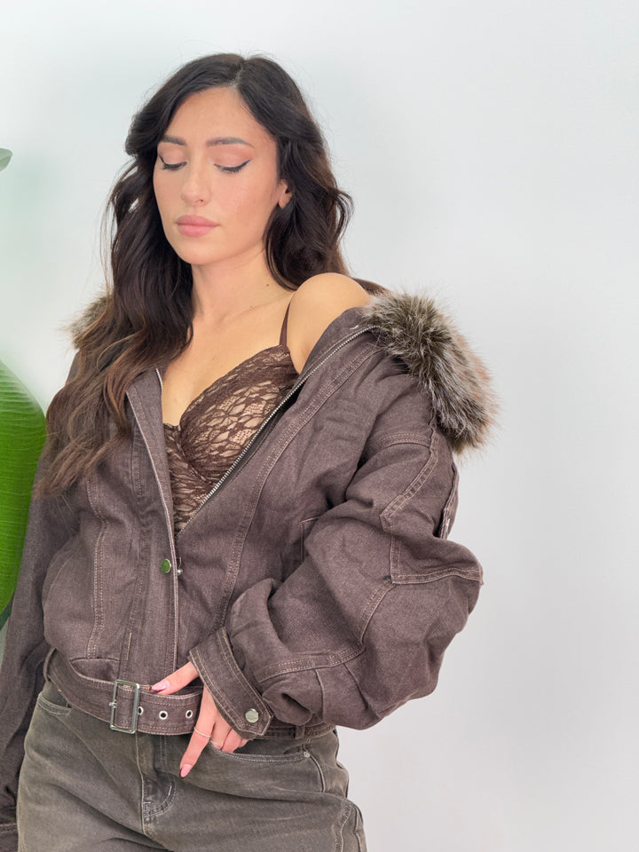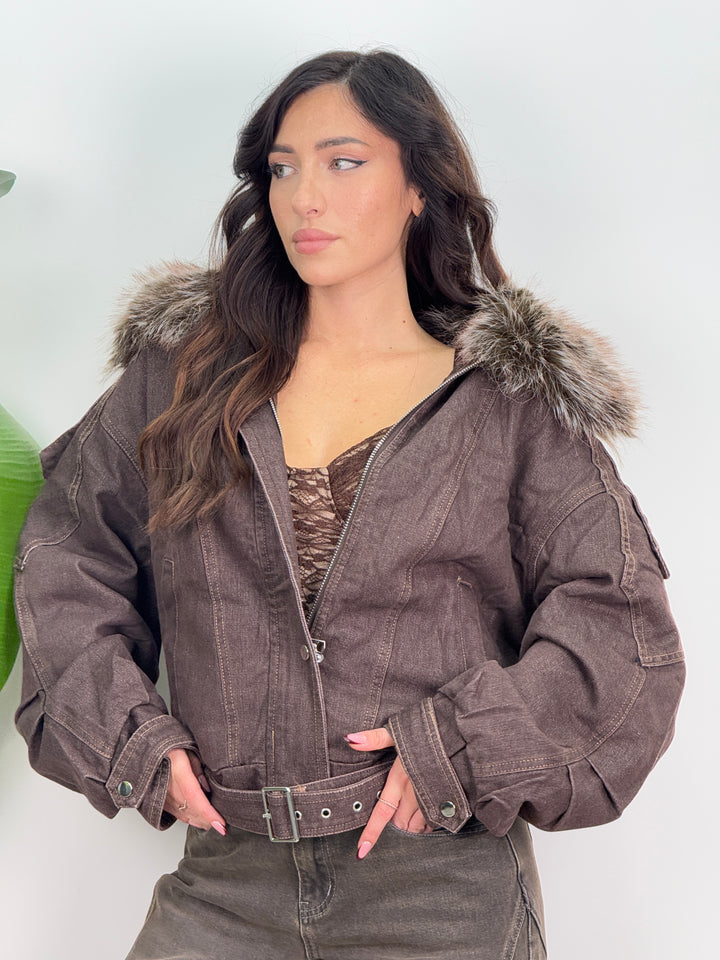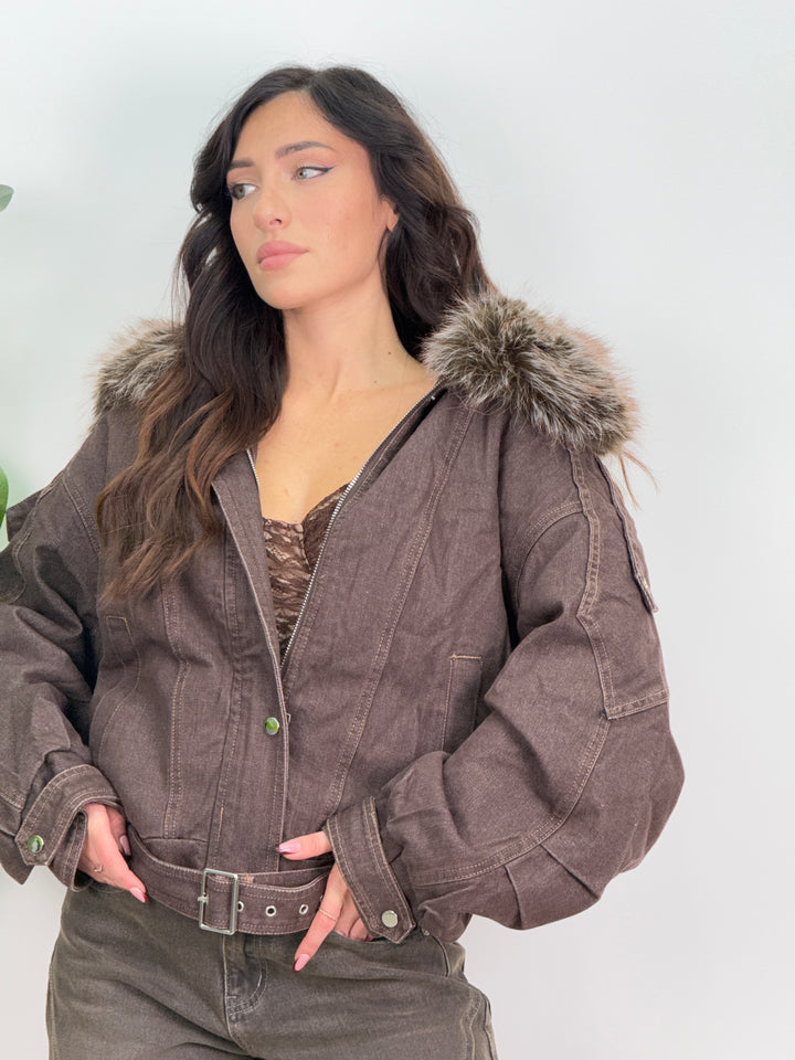 Scopri la giacca Maeve! Giacca oversize in denim marrone con colletto in pelliccia, cintura regolabile in vita e bottoni a pressione. Maniche ampie e polsini con cinturino regolabile. Ideale a vista per un look strutturato e casual.