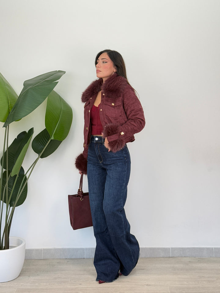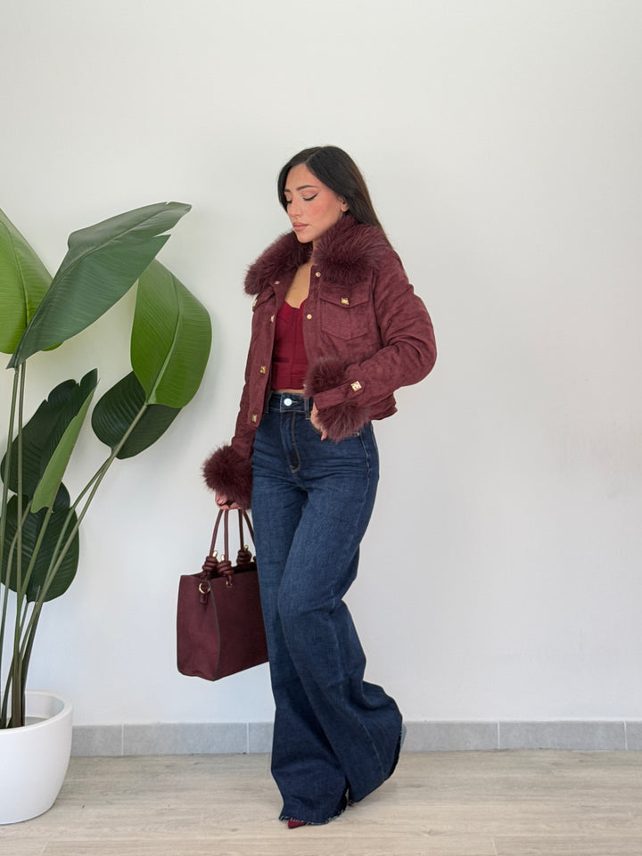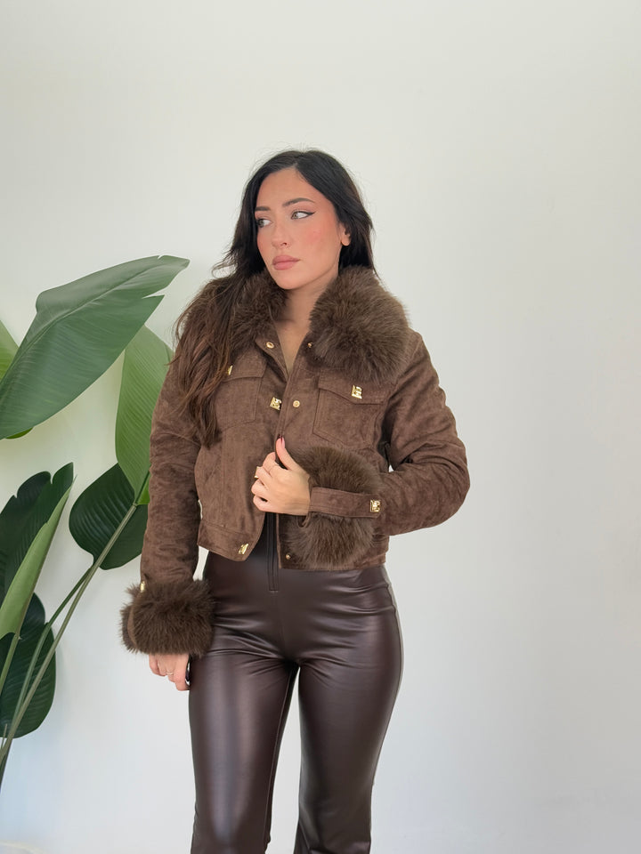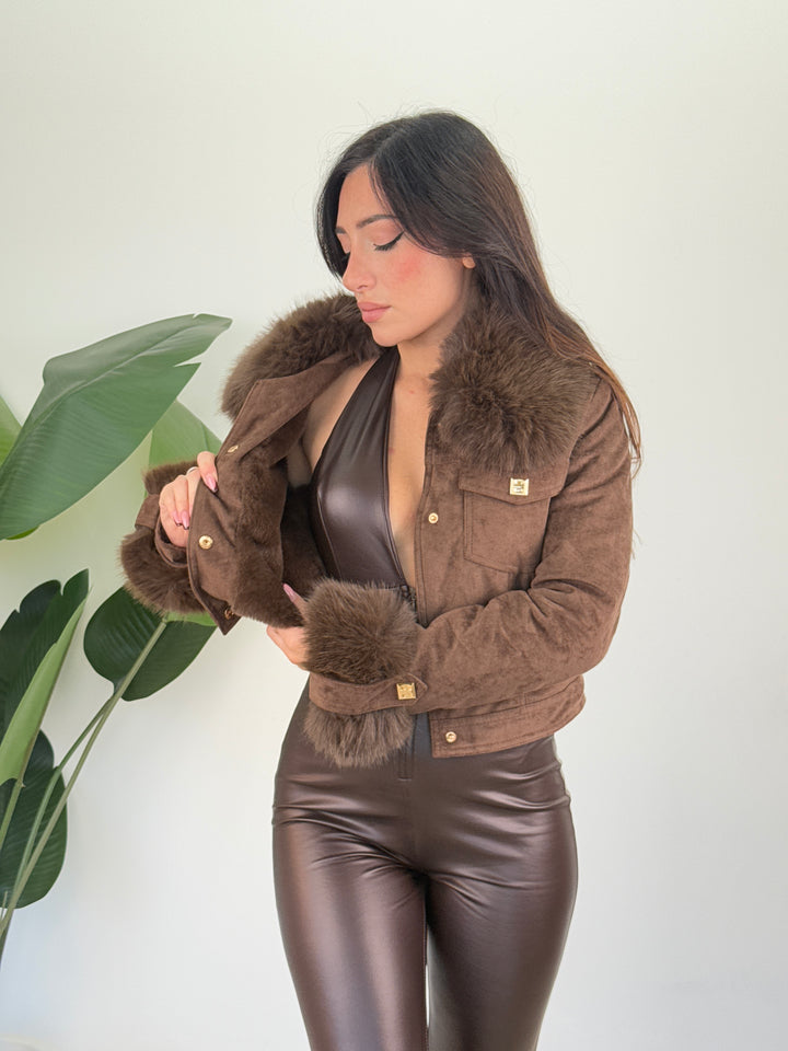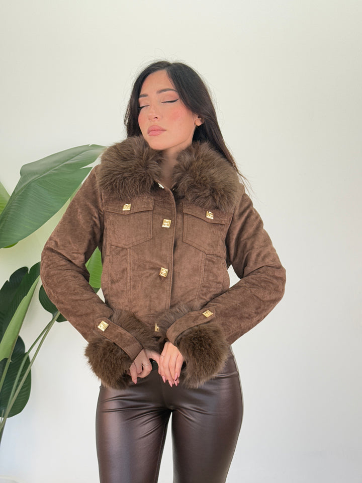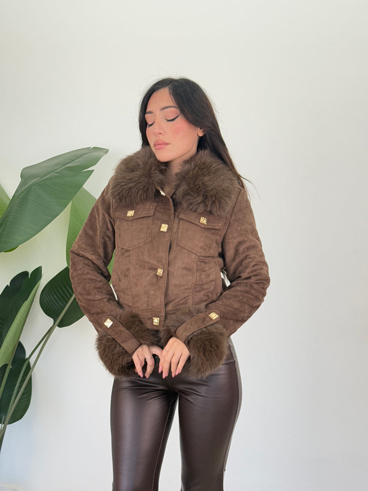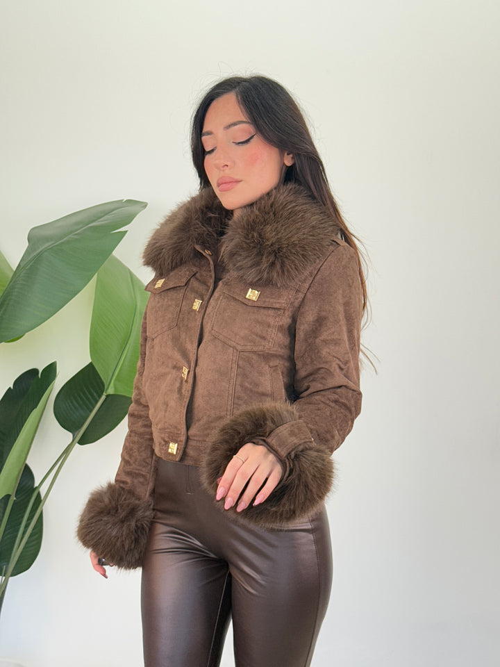 Giacca suede Bonel! Giacca scamosciata con colletto e polsini in morbida pelliccia, tasche frontali e chiusura a bottoni dorati. Perfetta per le giornate fresche, elegante, morbida e dal tocco raffinato.