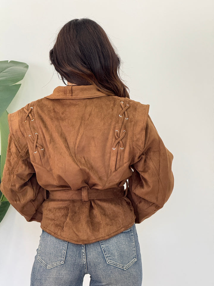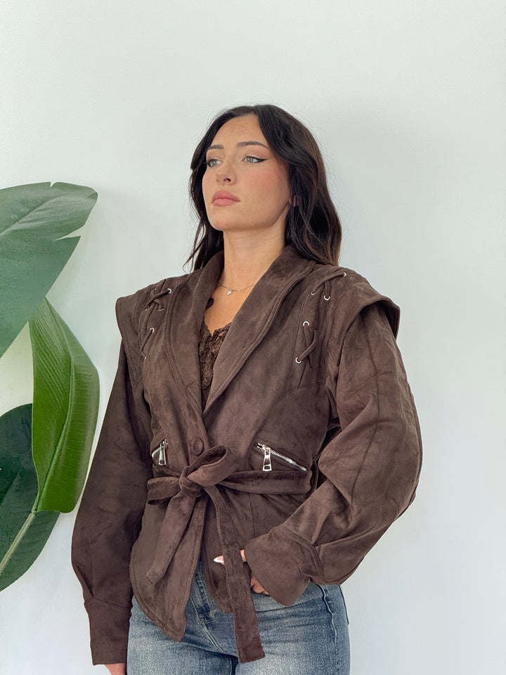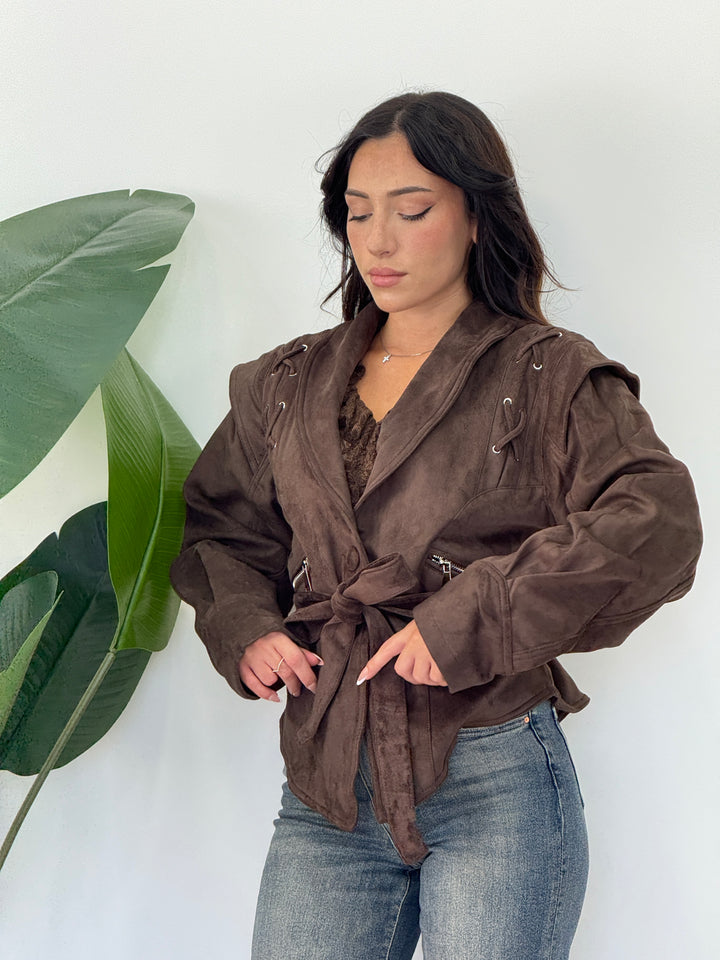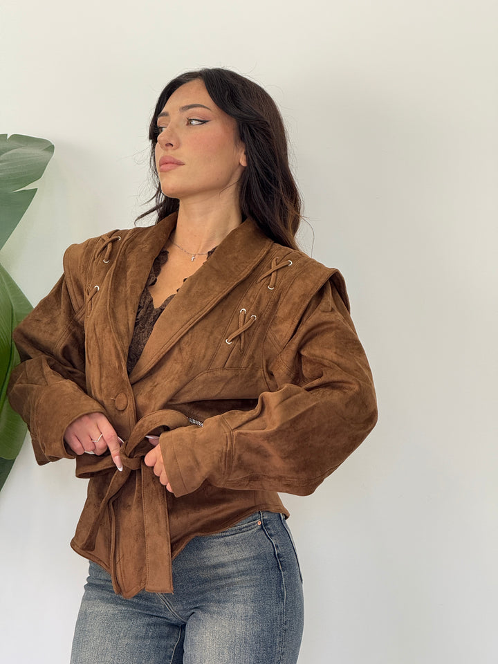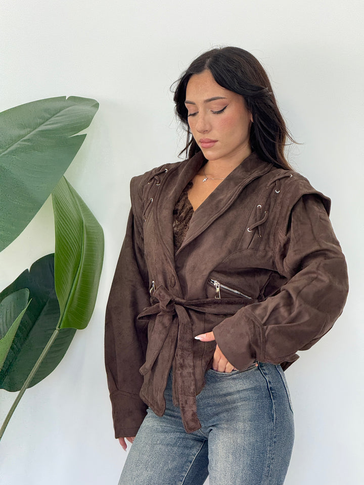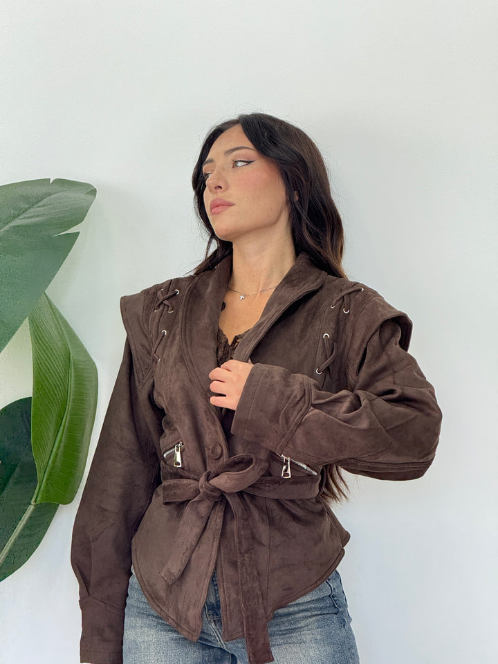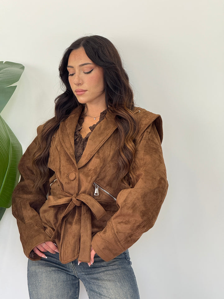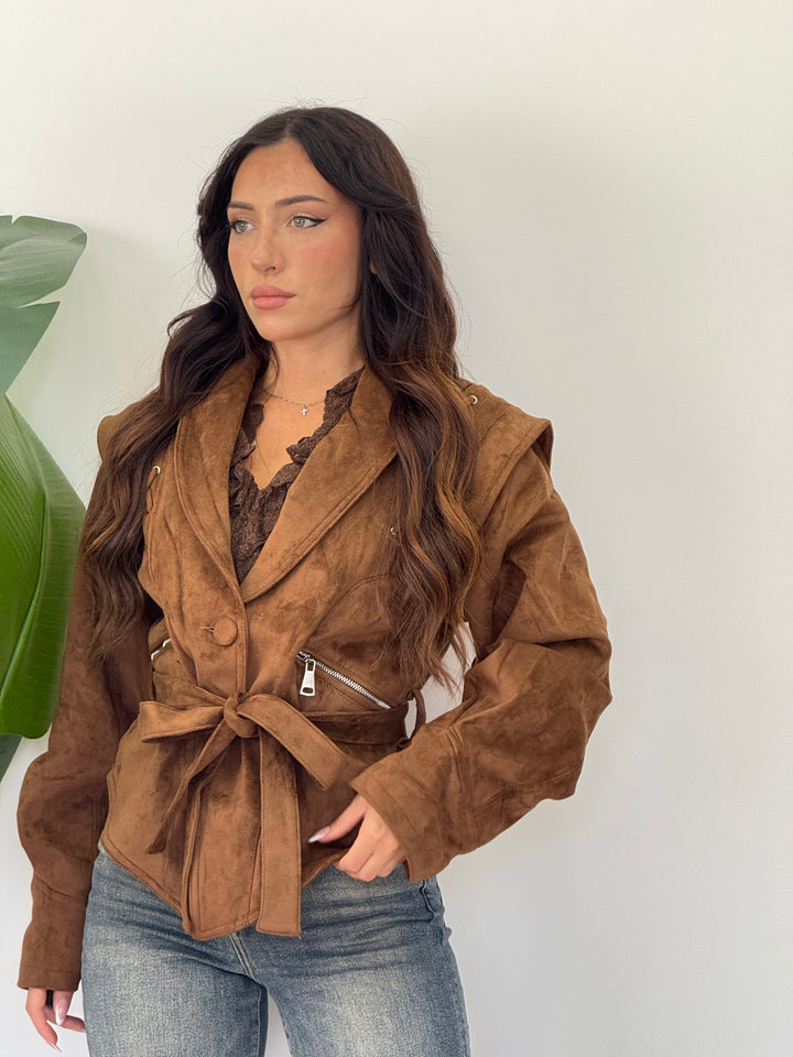 Giacca in suede effetto spalline voluminose, chiusura monopetto con bottone singolo, cintura in vita regolabile e removibile, foderato all’interno.