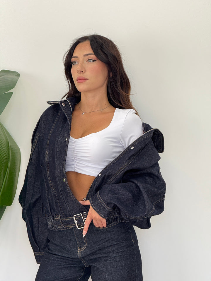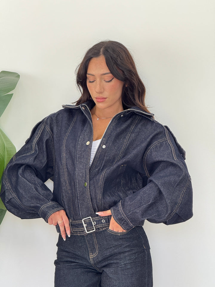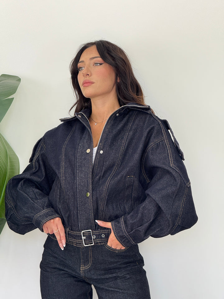 Bomber in denim imbottito ,chiusura con zip e bottoni ,manica a sbuffo ; elastico nella parte finale e fibbia regolabile.
