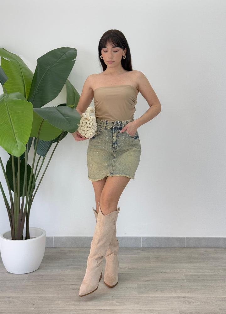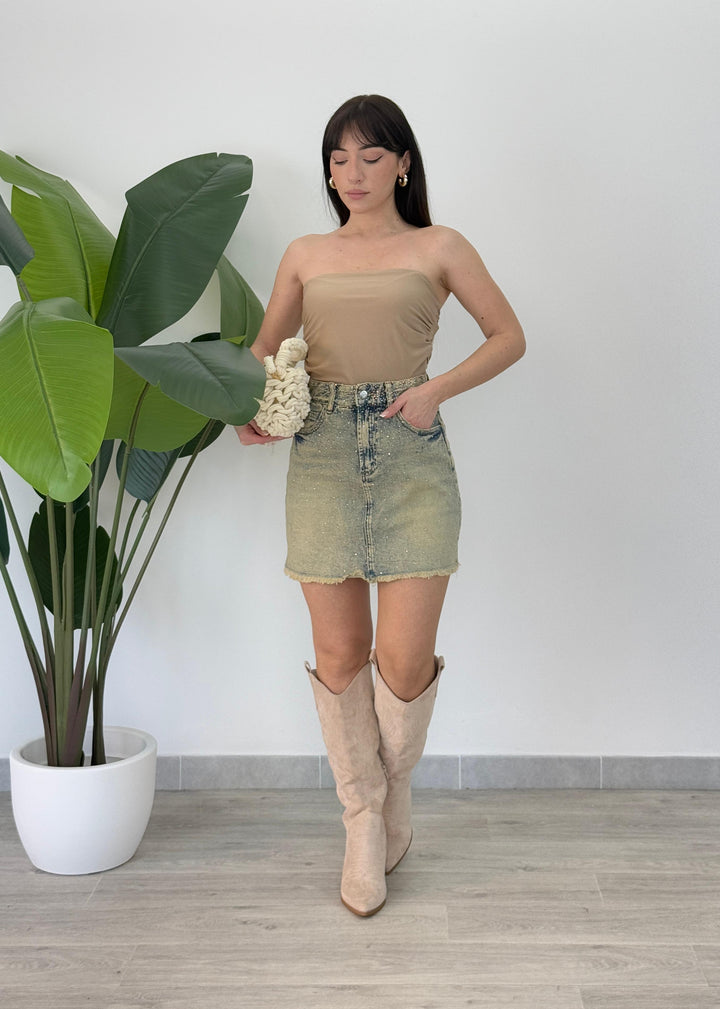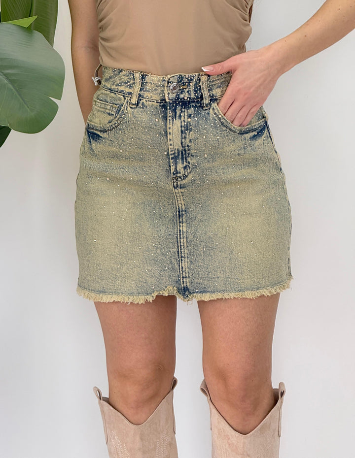 Scopri la gonna vintage Anya! Realizzata su denim di qualità in tela fissa, con punti luce. Presenta passanti per cintura, zip e bottone. Vestibilità regular. Perfetta per ogni tuo outfit!