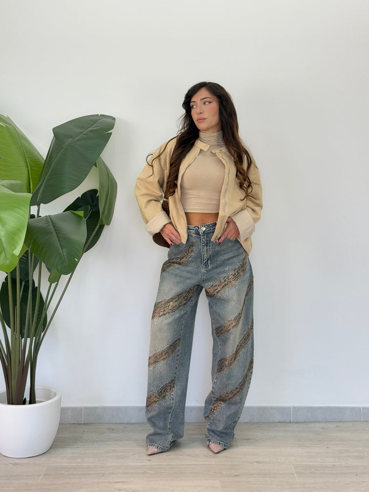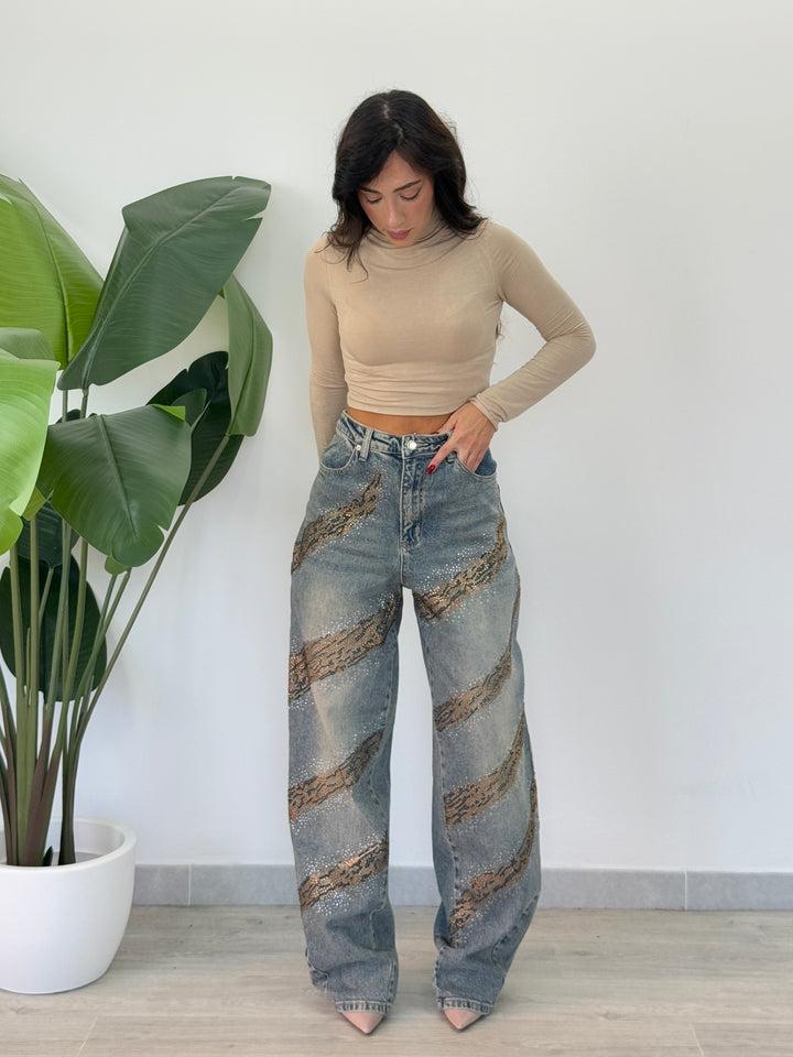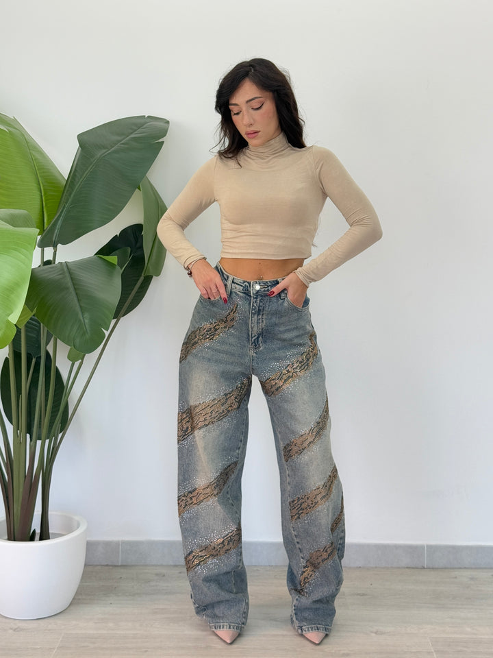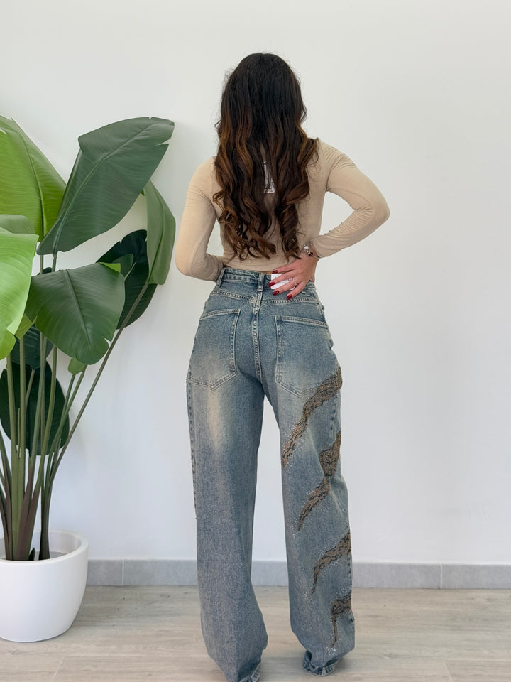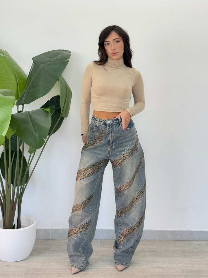 Jeans ballon con applicazione di punti luce colorati , Realizzato su tela semi elastica di qualitá con tasche e passanti per cintura, zip e bottone. Perfetto per qualsiasi outfit. Vestibilità regular.