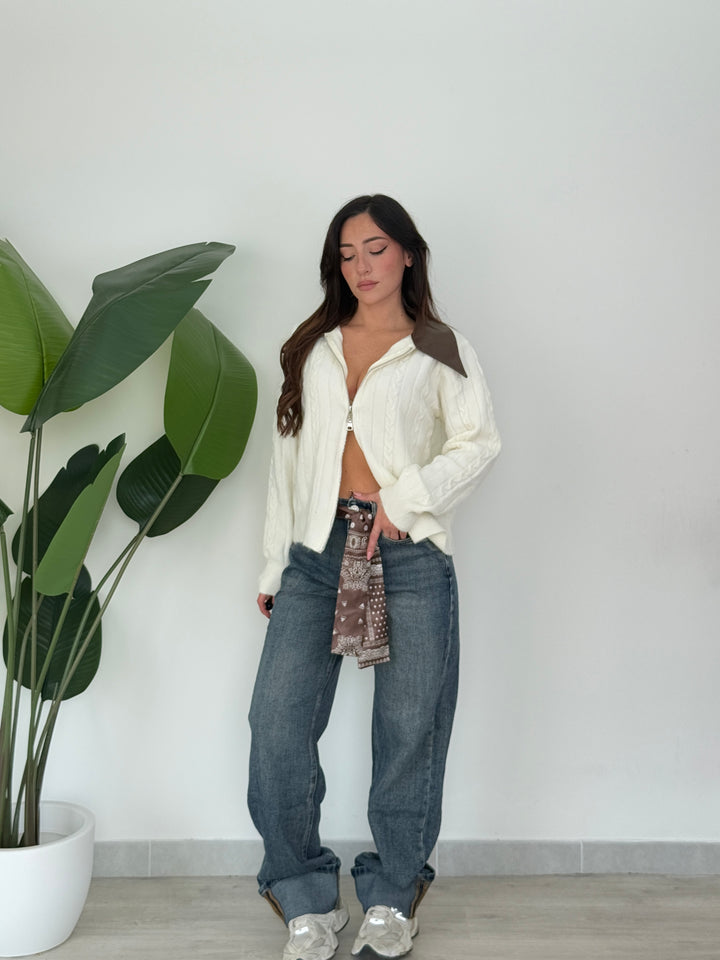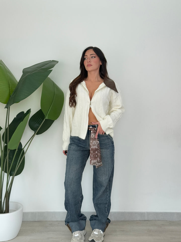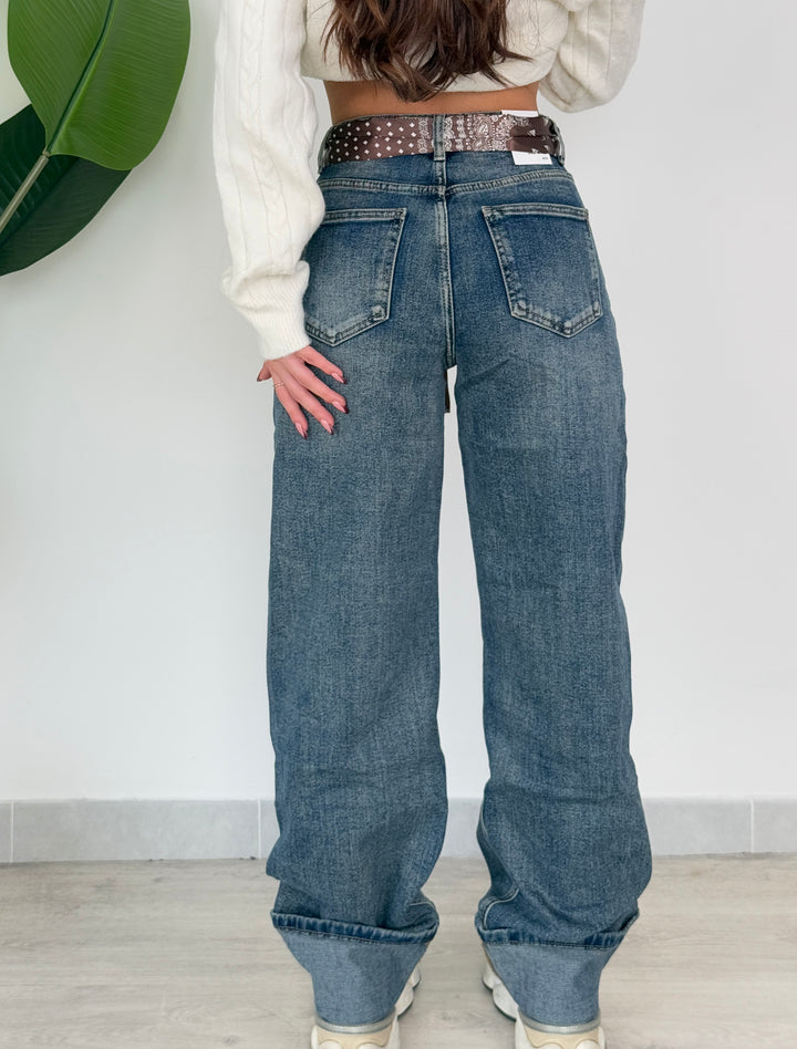 Jeans modello baggy con piegone con foulard incluso( rimovibile ). Realizzato su tela elastica di qualitá con tasche e passanti per cintura, zip e bottone. Perfetto per qualsiasi outfit. Vestibilità elasticizzata.