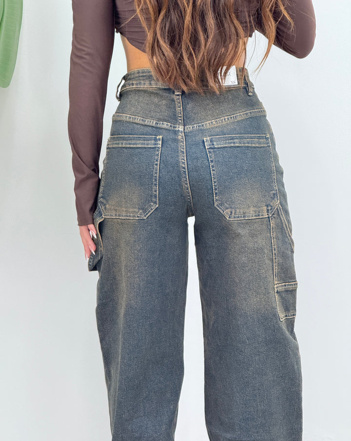 Jeans ballon chiusura asimmetrica lavaggio Denim scuro sabbiato , Realizzato su tela semi elastica di qualitá con tasche e passanti per cintura, zip e bottone. Perfetto per qualsiasi outfit. Vestibilità regular.