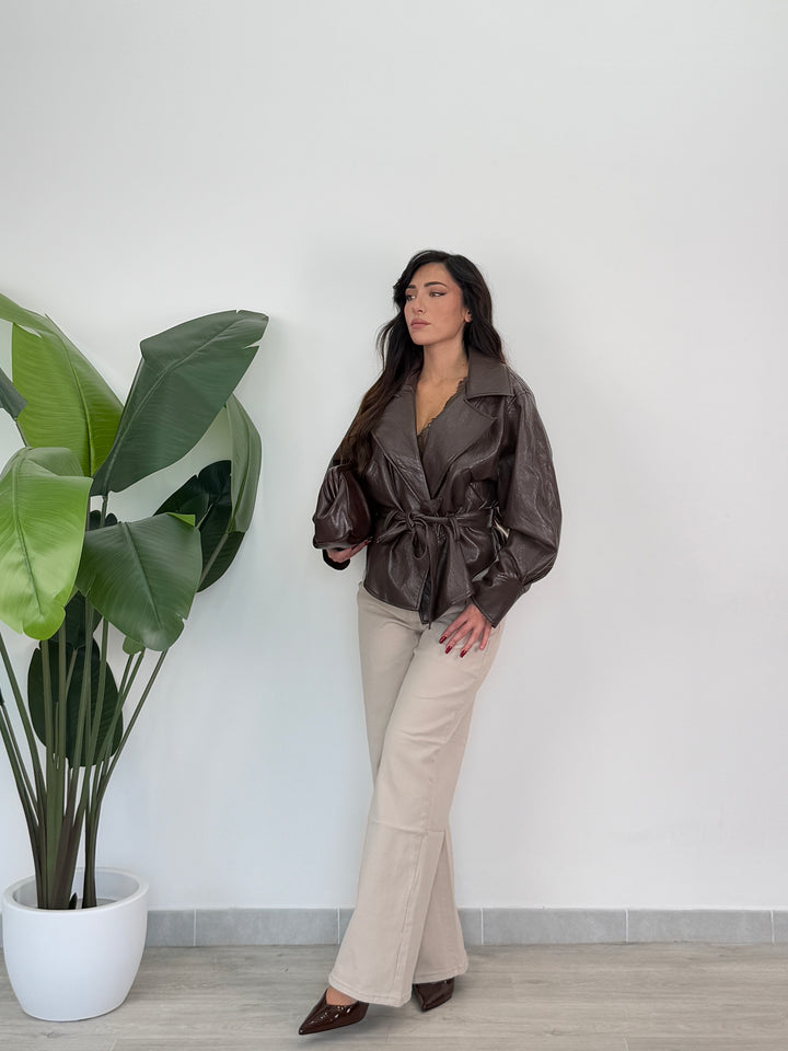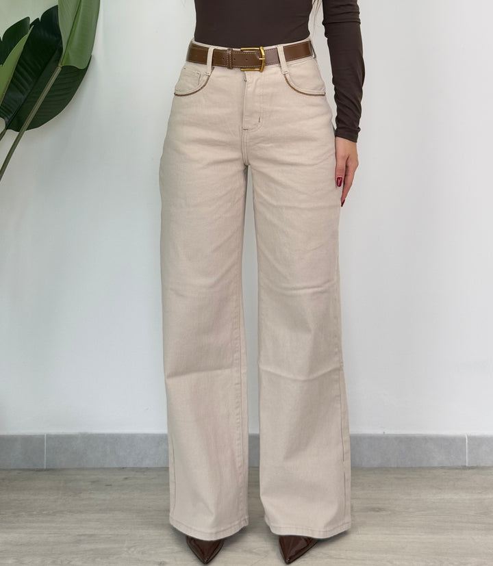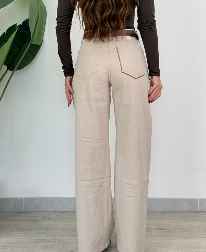 Jeans modello palazzo . Un jeans a palazzo colorazione del beige chiaro , realizzato su tela elasticizzata di qualità con tasche e passanti per cintura, zip e bottone. Perfetto per qualsiasi tipo di outfit. Vestibilità regular.